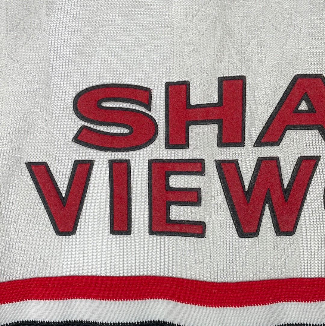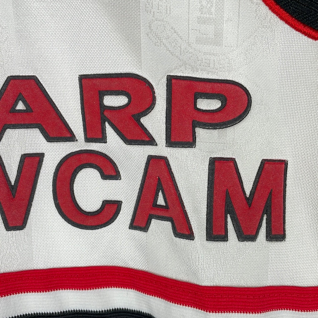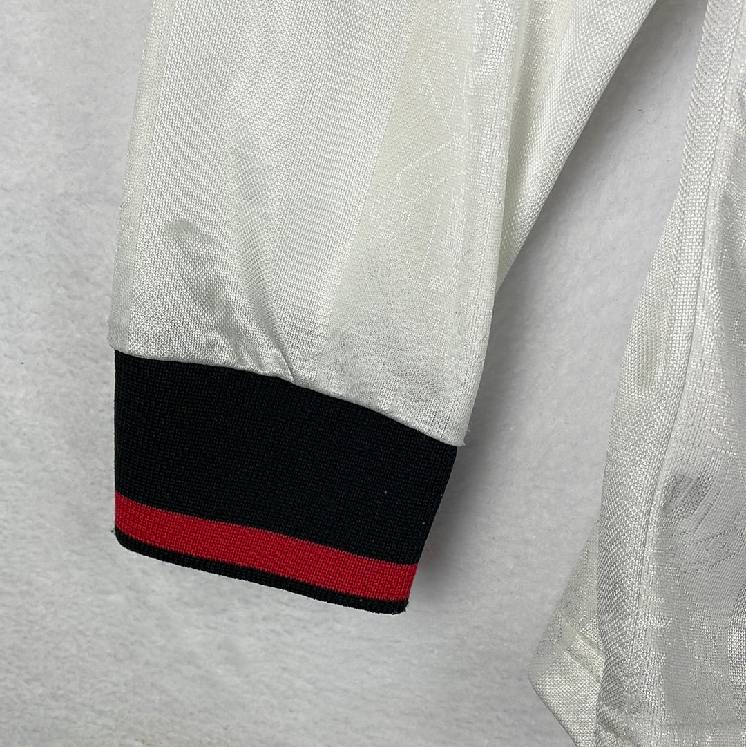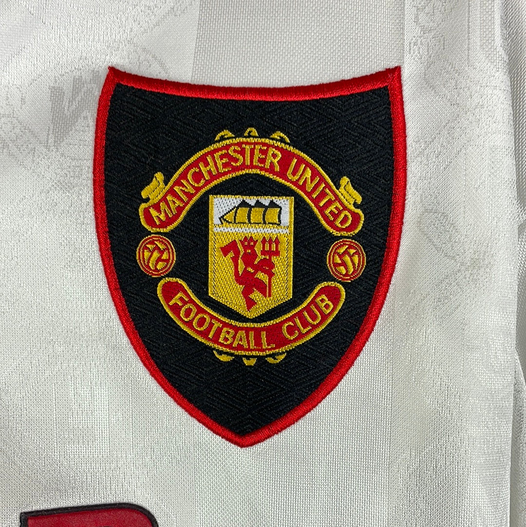 Shirt info: The white away shirt from the 1998-1999 season. This is the season where Manchester United won the treble. A rare long-sleeve version of this shirt.