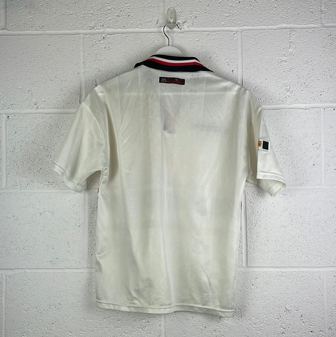 Info: This was the away shirt for Manchester United for the treble-winning 1998/1999 season. A nice white away shirt with red and black trim and front stripe.