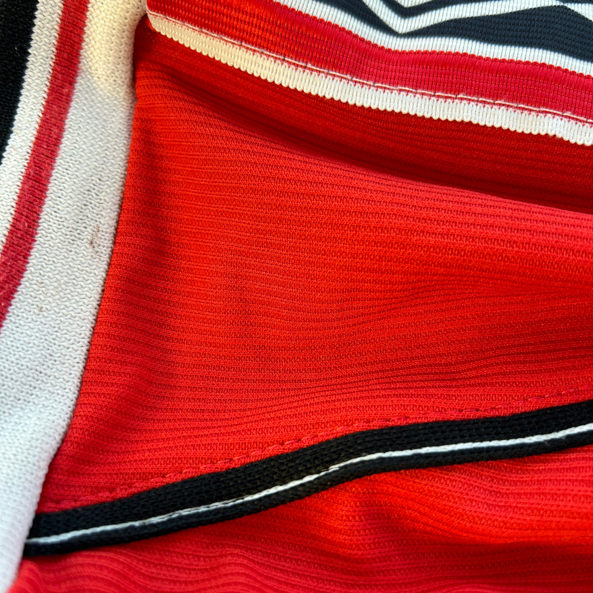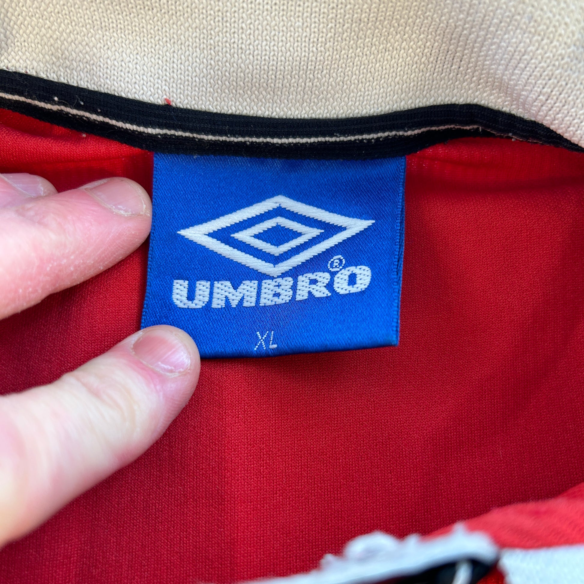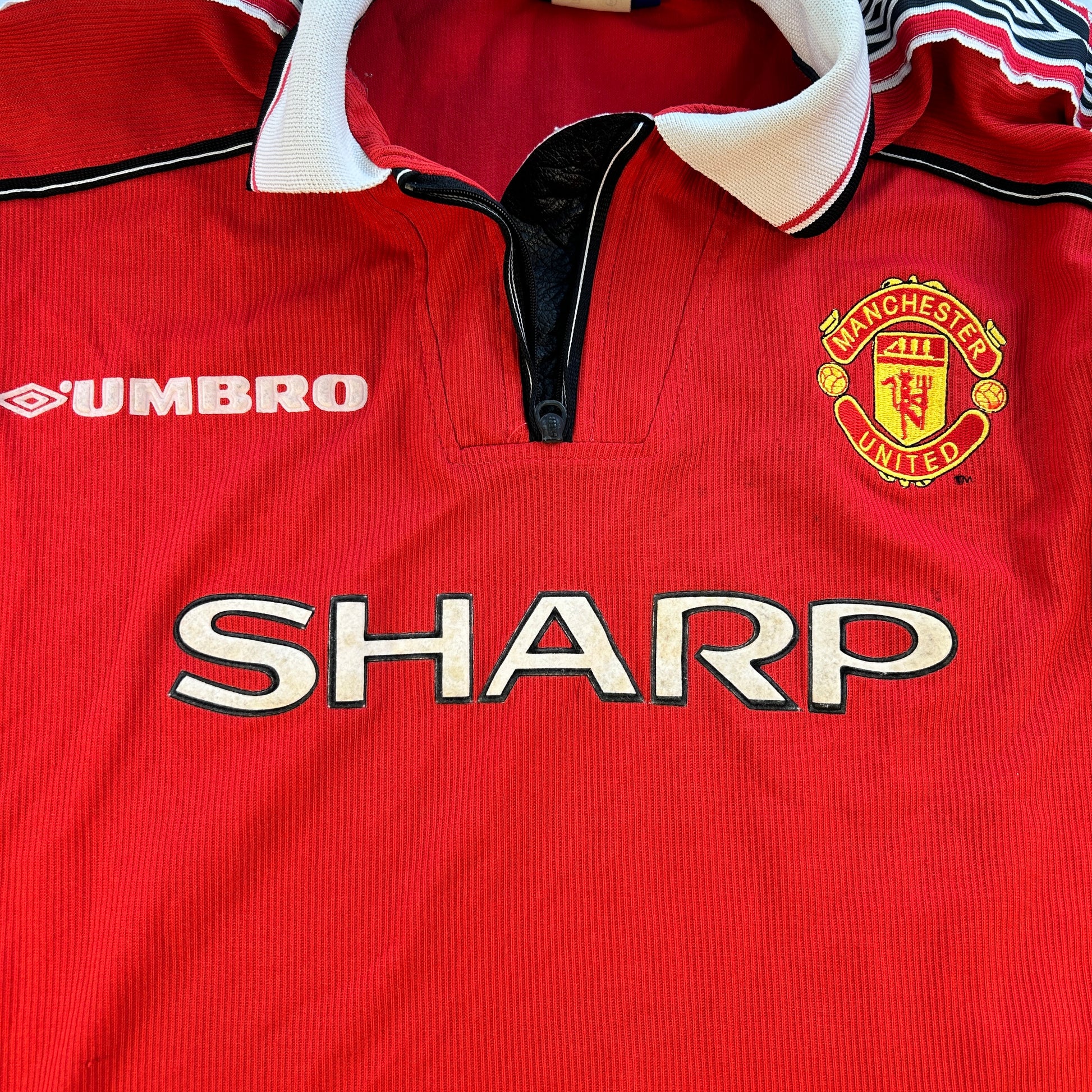 Shirt info: The black Umbro logo sleeves set this shirt apart from others. It is a highly memorable United shirt and is very popular among United fans and collectors. It was the home shirt for the 1998/1999 season where Manchester United won the treble.