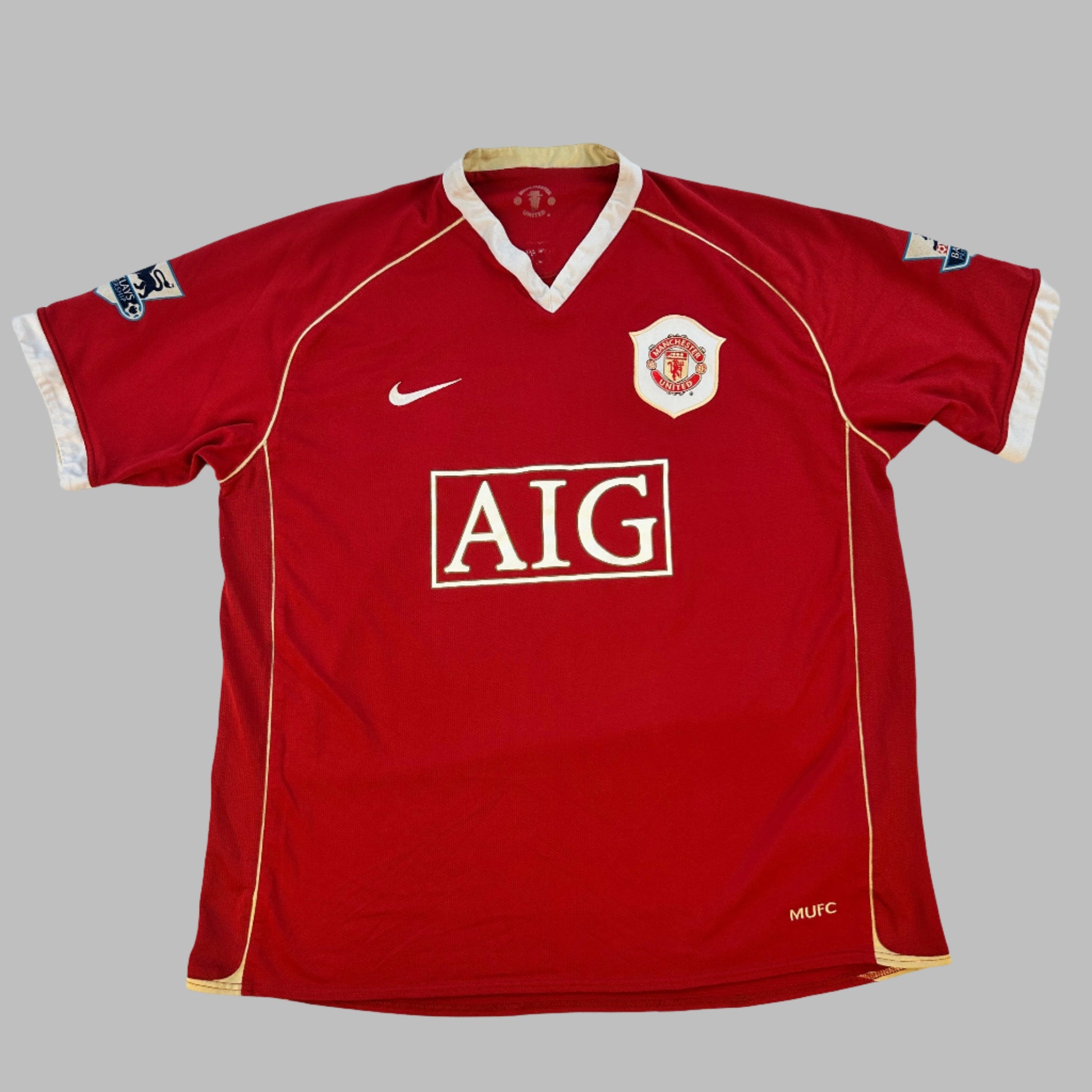 Shirt info: This was only used as the home shirt for 1 season in 2006-2007. The red home shirt has a white collar and gold detailing throughout. The AIG point on the front is white with gold trim. This was the first season of the AIG sponsorship.