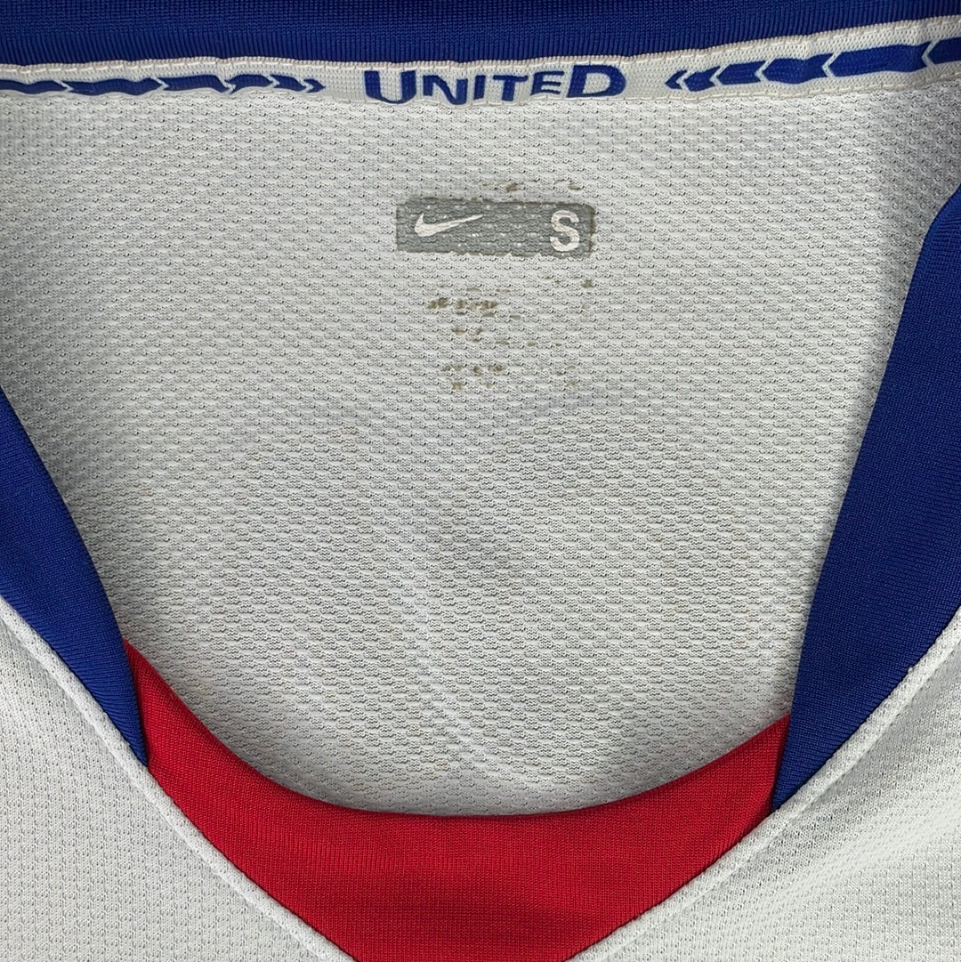 Shirt info: A good condition white away shirt with Rooney 10 name set. This was the Manchester United away shirt in the 2008/2009 season. The print is a felt Lextra style print and has some fluff, as always.