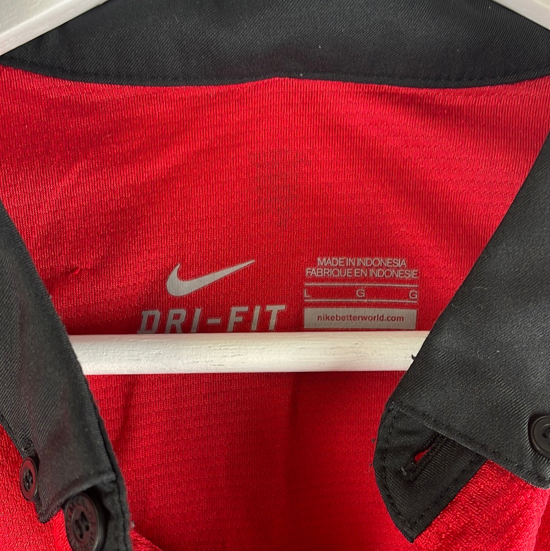 The Manchester United home shirt in the 2013/2014 season. A red home shirt with a distinctive black button-down collar
