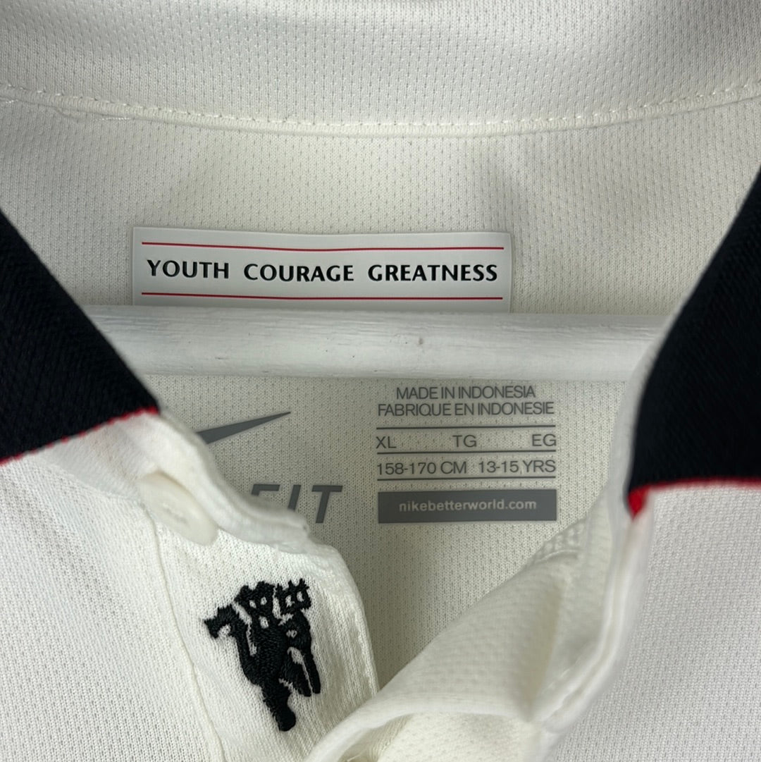 Authenticity Check Notes: Nike inside wash label 611041-106 is correct for the 2014/2015 Manchester United youth away shirt.