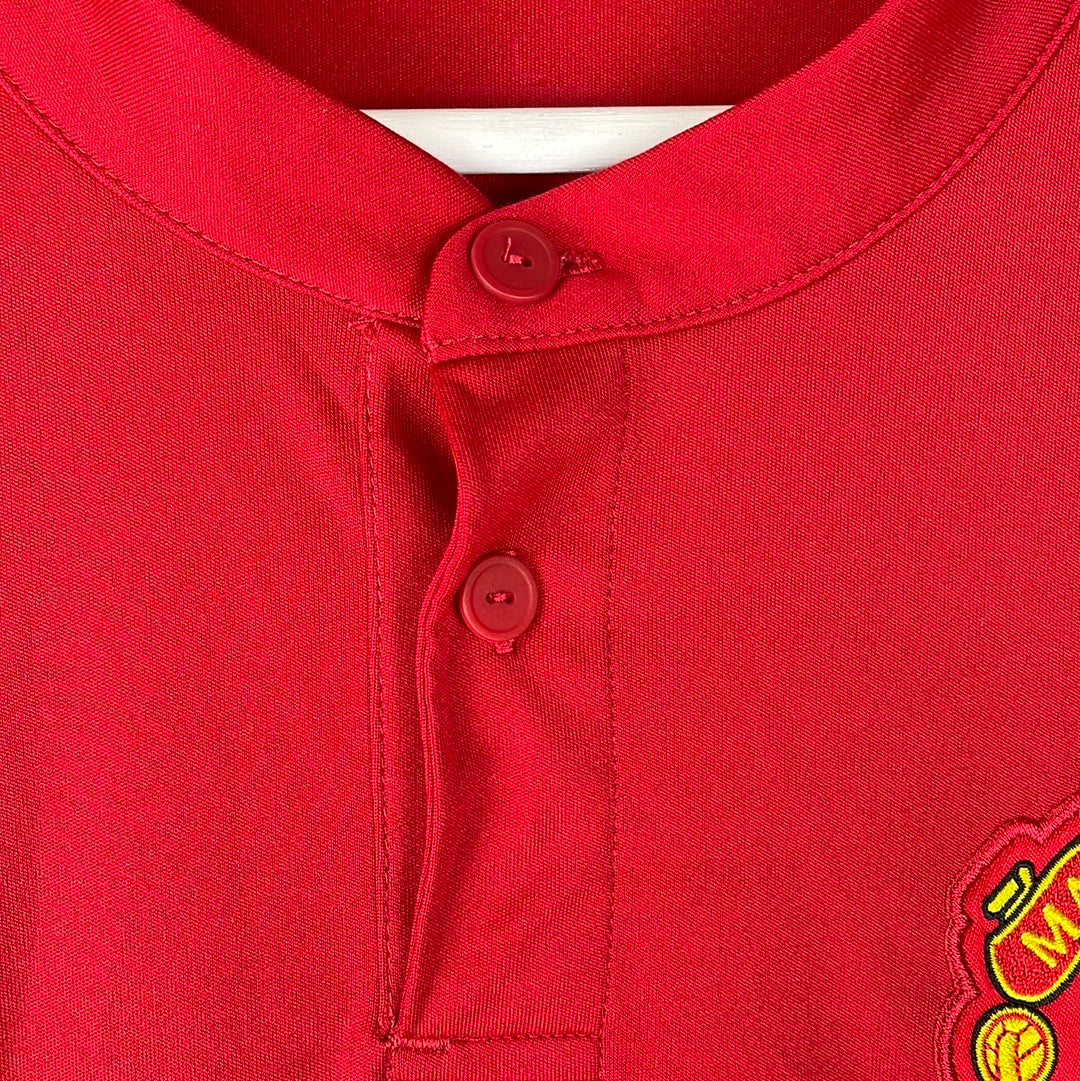 A plain red United shirt with a grandad-style collar. This was the home shirt in the 2017/2018 season.