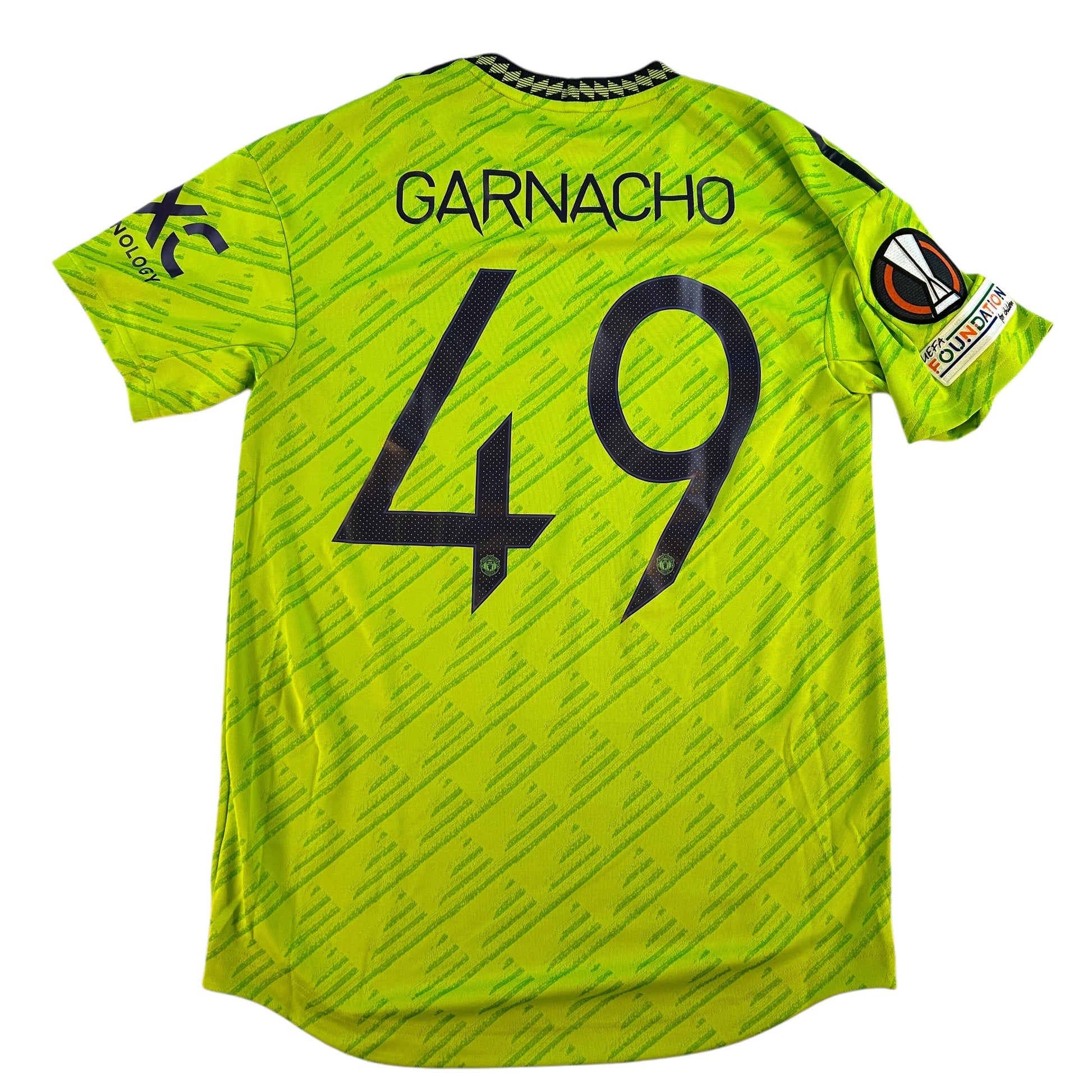 Shirt info: An authentic player-issue third shirt for Garnacho at Manchester United. It has the cup font print. The shirt has a different feel to the material than the standard shirt. It has a printed Manchester United badge and Adidas logo. It is sized 5 inside the neck. The DXC logo is printed higher up the sleeve than on the replica shirts.