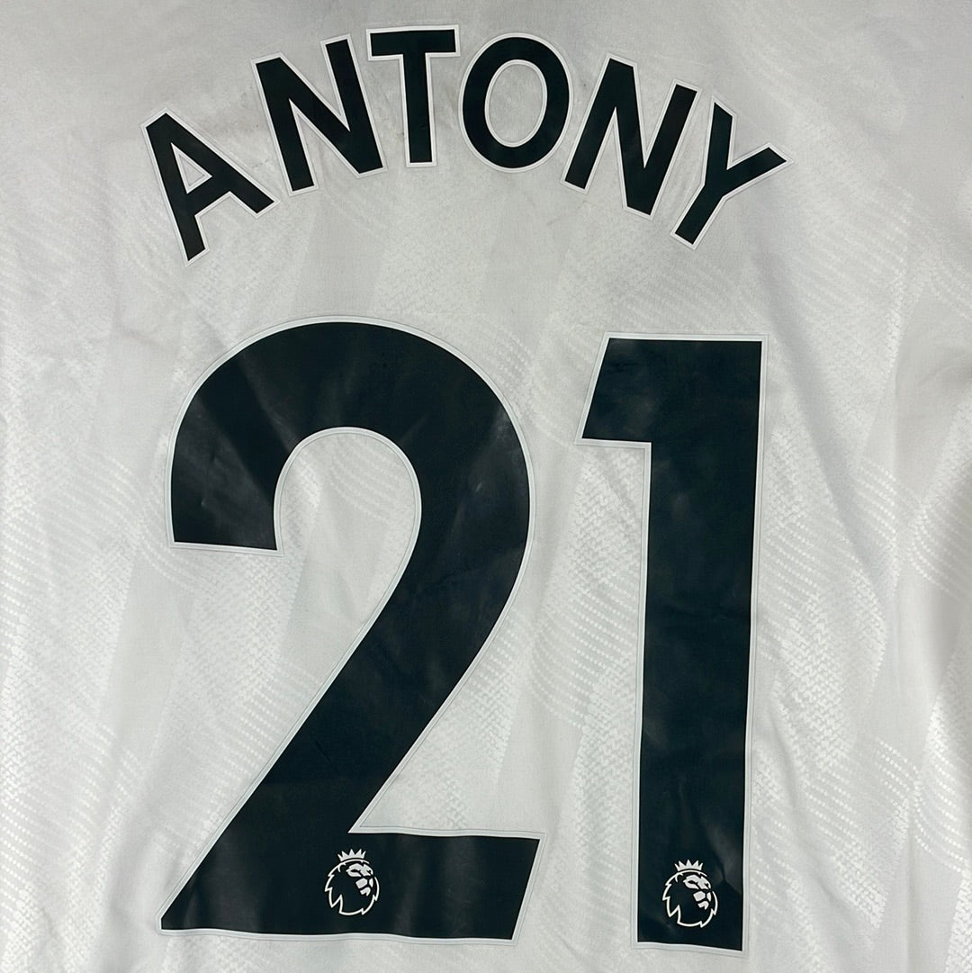 The 2022/2023 away shirt for Manchester United. Antony 21 Premier League print on all shirts listed.