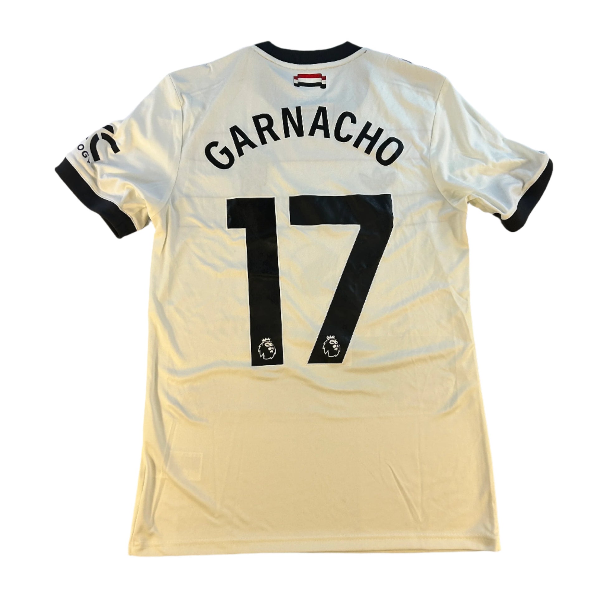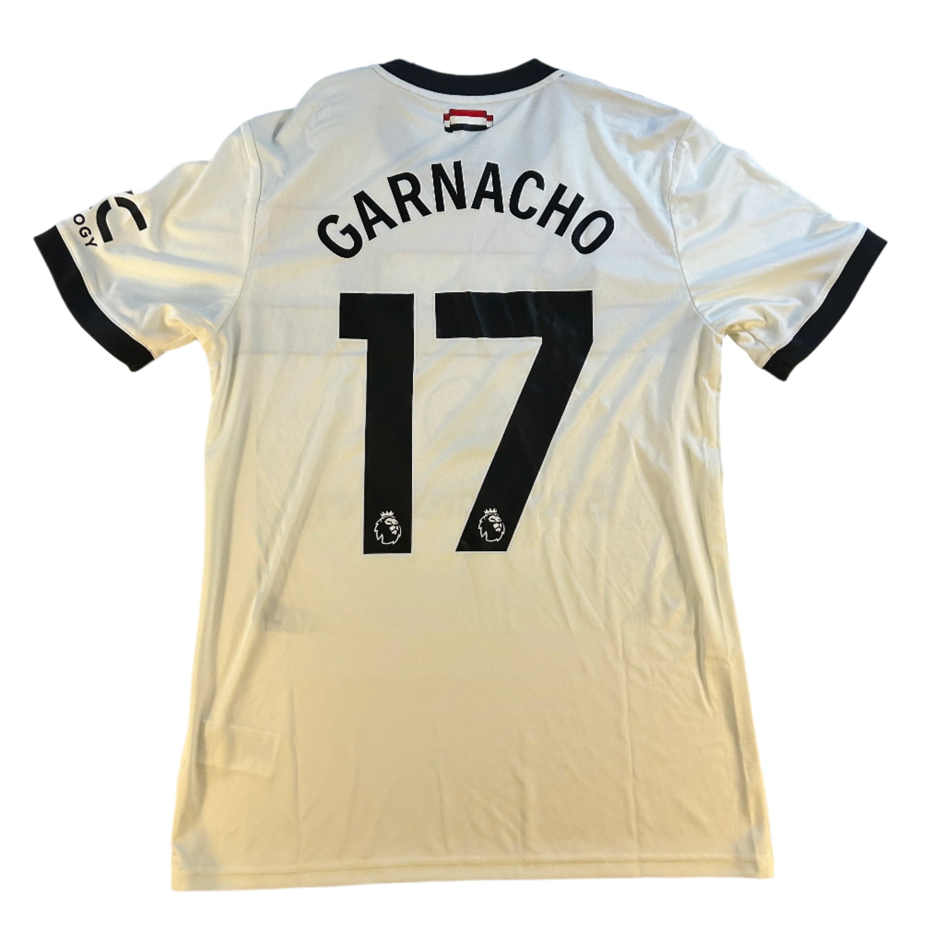 The Manchester United third shirt in the 2024/2025 season. The shirt is mainly white with a red and black stripe and is a great shirt for United.