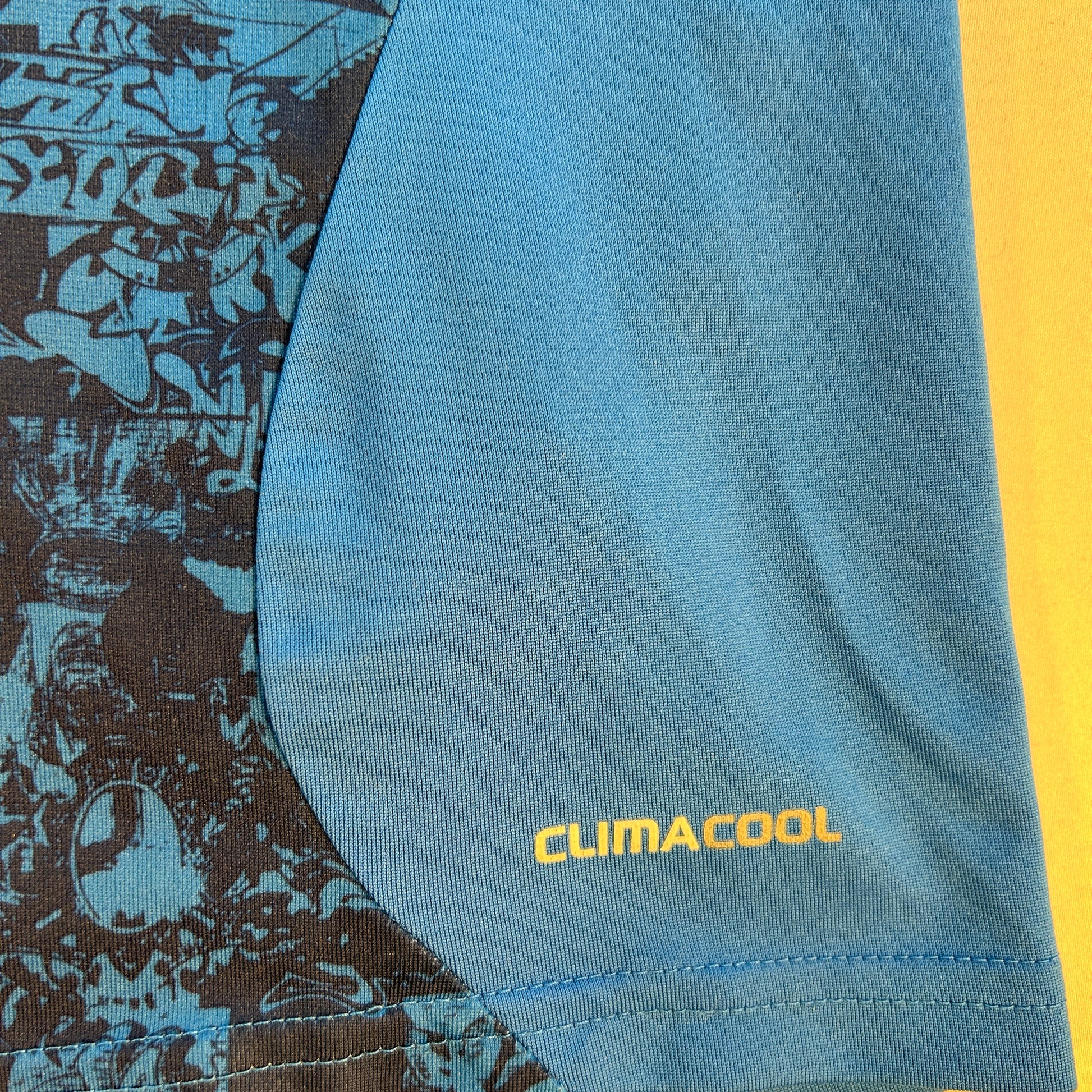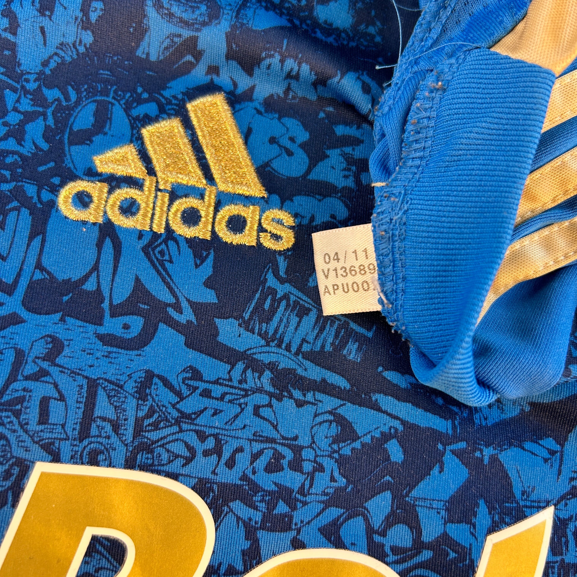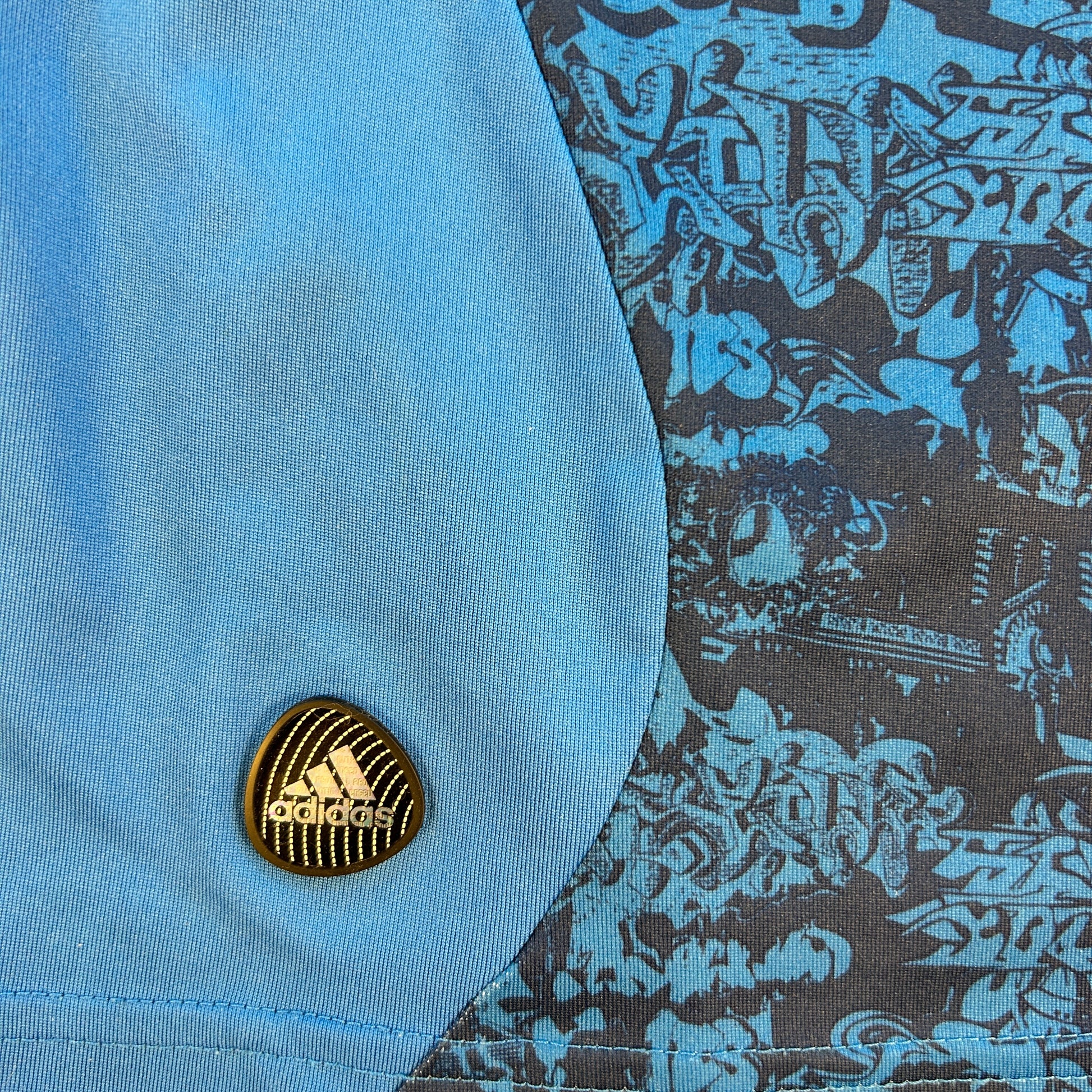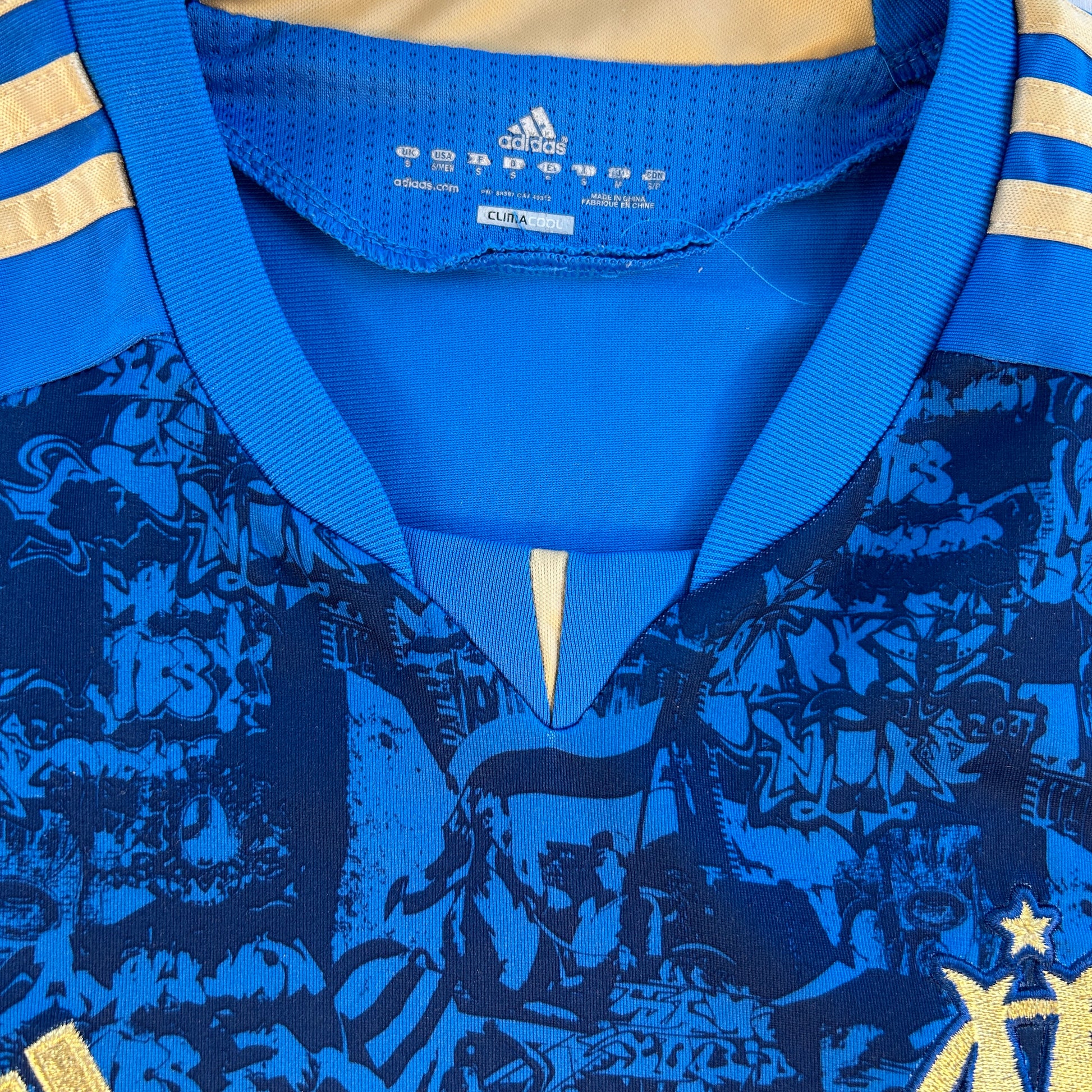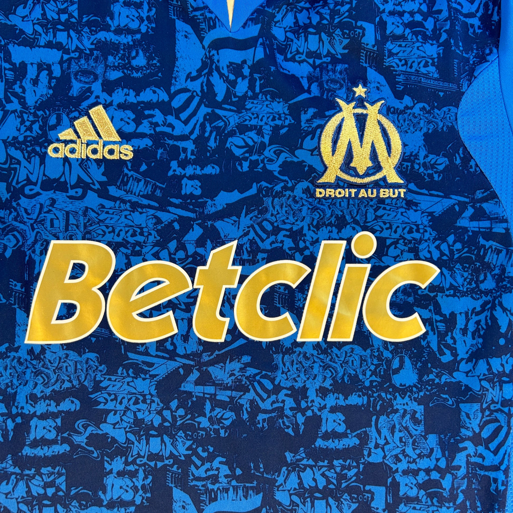 Shirt info: A stunning MArseille shirt with a blue patterned design and gold detailing. The Adidas logo, Marseille badge, Betclic sponsor and Adidas stripes are are gold.