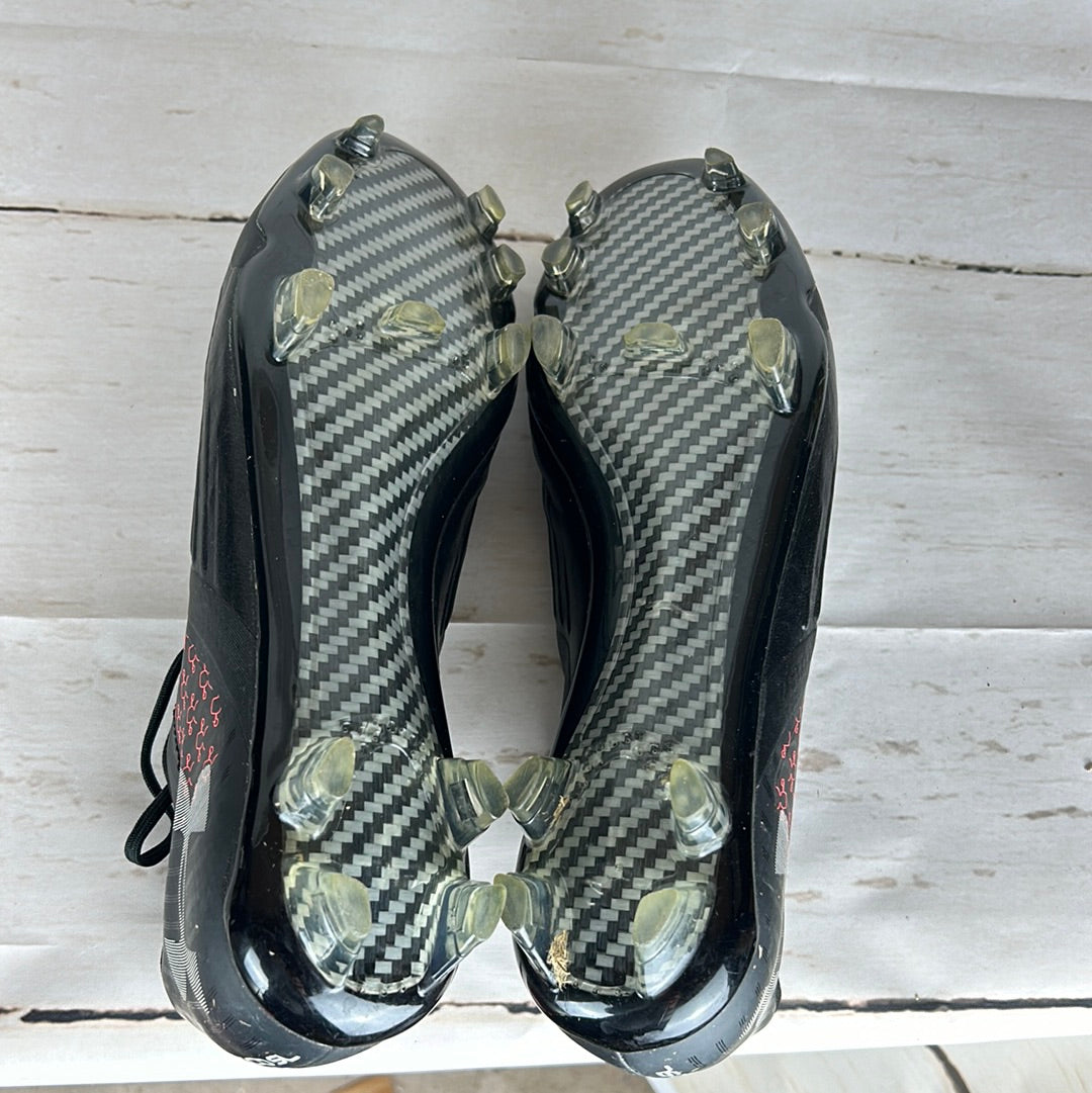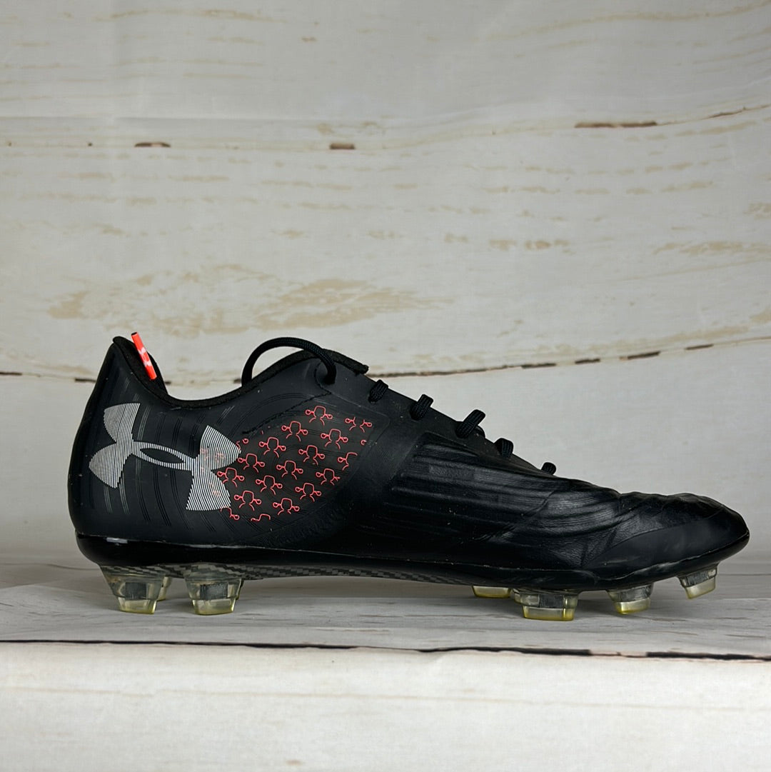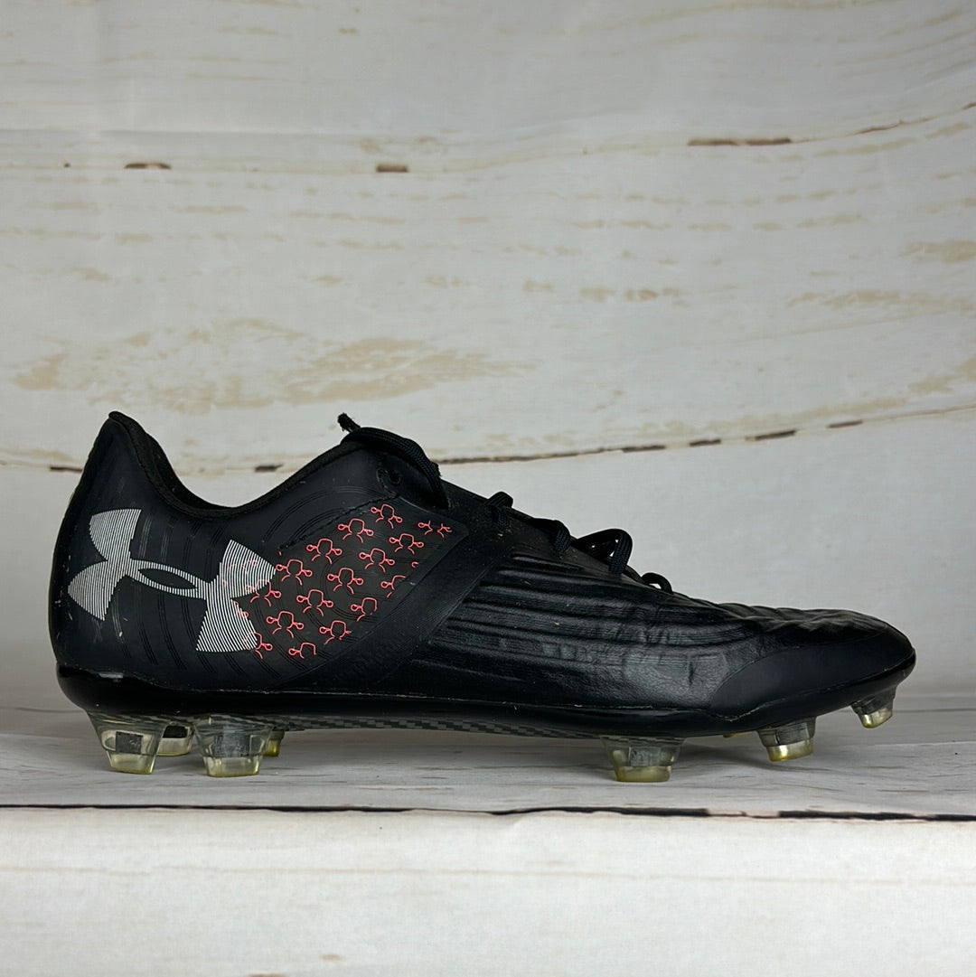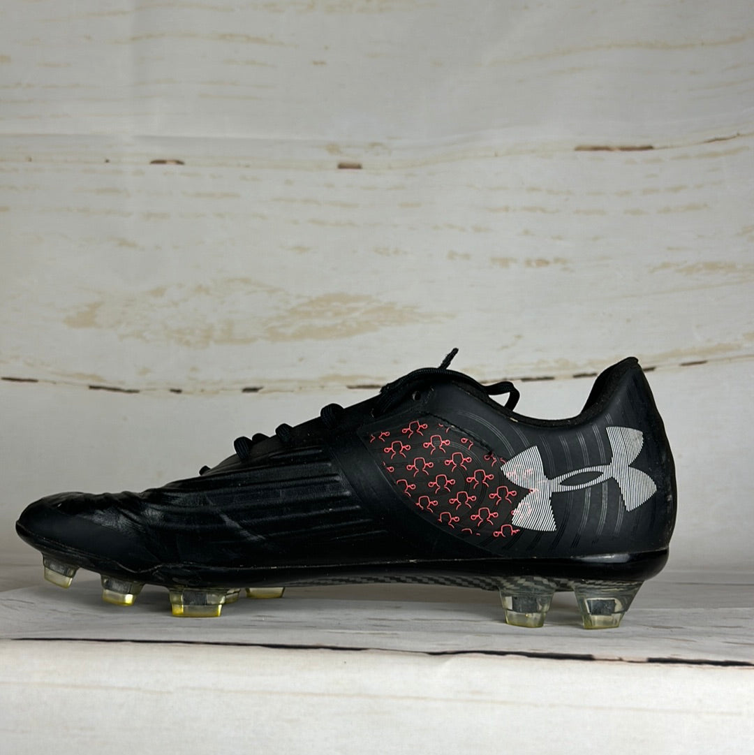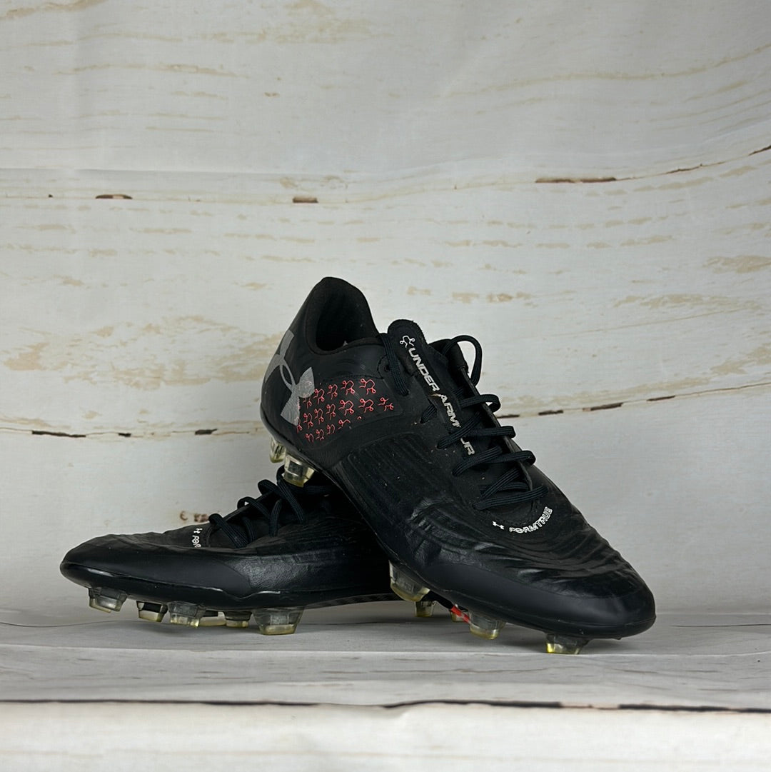 A pair of customised black Under Armour football boots worn by Memphis Depay. They are black boots with Depay's head logo on repeated patterns on both the inside and outside of the boots.