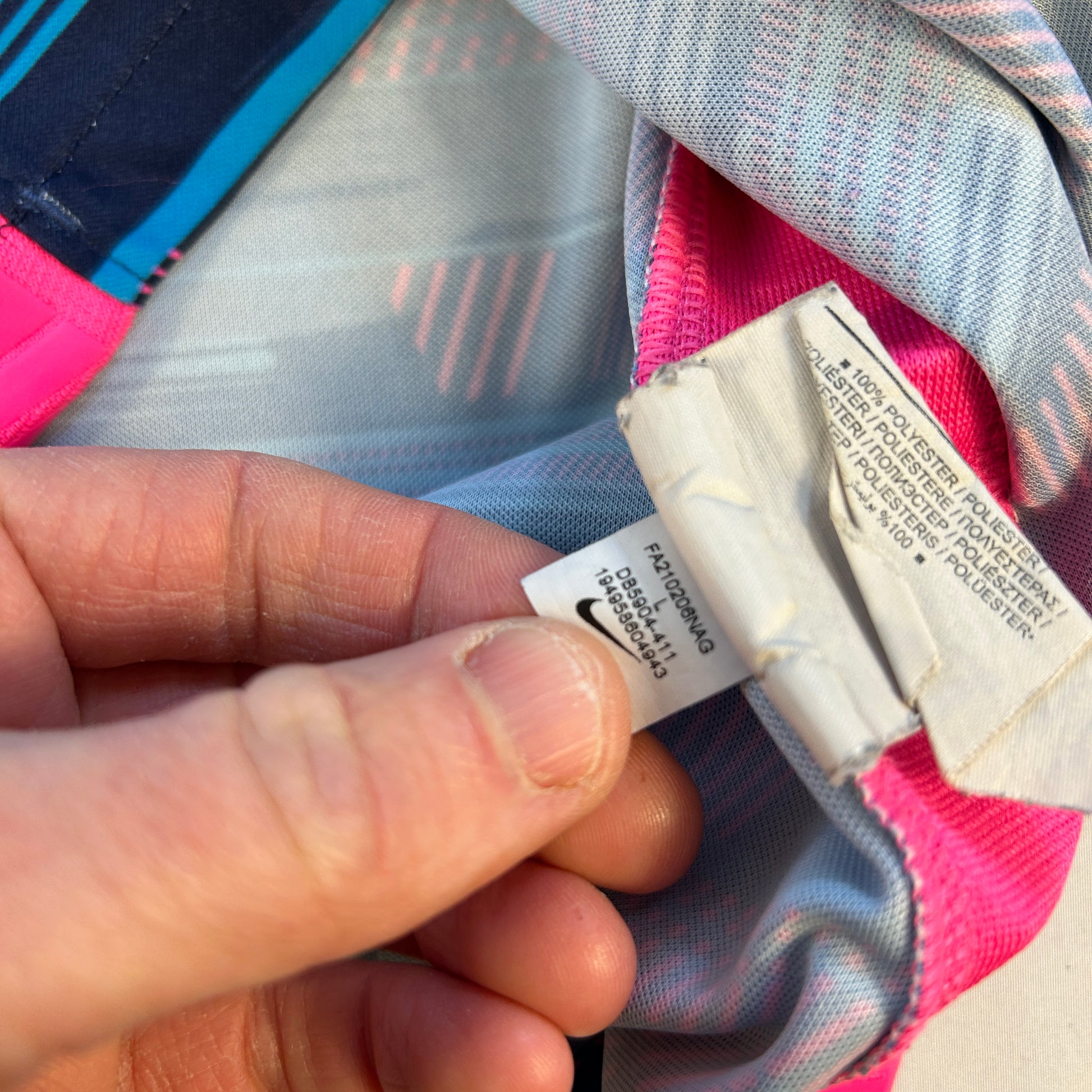 Shirt info: A funky RB Leipzig shirt from the 21/22 season. This is a very bold design with blues and pinks set on a darker blue background. The pattern continues on the lower back. On the upper back, there is a plain panel for the player's name and numebr. The front has the standard Red Bull sponosrhip as you would expect.
