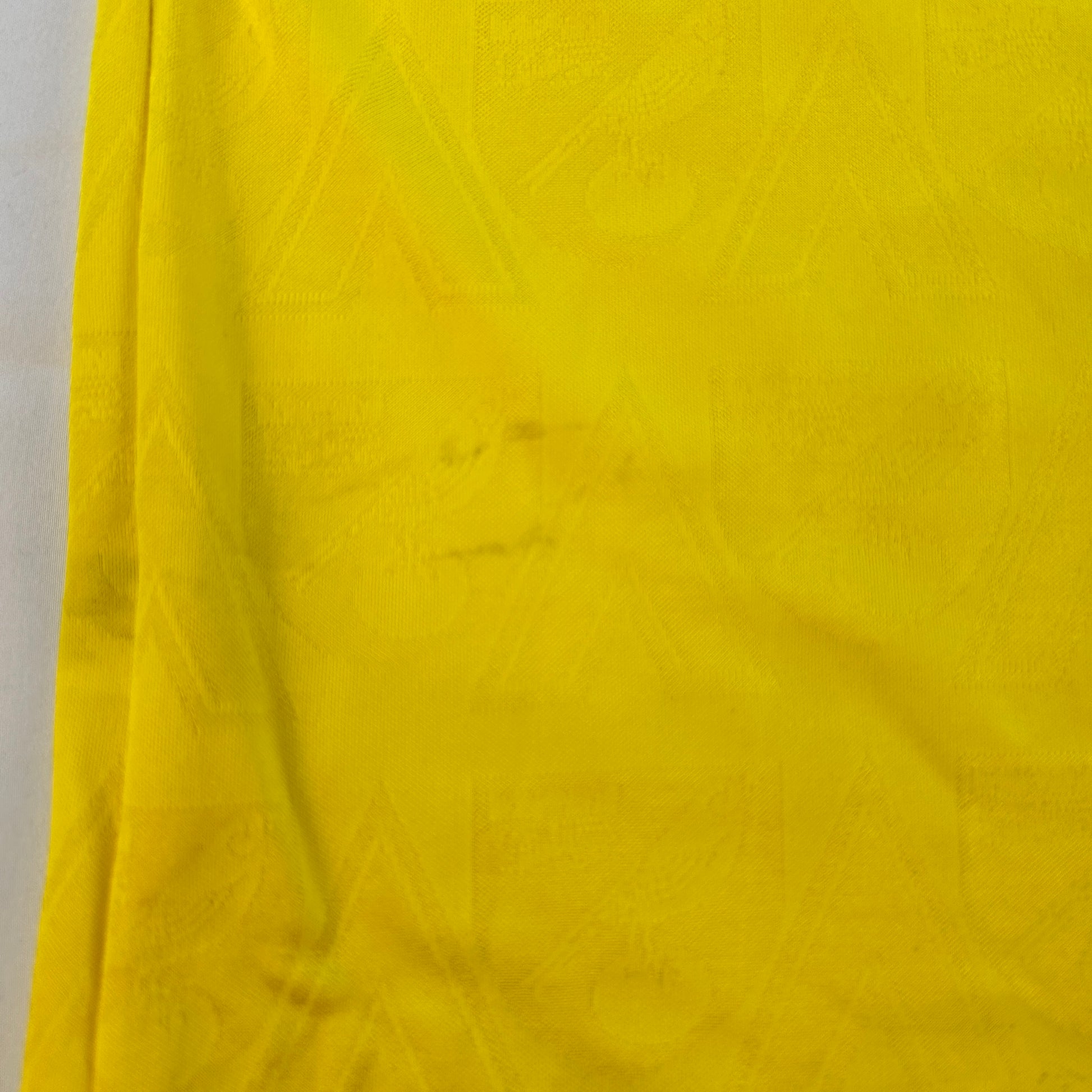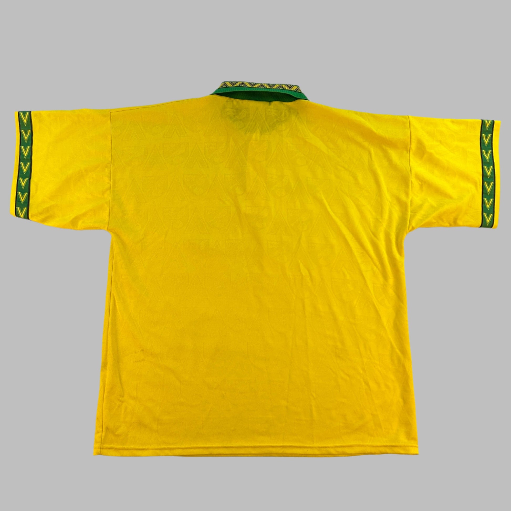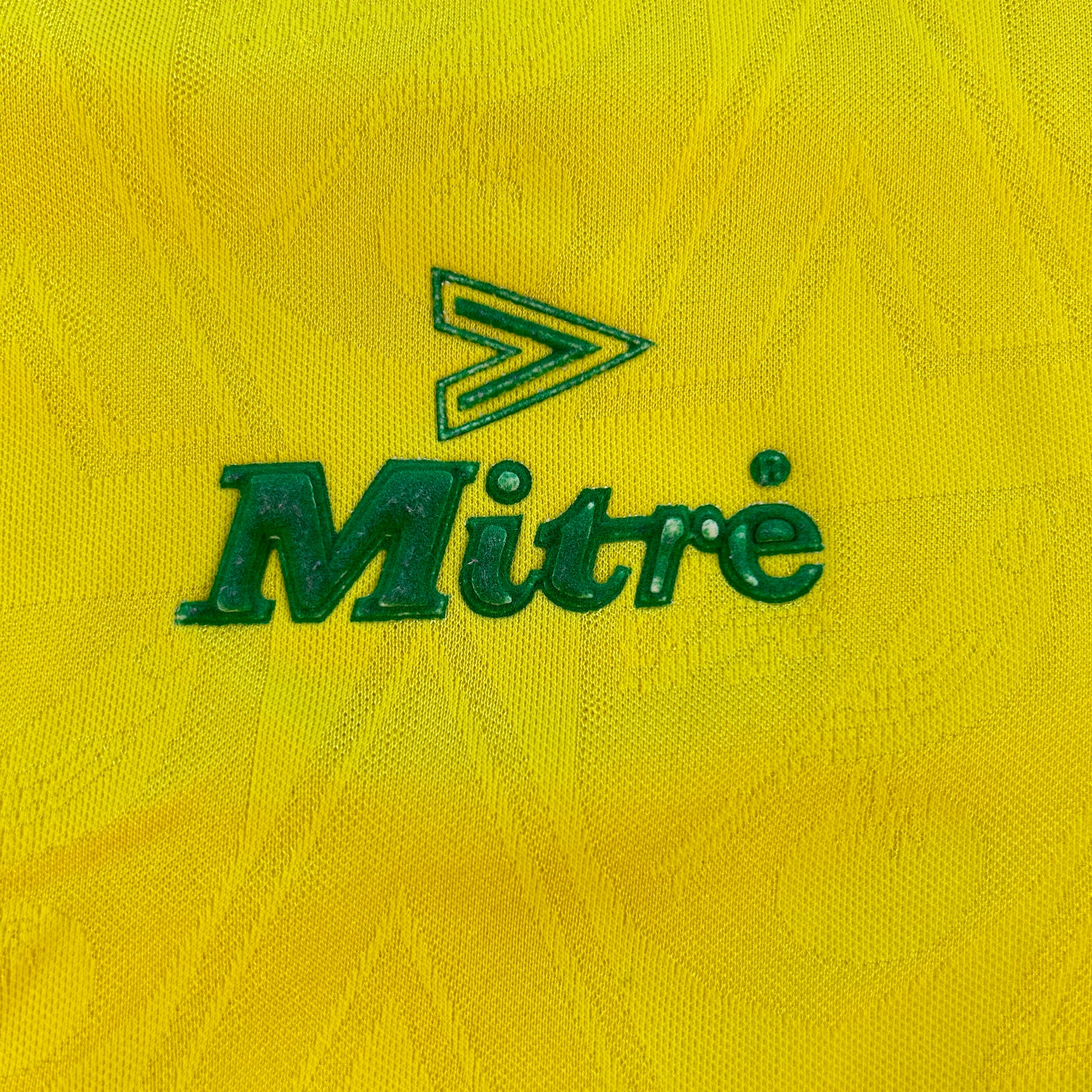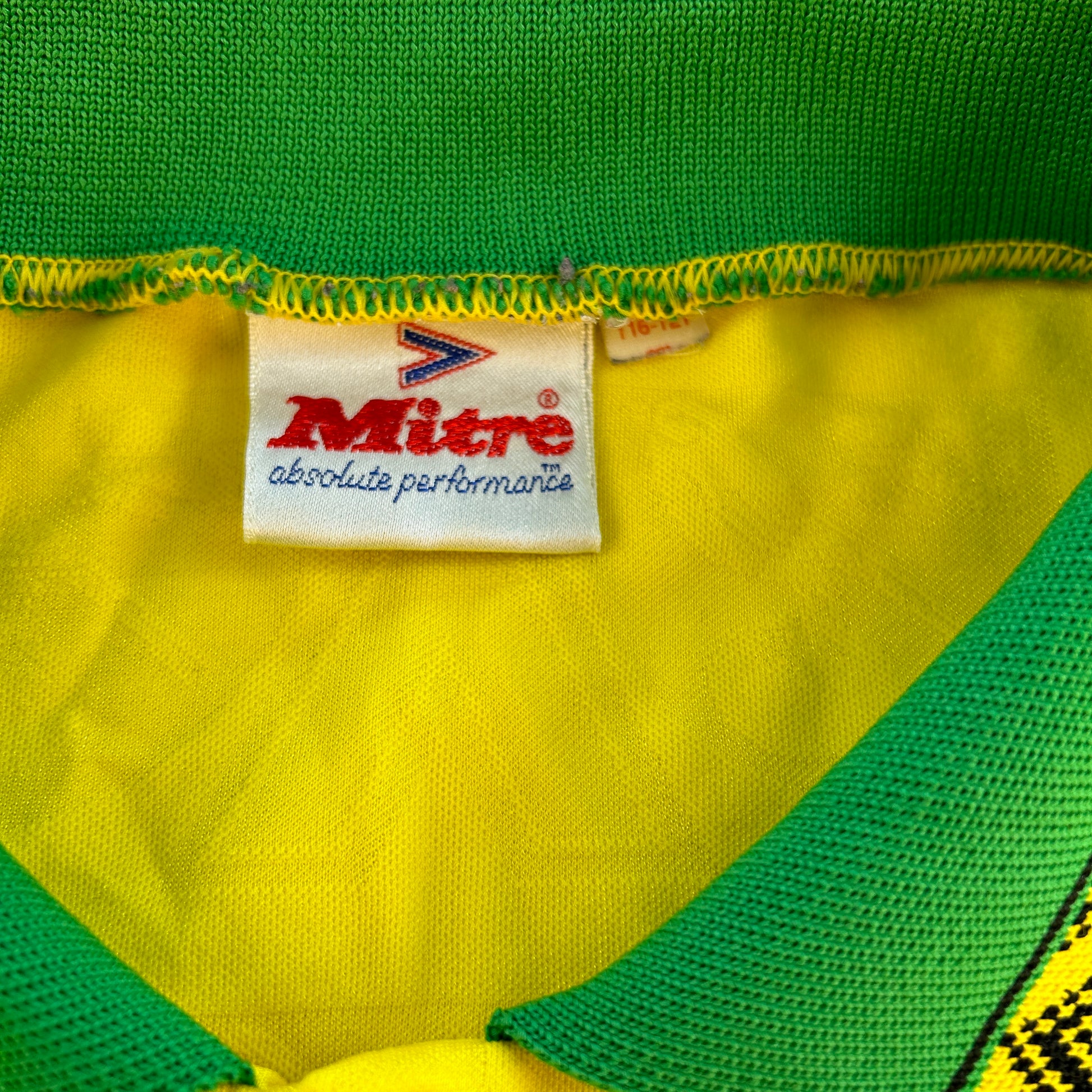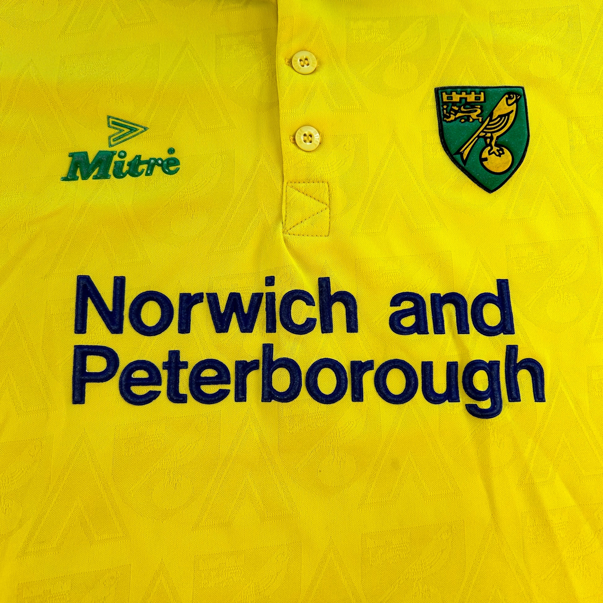 Shirt info: The yellow and green home shirt worn by Norwich City during the 1994-1995 and 1995-1996 seasons. The collared football shirt features; a raised felt Norwich City badge, Mitre logo, and 'Peterborough and Norwich' sponsor. This is a classic Norwich City home shirt from the mid-90s. The material has a detailed pattern running through it on closer inspection giving this shirt a nice finish.