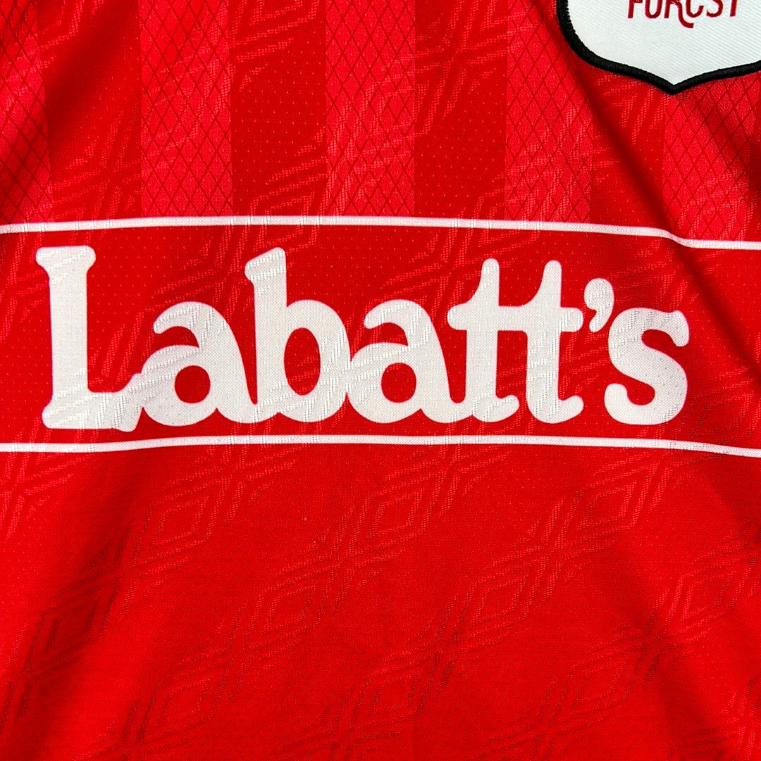 Shirt info: The home shirt for Nottingham Forest in the 1994/1995 season and the 1995/1996 season. Labatt's beer sponsorship and embroidered Forest badge. The shirt has 2 black stripes coming down from the shoulder. This is an iconic look and sponsor for Nottingham Forest.