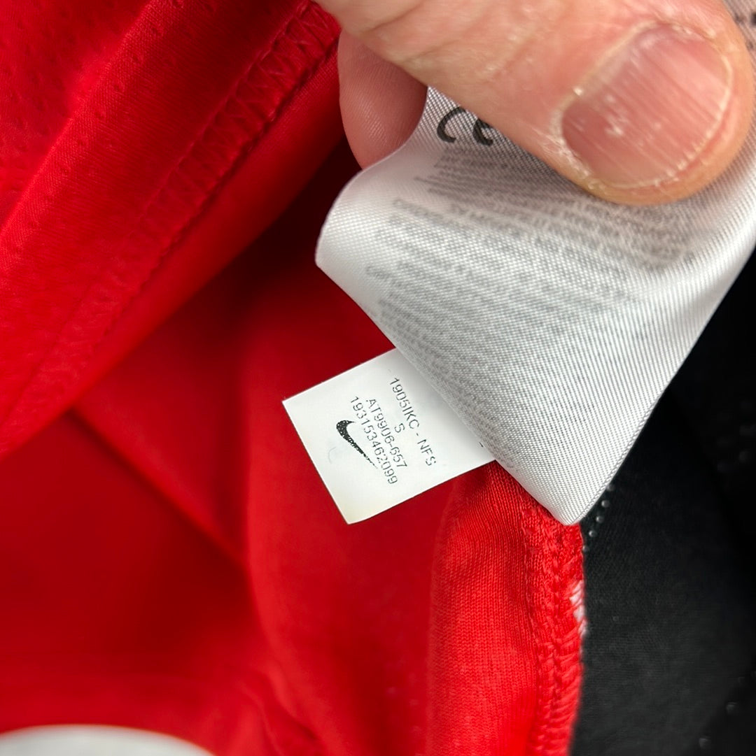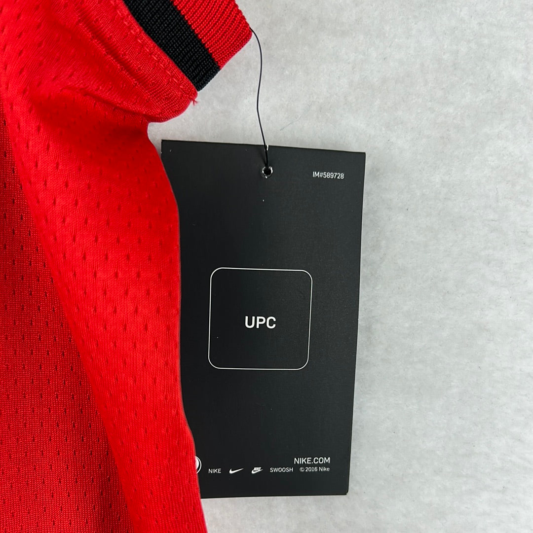 Shirt info: This is a Portland Trail Blazers jersey worn by the Portland based men's basketball team. The red, black and white jersey features 'Portland' across the front chest with a black Nike tick, and black detailing on the arms and collar. The black diagonal strip has extra stripe print detailing. This is a Swingman jersey.