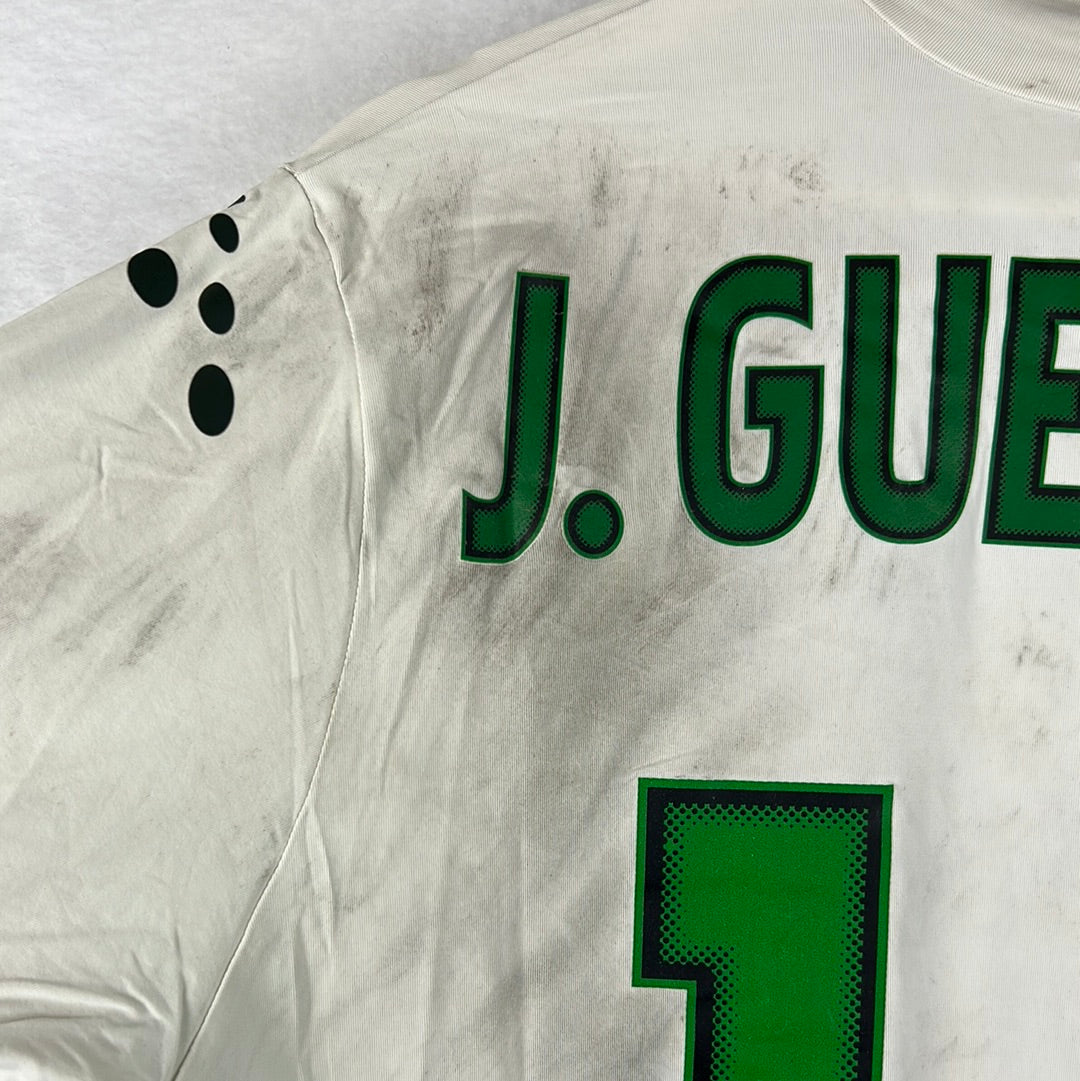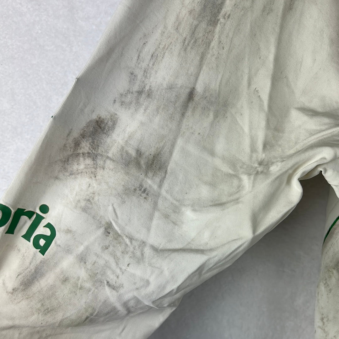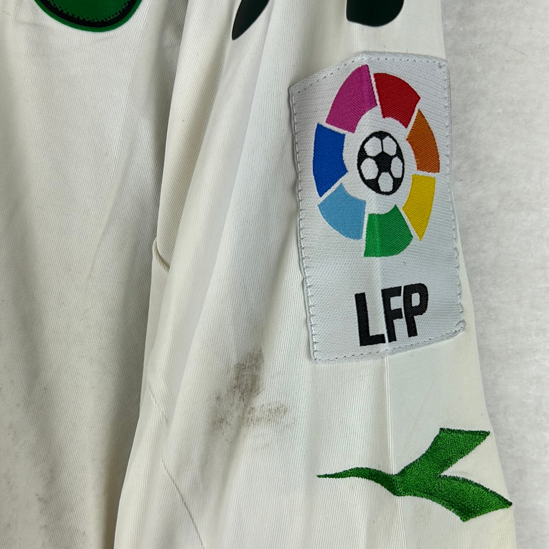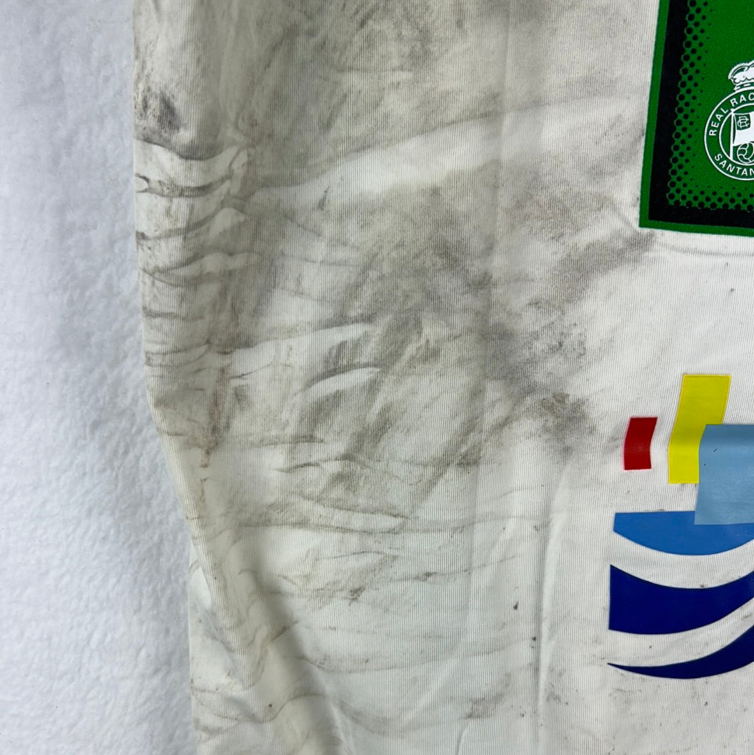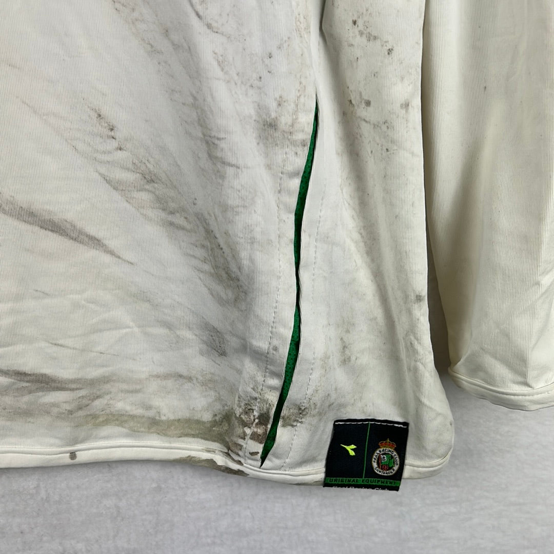 Shirt info: The white and green away shirt worn by Racing Santander during the 2004-2005 La Liga season. This specific football shirt was match worn by Guerrero for the away match vs FC Barcelona on 22/1/2005 which they lost 3-0. The shirt features, an embroidered Racing Santander badge, and a printed Diadora logo and 'OID' sponsor in blue. The Diadora circle design has been printed in black on the shoulders with an embroidered green Diadora logo. The right sleeve has a La Liga 'LFP' stitched patch. 'Guerrero 10' is printed on the back in green plastic flock.