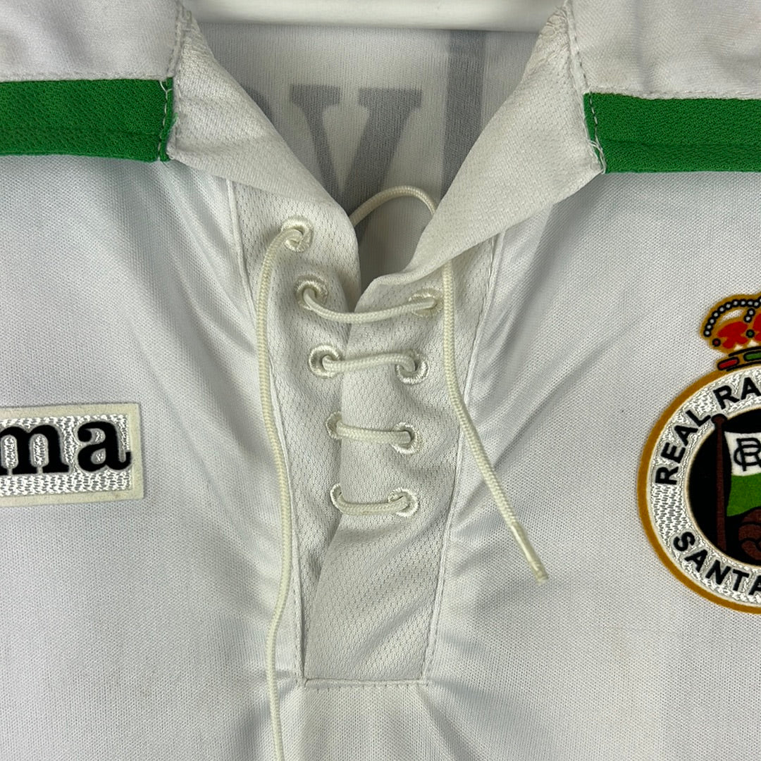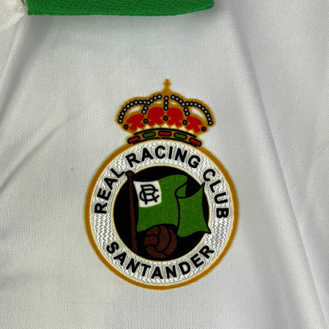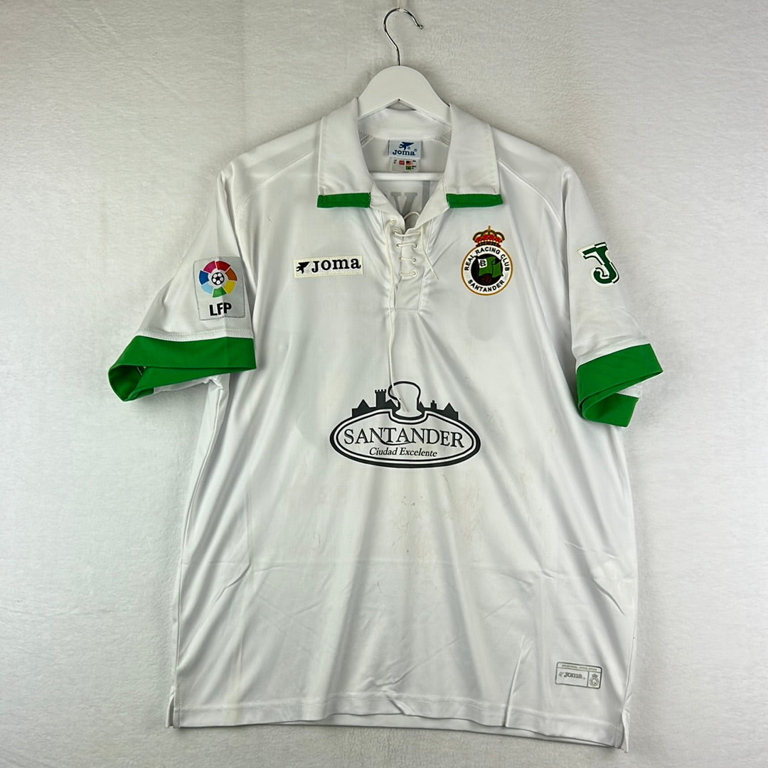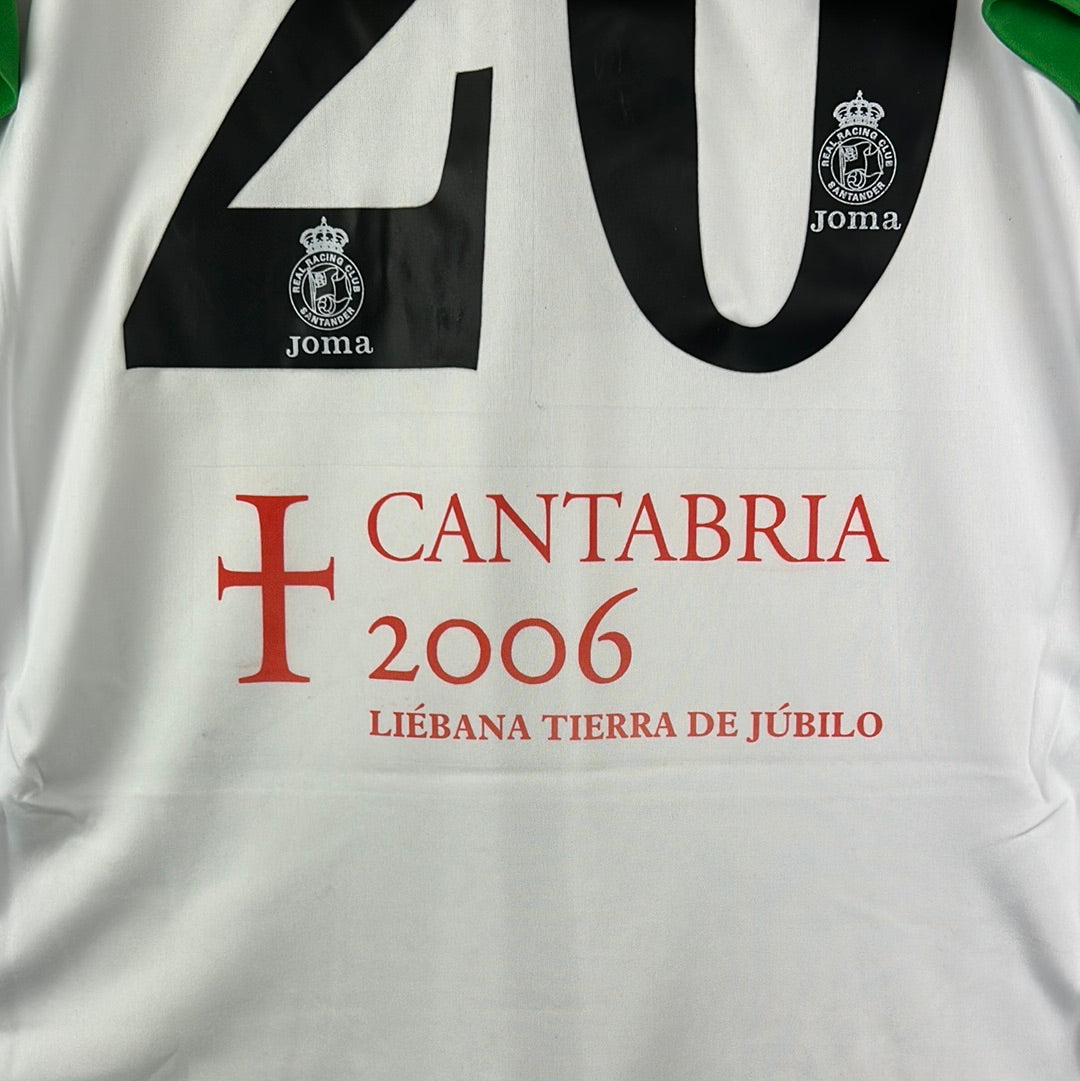 Shirt info: The white and green home shirt worn by Racing Santander during the 2006-2007 La Liga season. This specific football shirt was player issued to Alvarez for the away match vs Barcelona on 11/2/2007 which they lost 2-0. The shirt features the original laces on the collar, a felt Racing Santander badge and Joma logo, with a 'Santander' sponsor in the material. The right sleeve has a La Liga 'LFP' stitched patch and a printed Joma logo. The shirt has a white collar with a green trim design. 'Alvarez 20' is printed on the back in black plastic flock.