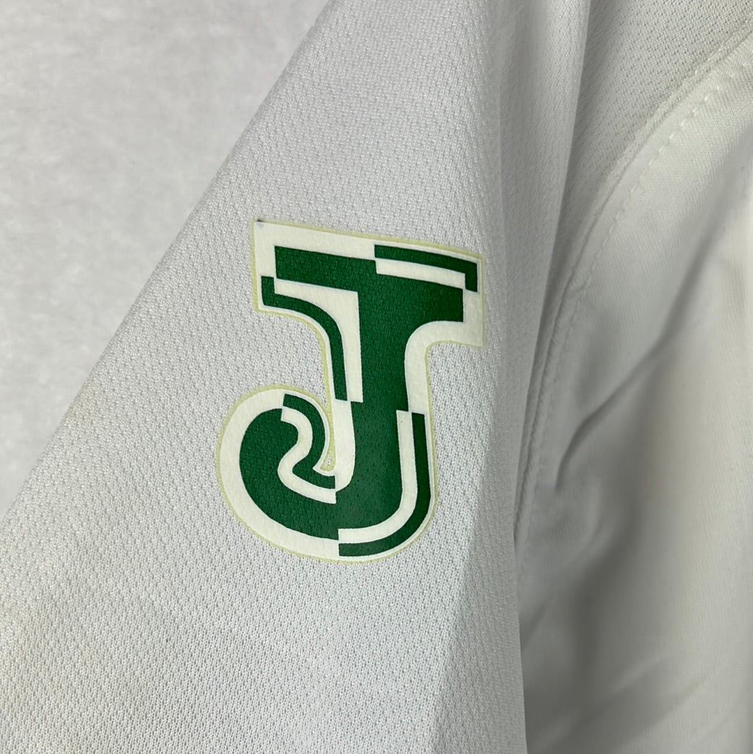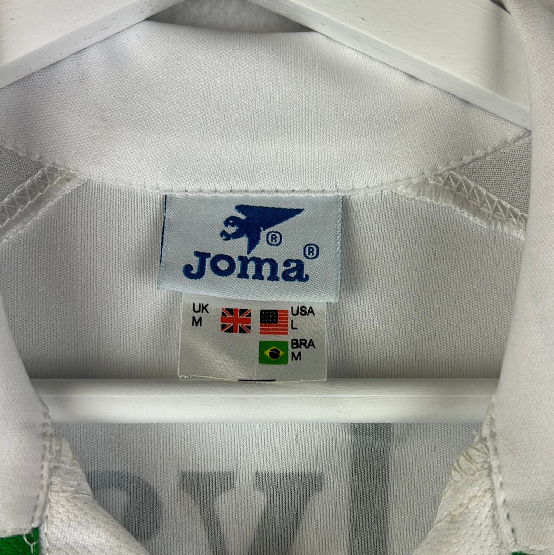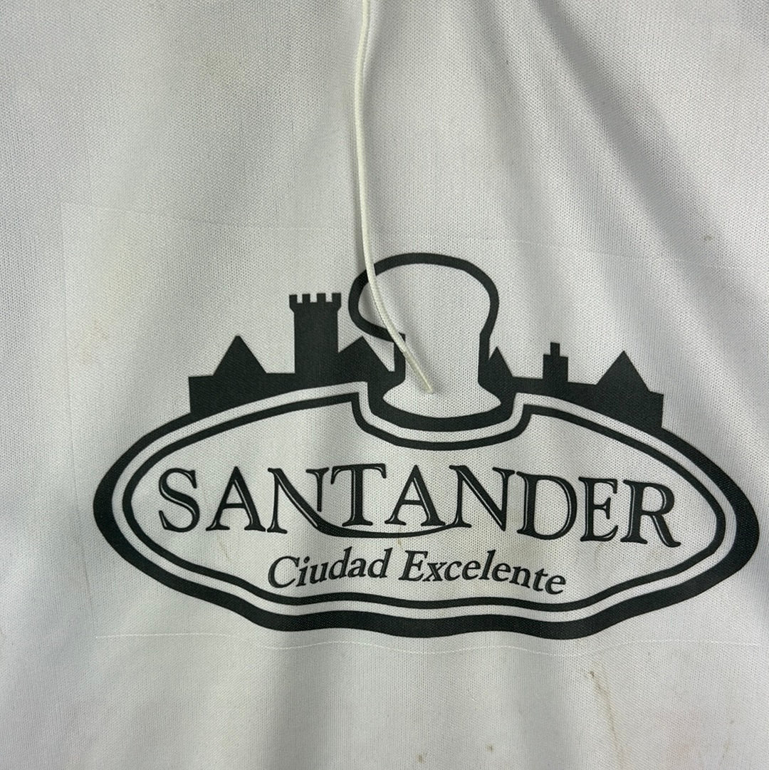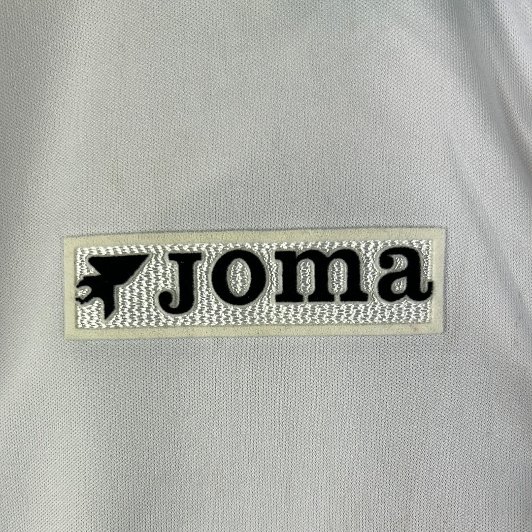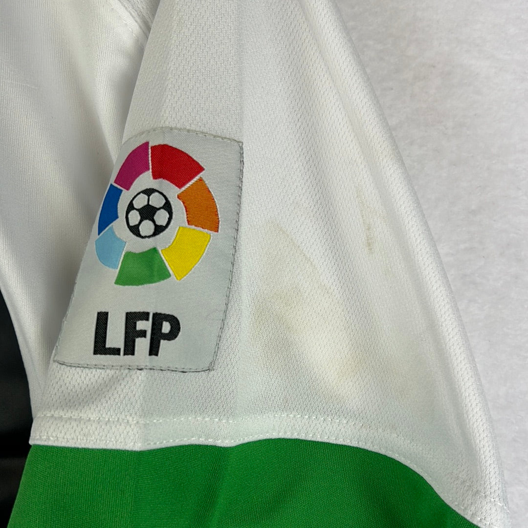 Shirt info: The white and green home shirt worn by Racing Santander during the 2006-2007 La Liga season. This specific football shirt was player issued to Alvarez for the away match vs Barcelona on 11/2/2007 which they lost 2-0. The shirt features the original laces on the collar, a felt Racing Santander badge and Joma logo, with a 'Santander' sponsor in the material. The right sleeve has a La Liga 'LFP' stitched patch and a printed Joma logo. The shirt has a white collar with a green trim design. 'Alvarez 20' is printed on the back in black plastic flock.