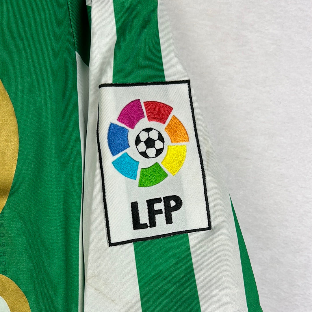 Player Issue Details: Original player issue shirt. The Betis logo and badge are fully embroidered. The sponsor is heat printed on. The La Liga sleeve badge is heat-pressed. It has a 100-year patch on the front breast.