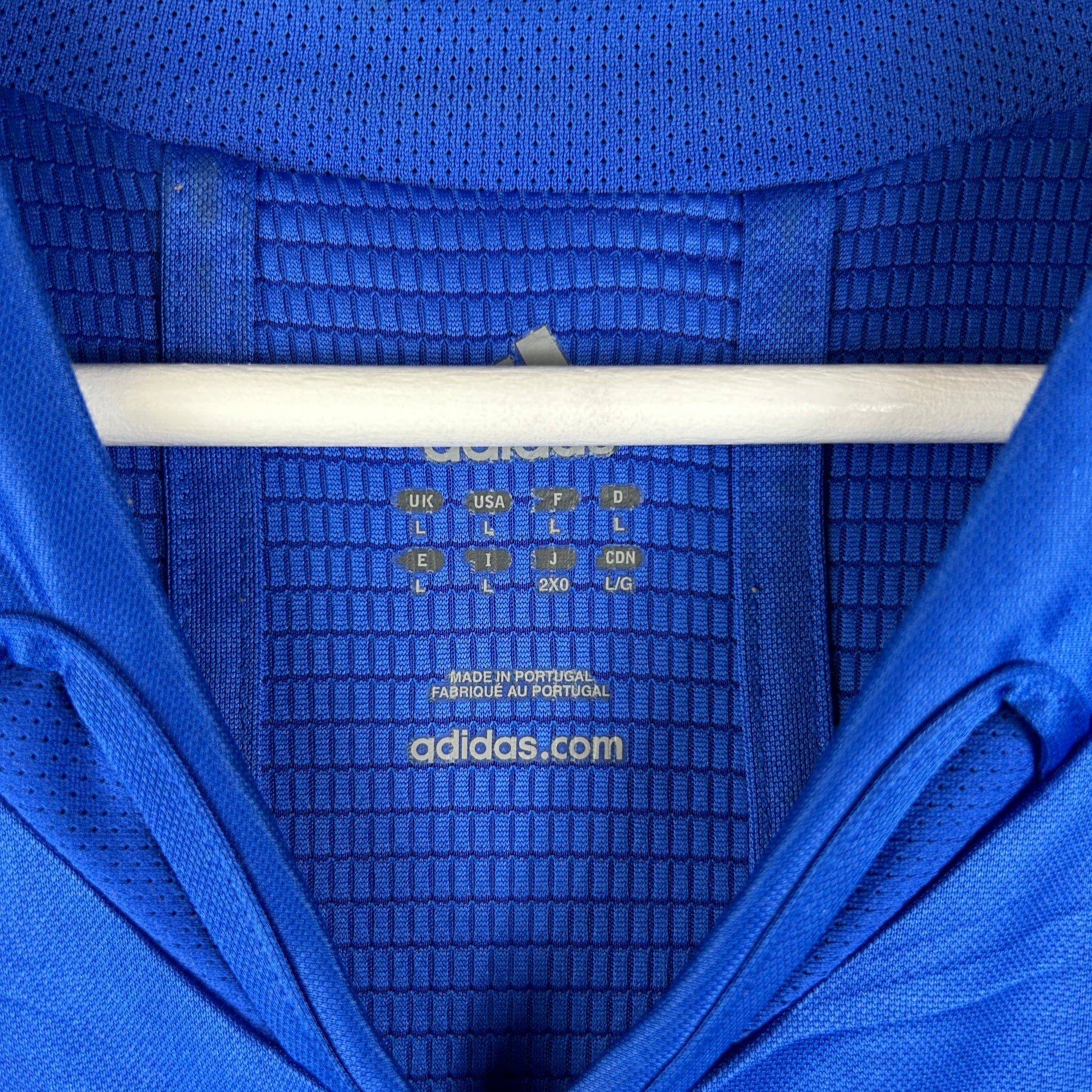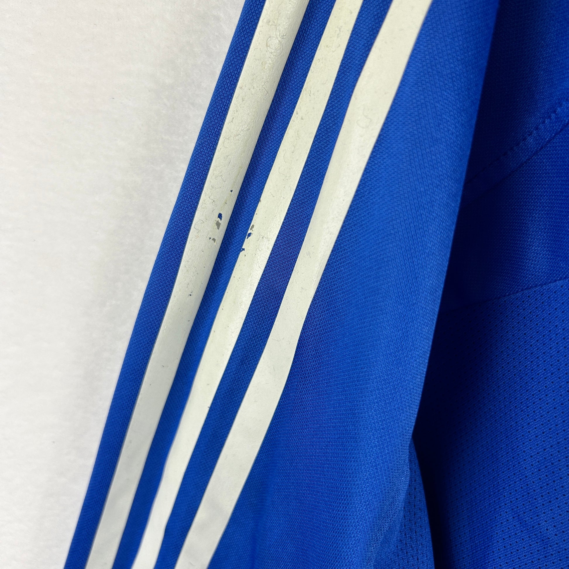 Player Issue Details: Original formation Adidas shirt, correct badges and prints. The shirt has an embroidered Real Madrid badge, an Adidas logo, and three printed stripes on the sleeves. The shirt material is two layers with a waffle-type material on the inside.