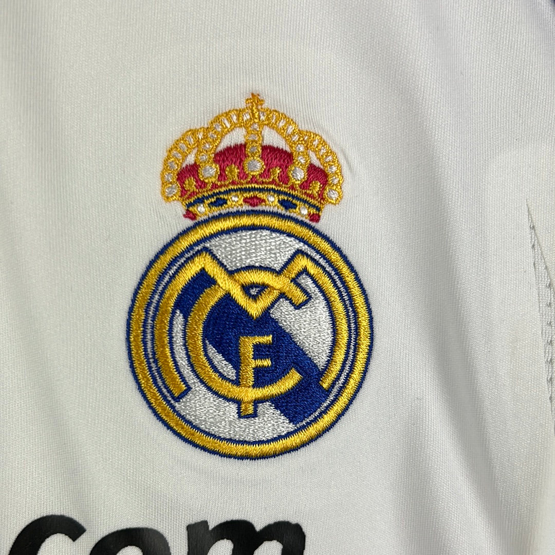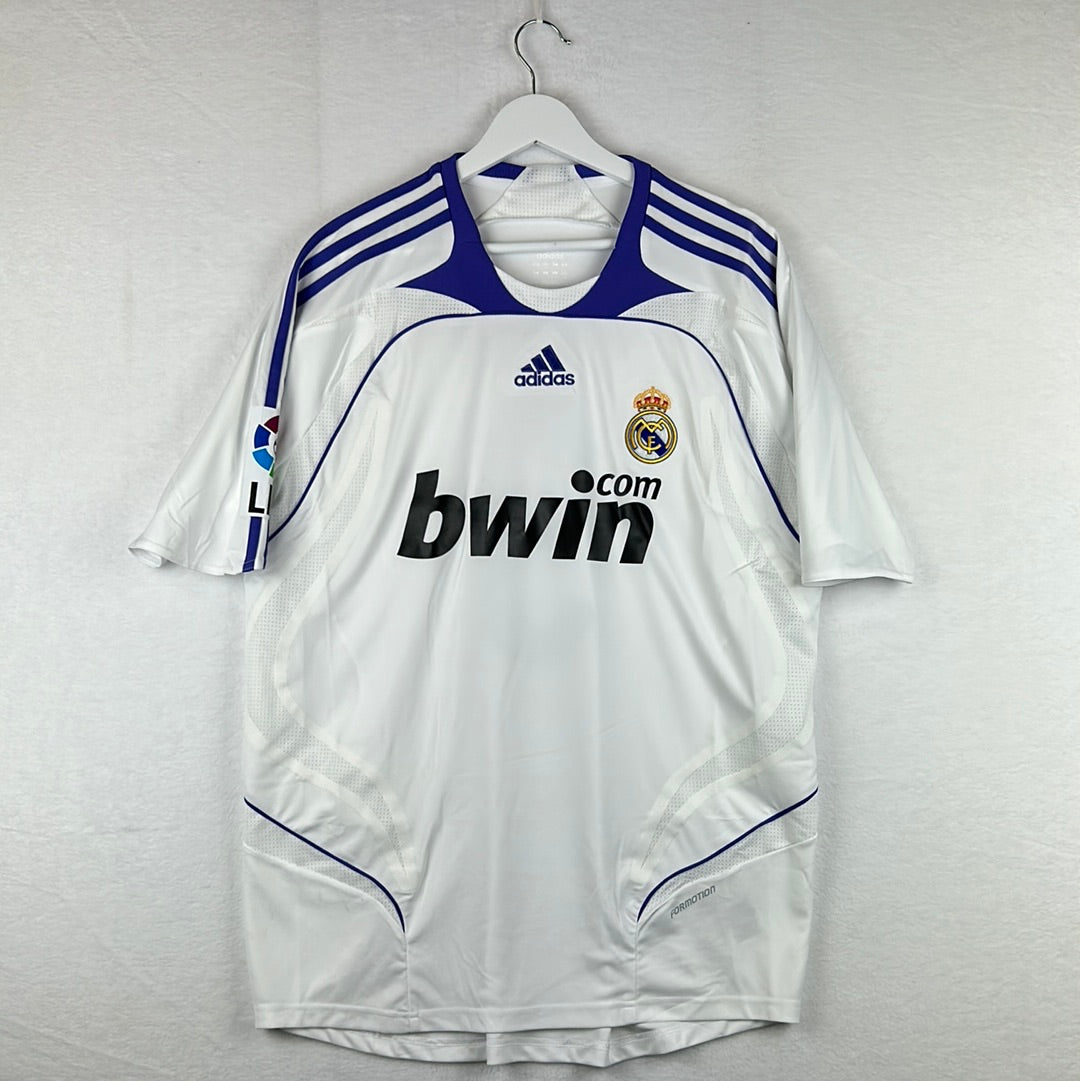 Shirt info: The Real Madrid home shirt in the 07/08 season. A white shirt with purple trim and a Bwin sponsor.