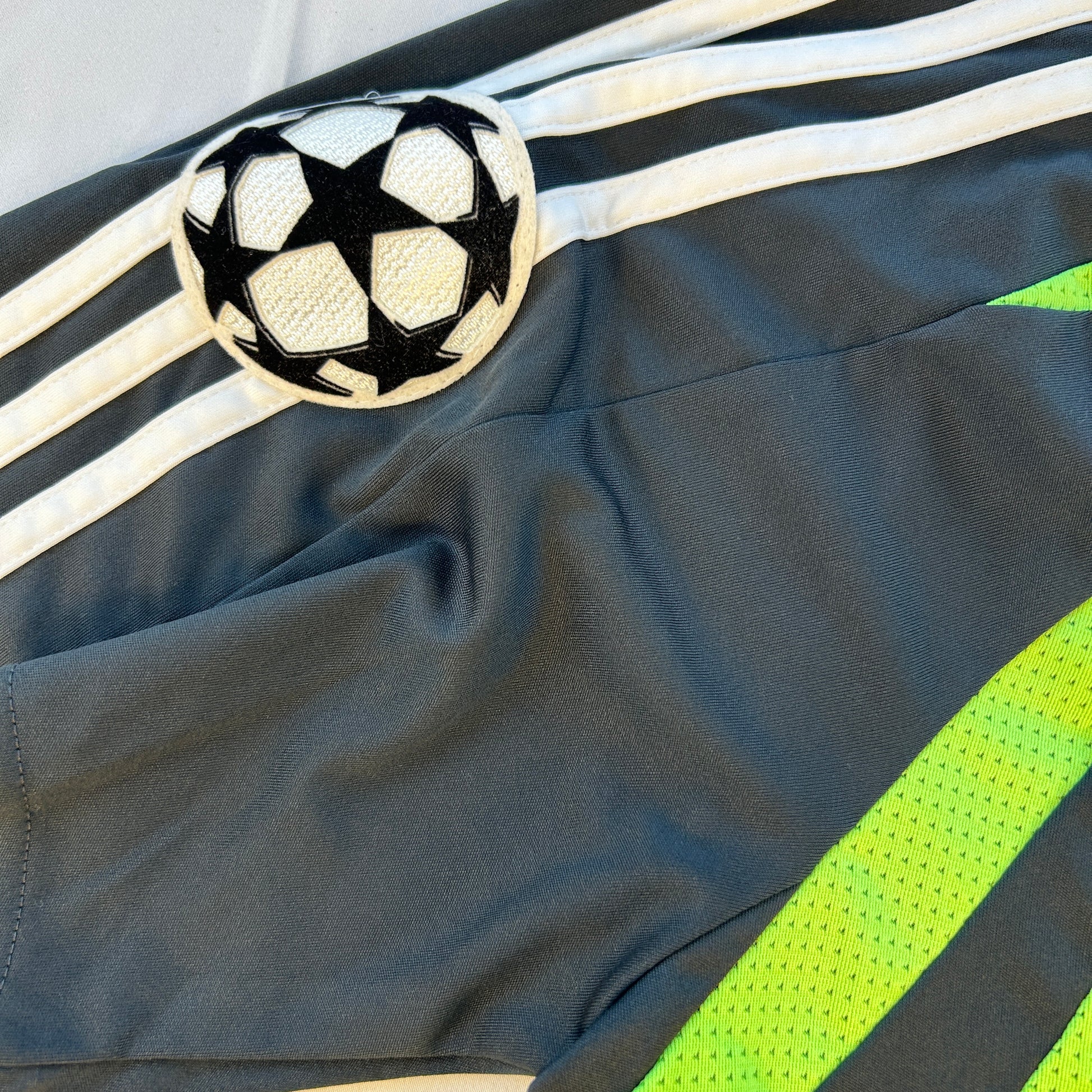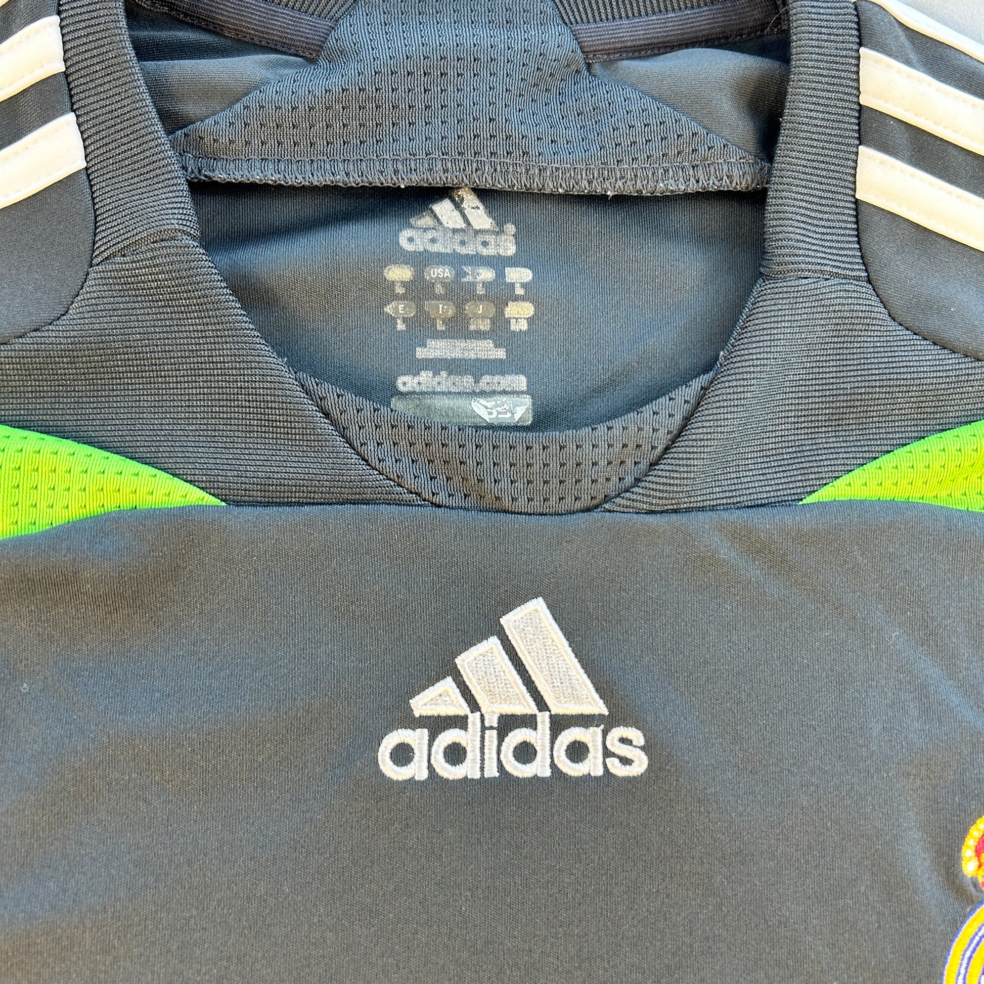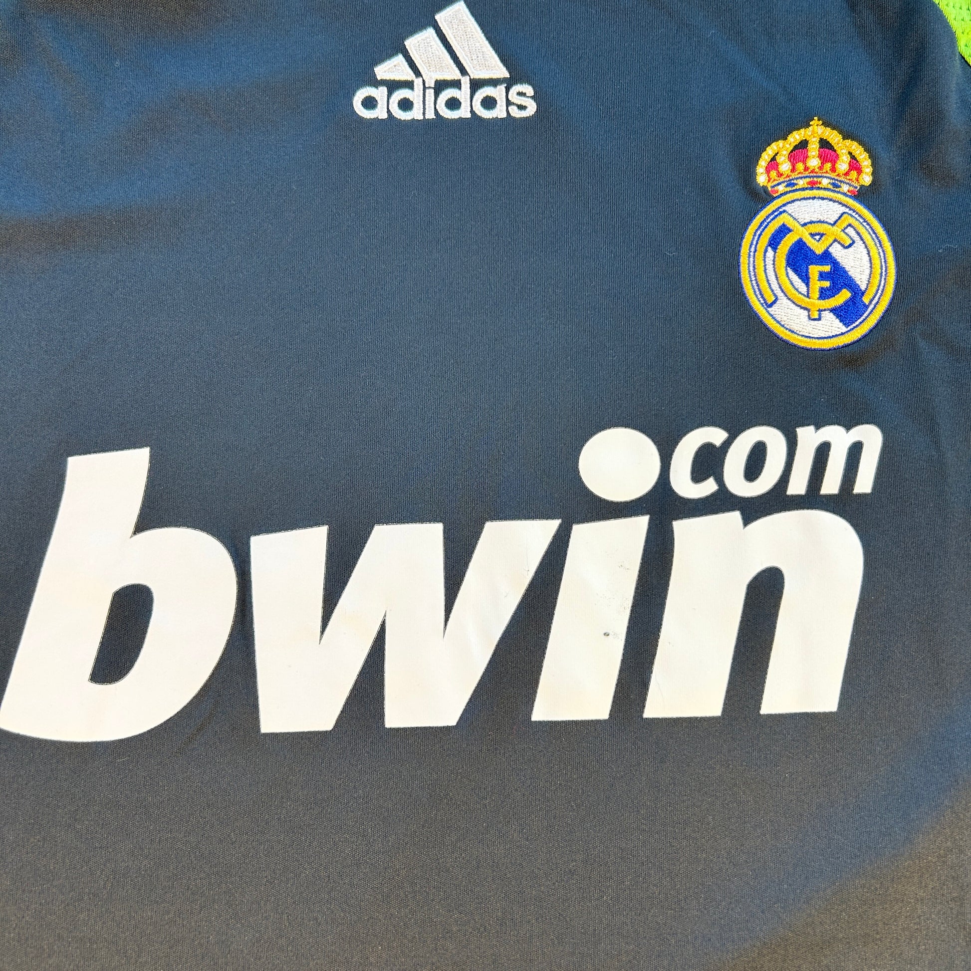 Shirt info: The Real Madrid 2007-2008 third shirt with Champions League star ball patch and the 'x9 times Champions League winners' patch on the sleeves. This green and neon green shirt has the typical Adidas design from the mid-naughties with the Adidas logo centered. The Real Madrid badge and Adidas logo are embroidered, and the 'BWIN.com' sponsor is printed.