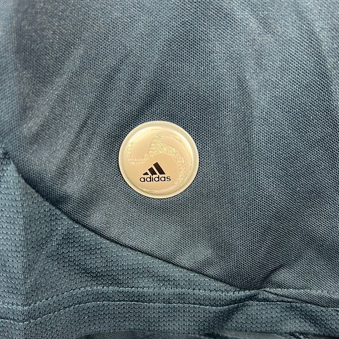Shirt info: The 2009-2010 away shirt worn by Real Madrid that season. The dark navy blue shirt features an embroidered logo representing the 'Santiago Bernabeu' stadium, a light blue Adidas badge centered, and the 3-stripe Adidas design on the sleeves. The Real Madrid badge and Adidas logo are embroidered, and the sponsor is printed.