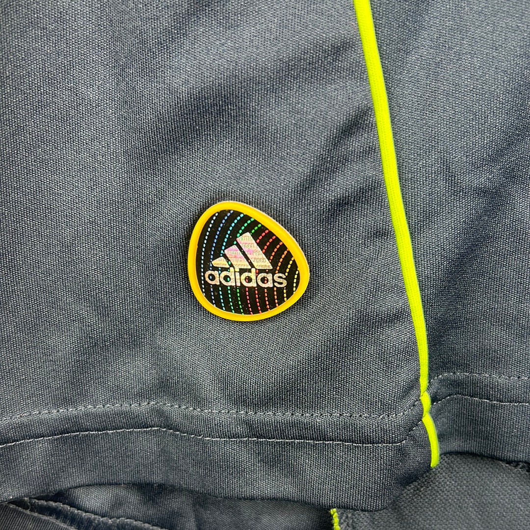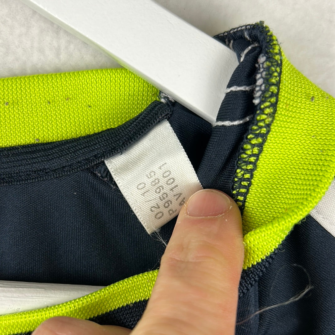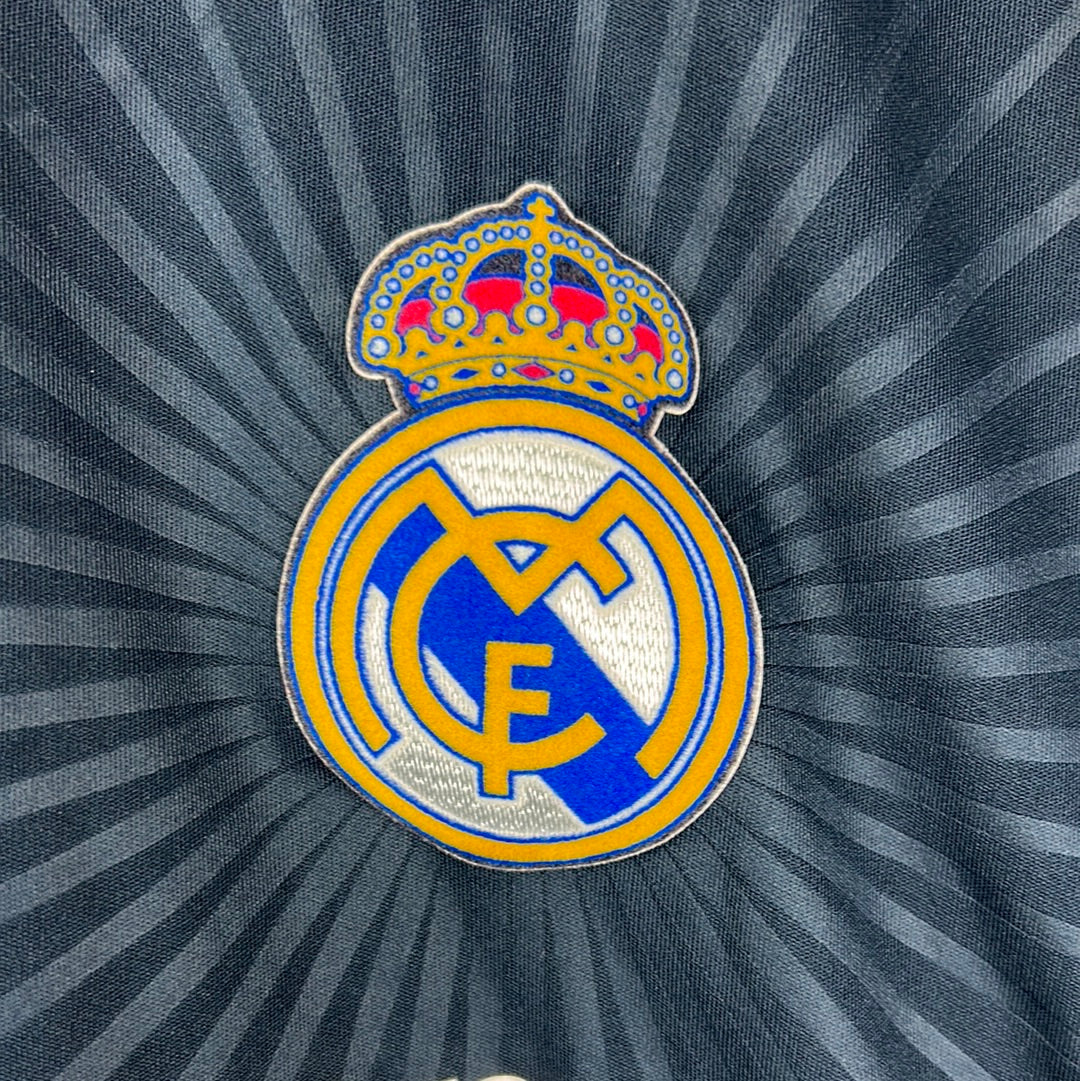 Shirt info: The Real Madrid 2010-2011 third shirt. This midnight shirt features neon green detailing on the neck and side panels with the white 3-stripe pattern on the sleeves, as Adidas started to switch their look for the 2010s. The Real Madrid badge and Adidas logo are embroidered. The 'BWIN.com' sponsor is printed.