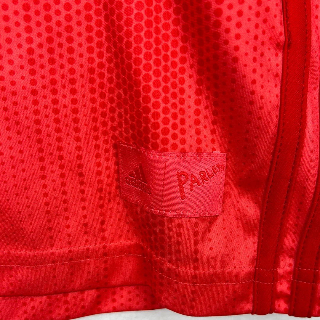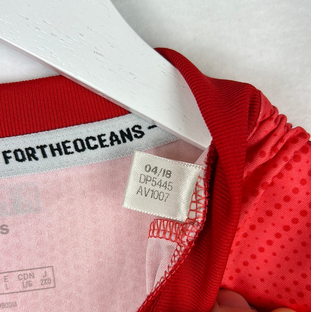 Shirt info: The Real Madrid third shirt in 2018/2019. This was part of a design of shirts from Parley and Adidas. This is the first recycled Real Madrid shirt. The shirts are made from recycled ocean plastic through the Parley program. It has a spotty design from the bottom and an Adidas x Parley patch on the lower front of the shirt.