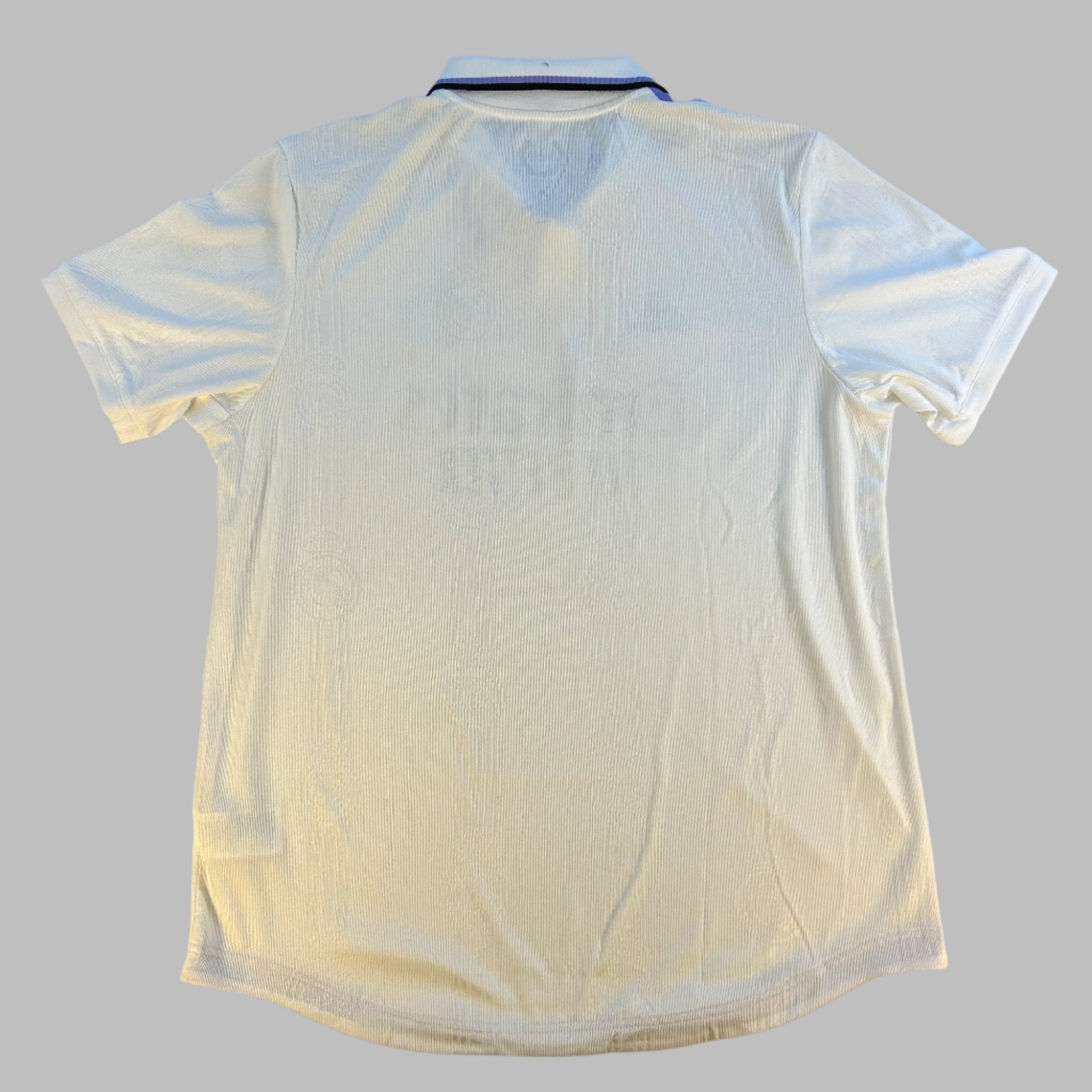Shirt info: 22/23 home shirt for Real Madrid. This is a nice white shirt with the Real Madrid badge in white fabric. This is the authentic level shirt with heat pressed badge, Adidas logo and three stripes.
