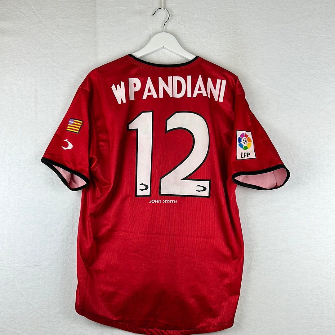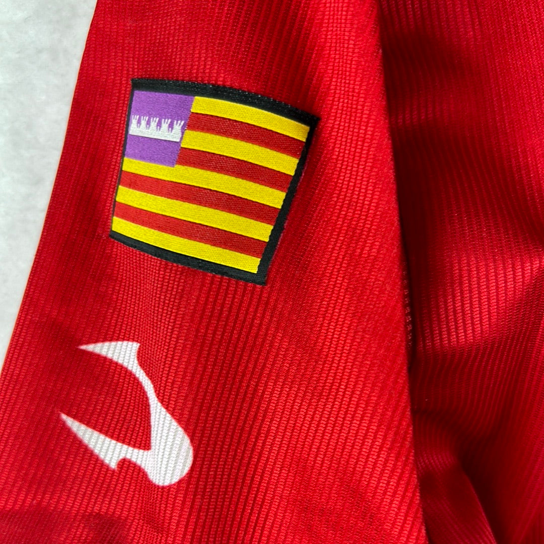 Shirt info: The red home shirt worn by Real Mallorca during the 2002-2003 La Liga campaign. This specific shirt features; a printed Real Mallorca badge, John Smith logo and 'Spanair' sponsor. The sleeves have the La Liga 'LFP' patch printed. It has 'Pandiani 12' printed in white plastic flock on the back.
