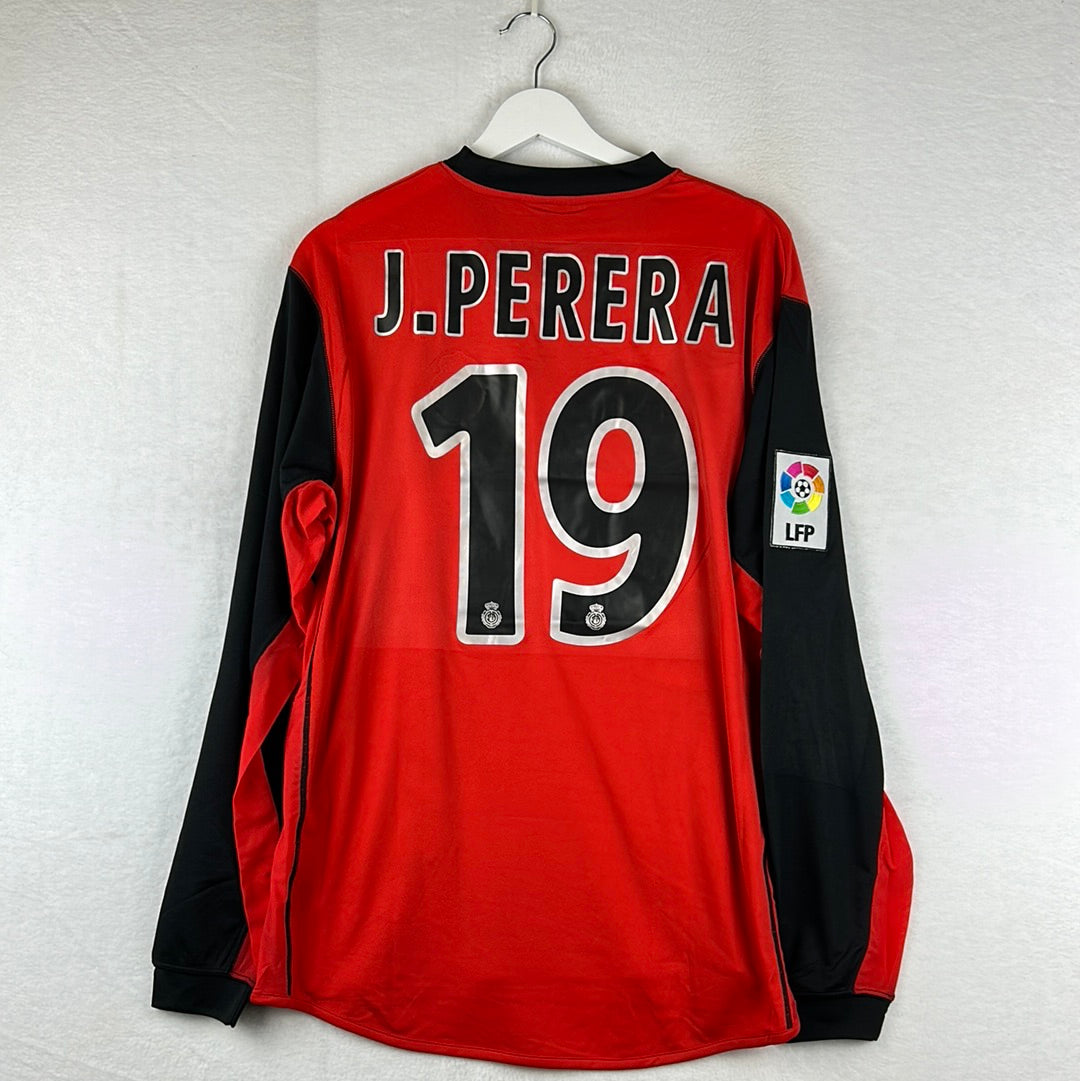 Shirt info: The in-house red home shirt worn by Real Mallorca during the 2005-2006 La Liga campaign. This specific shirt was player issued to Perera for the home match vs FC Barcelona on 26/9/2004 which they lost 3-1.  The red shirt features an embroidered Real Mallorca badge and logo, and a printed 'Spanair' sponsor with some black and white detailing throughout. It has 'Perera 19' printed in black and silver font on the back. This is a long-sleeve football shirt.