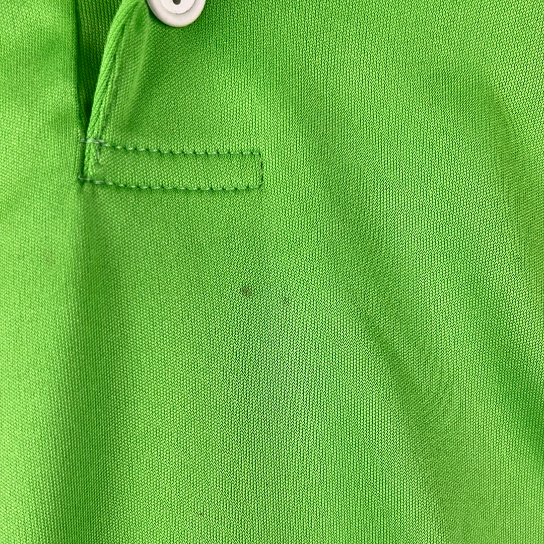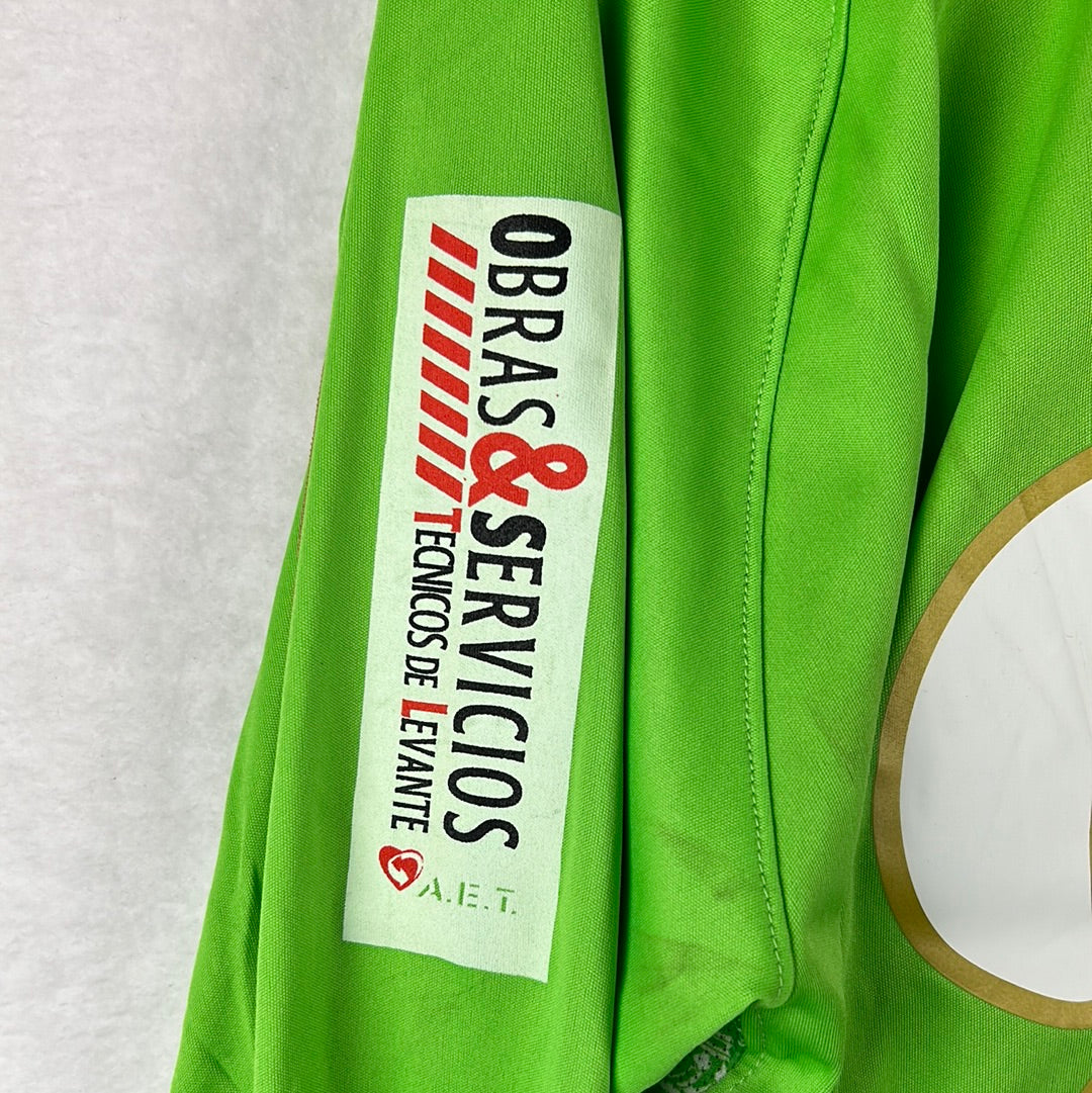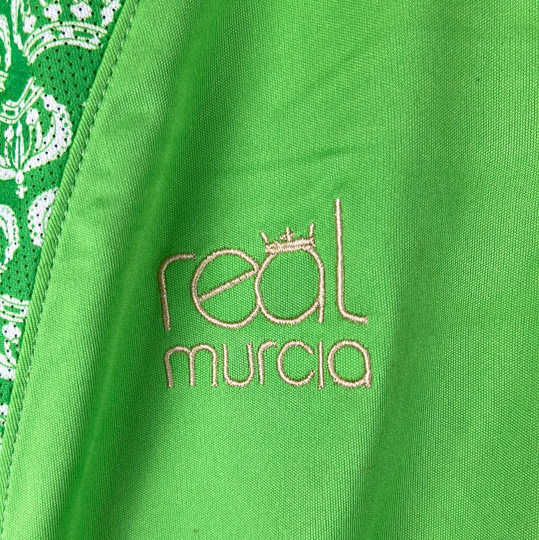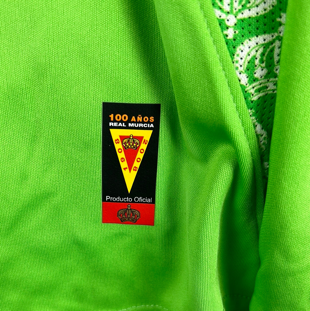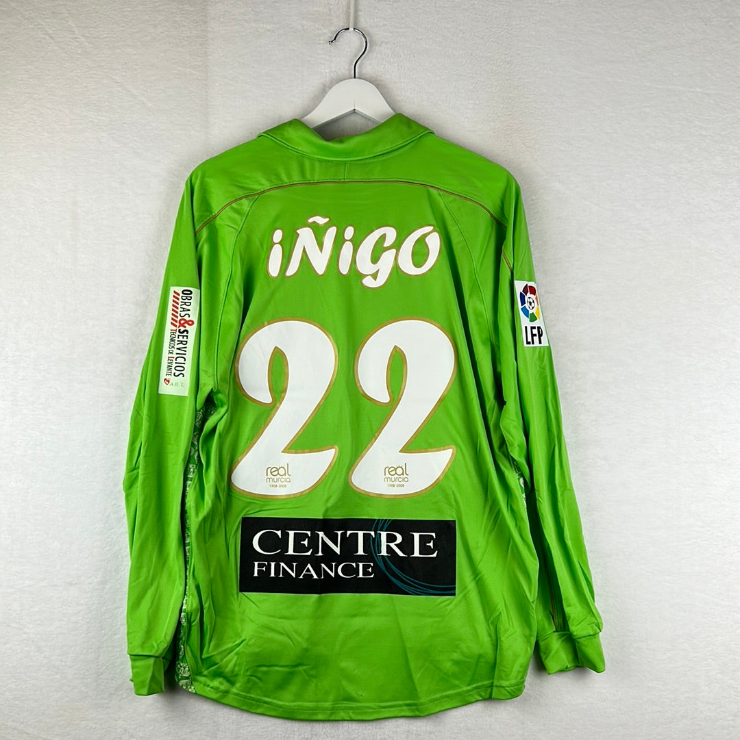 Shirt info: The light green away shirt worn by Real Murcia in the 2007-2008 La Liga season. This specific shirt is match worn by Inigo 22 in the away match against Barcelona on 12/1/2008 which they lost 4-0. The shirt has the Real Murcia logo embroidered in the side panels, with an embroidered Real Murcia badge. The 'Cajamurcia' sponsor is printed. This is a collared football shirt. 'Inigo 22' is printed on the back with white and gold font.