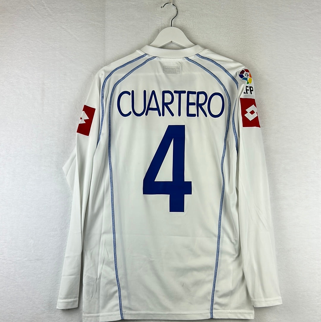 Shirt info: The white home shirt worn by Real Zaragoza during the 2005-2006 La Liga season. This specific shirt was worn by Cuatero during the home match against Barcelona which they lost 0-4 on 25/2/2006. This game was marred and nearly abandoned due to the racial abuse of Samuel Eto'o. The Real Zaragoza badge and Lotto logo is embroidered, with the 'Telefonica' sponsor printed in blue. The shirt has 'Cuartero 4' in blue plastic flock on the back.