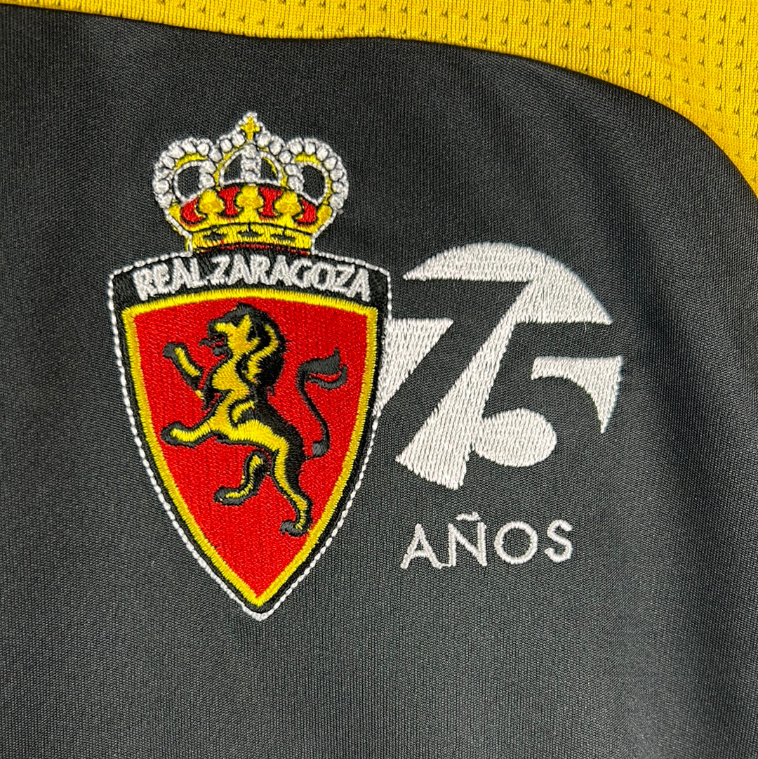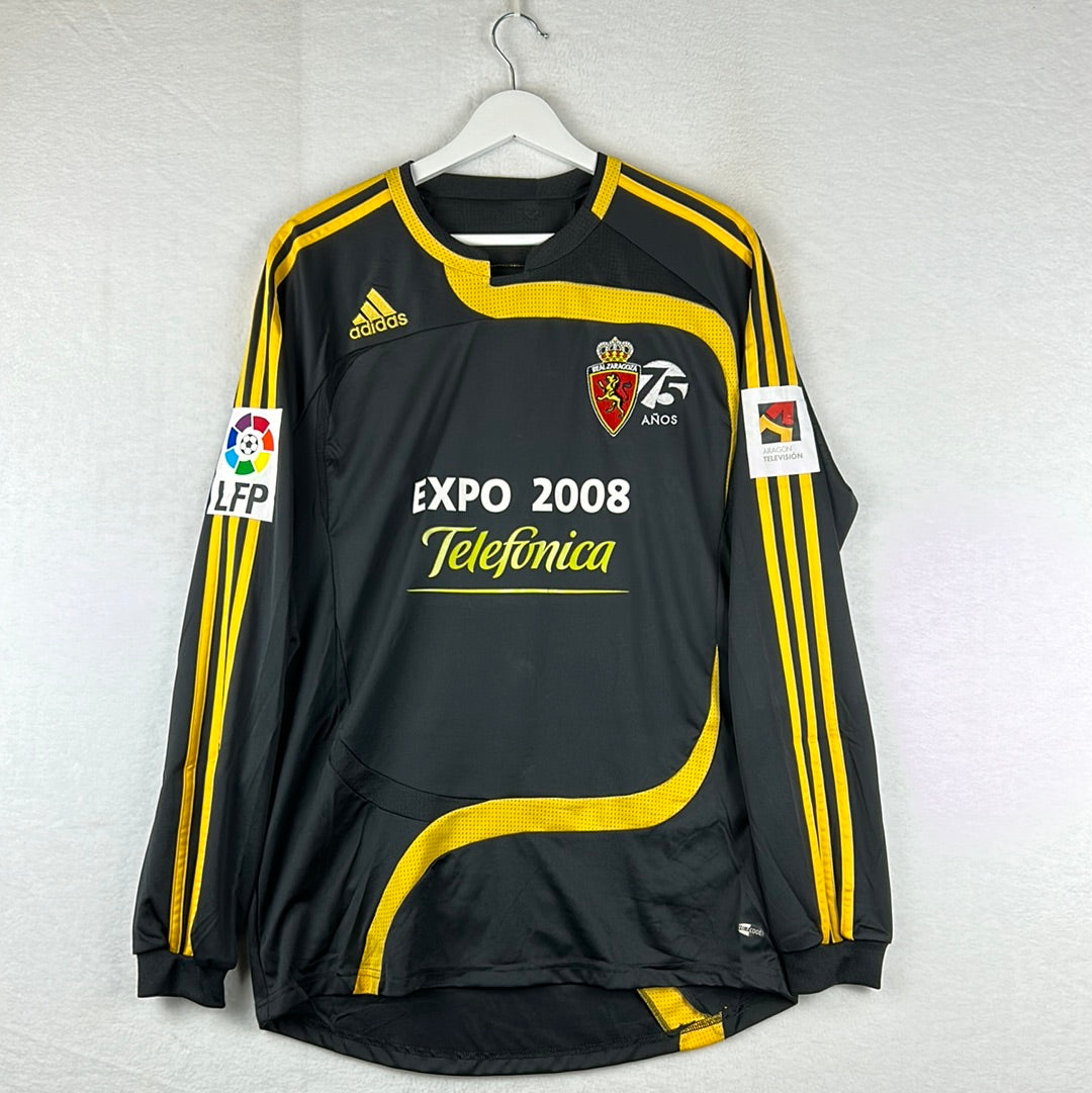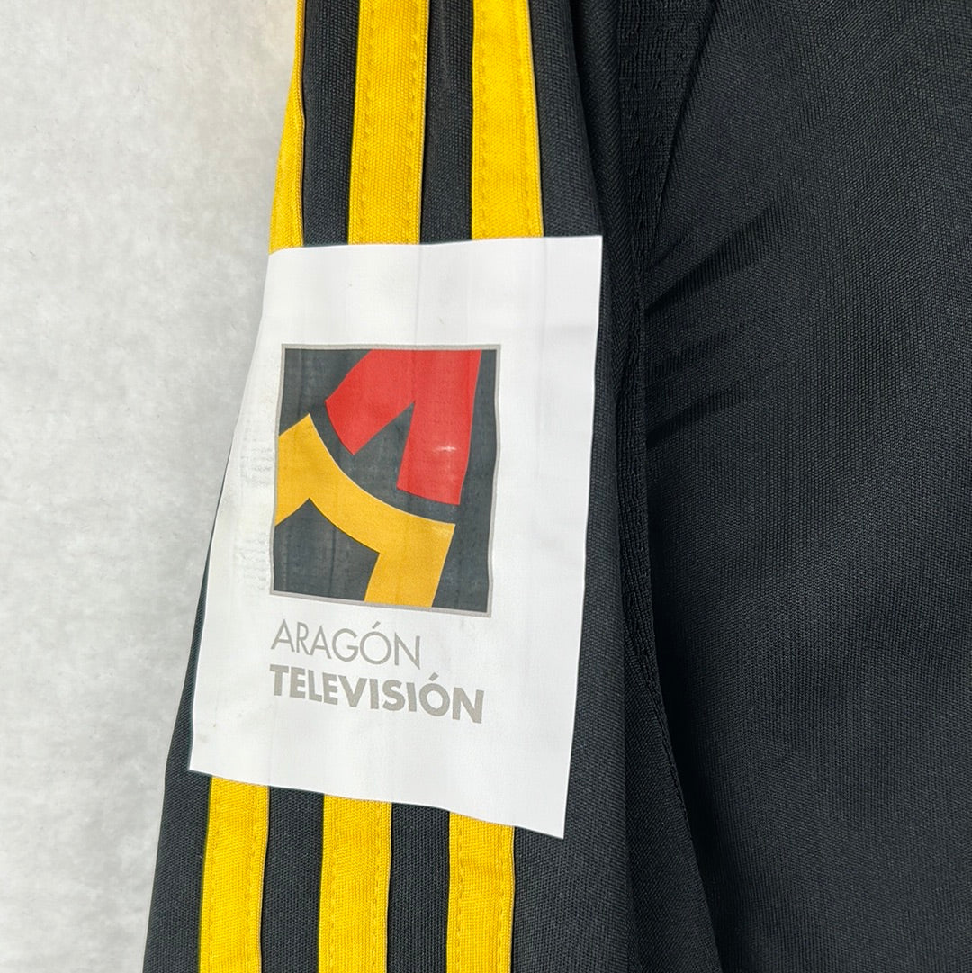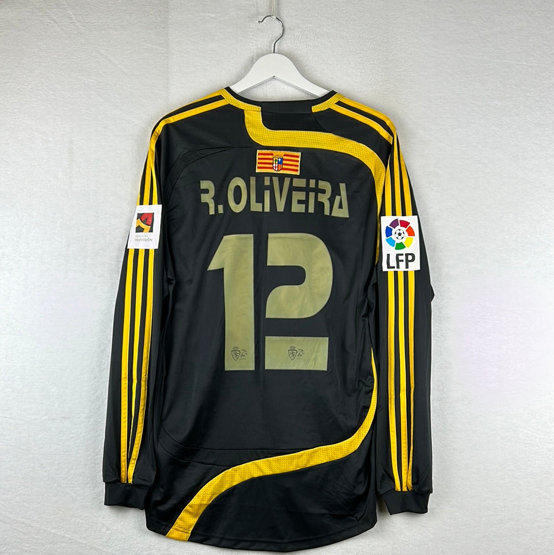 Shirt info: The black and yellow Adidas 'Climacool' away centenary shirt worn by Real Zaragoza during the 2007-2008 La Liga season. This specific shirt was player issued to Oliveria for the away match vs Real Madrid on 6/1/2008 which they lost 2-0. The Real Zaragoza badge, Adidas logo and '75 Anos' logos are embroidered. The 'Telefonica' sponsor both printed. The right sleeve a printed 'LFP' patch. The back of the shirt has a Spanish flag and 'Oliveira 12' in plastic flock on the back. This is. long-sleeve football shirt.