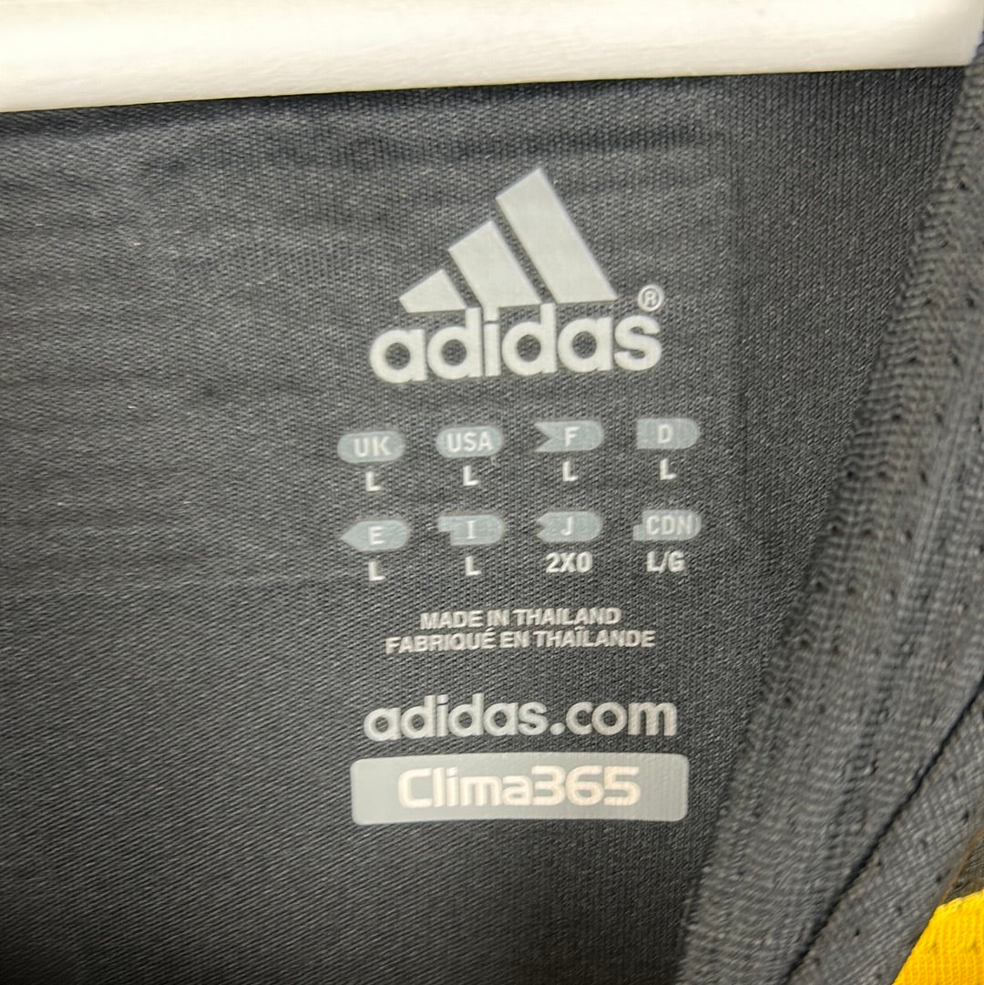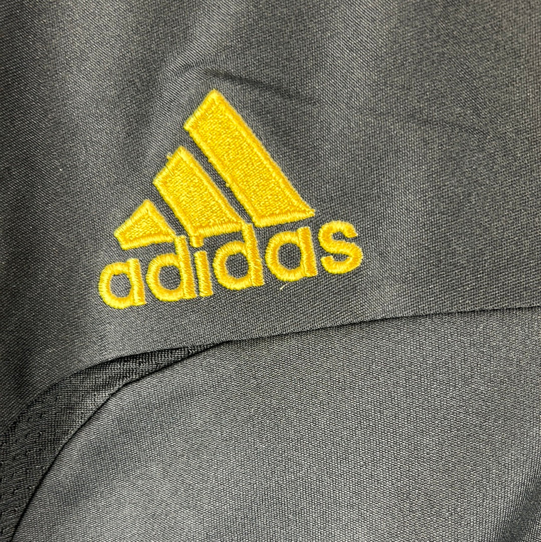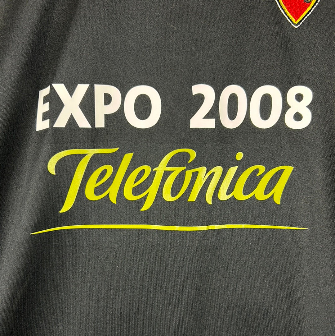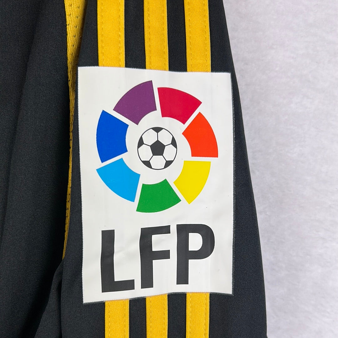 Shirt info: The black and yellow Adidas 'Climacool' away centenary shirt worn by Real Zaragoza during the 2007-2008 La Liga season. This specific shirt was player issued to Oliveria for the away match vs Real Madrid on 6/1/2008 which they lost 2-0. The Real Zaragoza badge, Adidas logo and '75 Anos' logos are embroidered. The 'Telefonica' sponsor both printed. The right sleeve a printed 'LFP' patch. The back of the shirt has a Spanish flag and 'Oliveira 12' in plastic flock on the back. This is. long-sleeve football shirt.