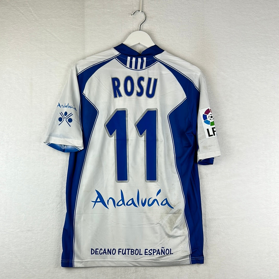Shirt info: The blue and white striped home shirt worn by Recreativo de Huelva during the 2006-2007 La Liga season. The Recreativo badge and Ce Judo logo are embroidered, with the 'Caja San Fernando' sponsor printed in green. The shirt has 'Rosu 11' in blue and silver plastic flock on the back.