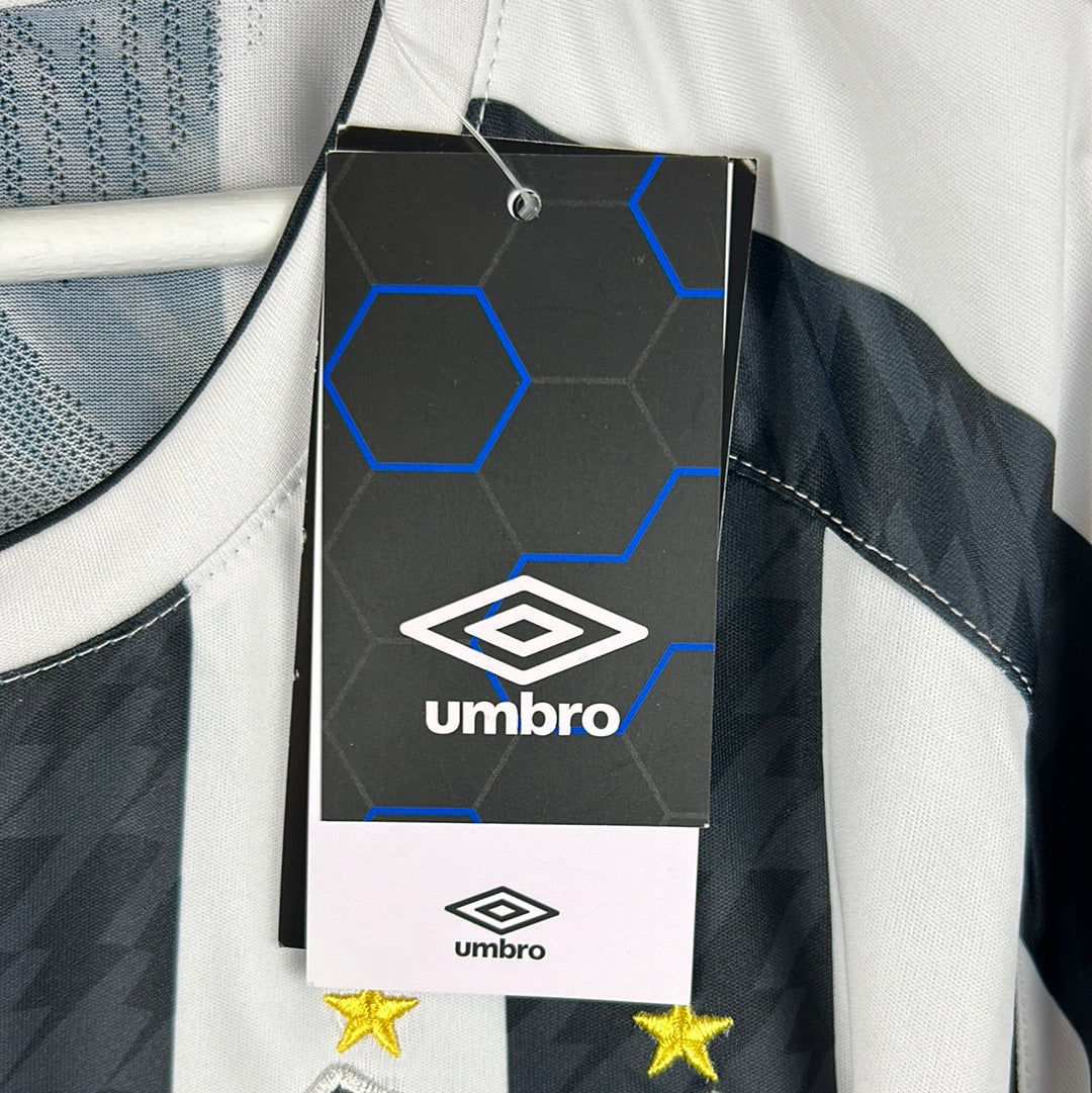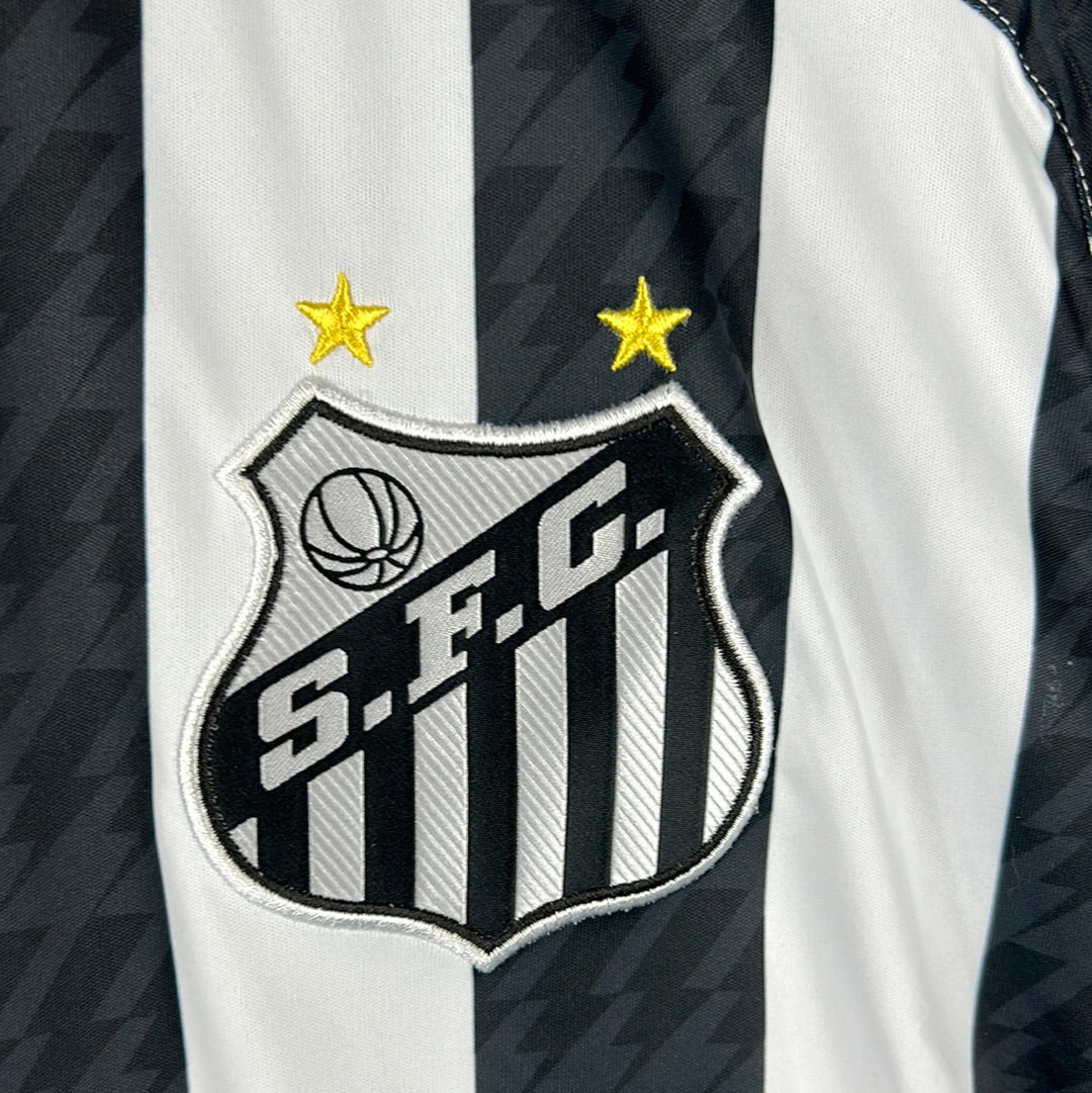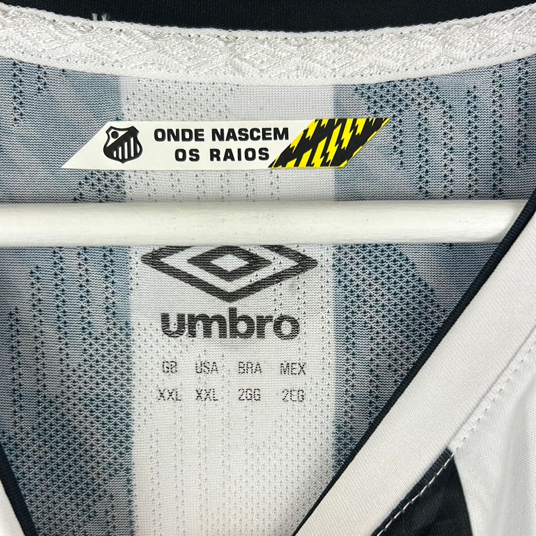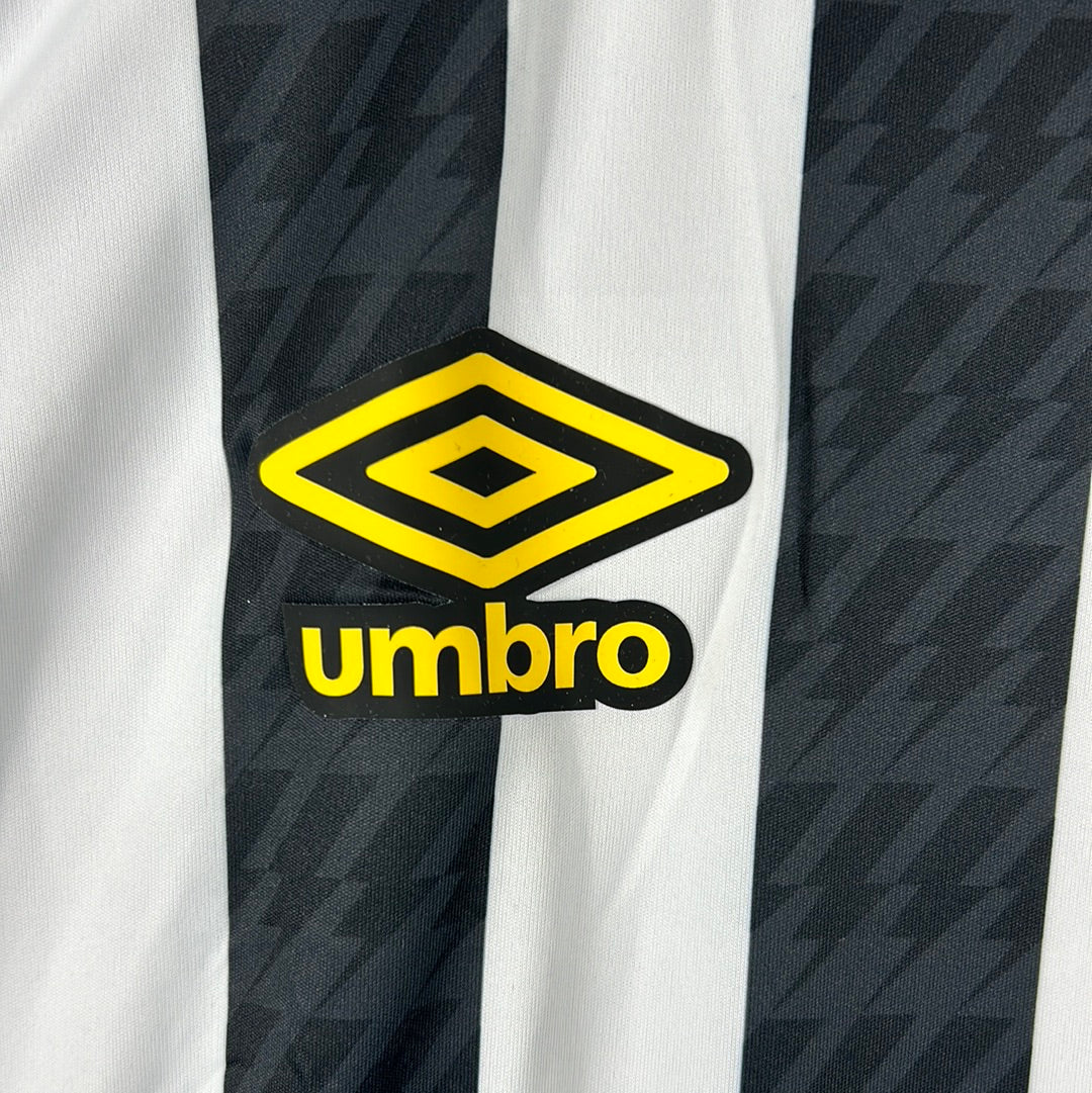 Shirt info: This is the Santos home shirt worn in the 2020-2021 season—a standard black and white striped shirt with a yellow Umbro logo. The front of the shirt is sponsorless.