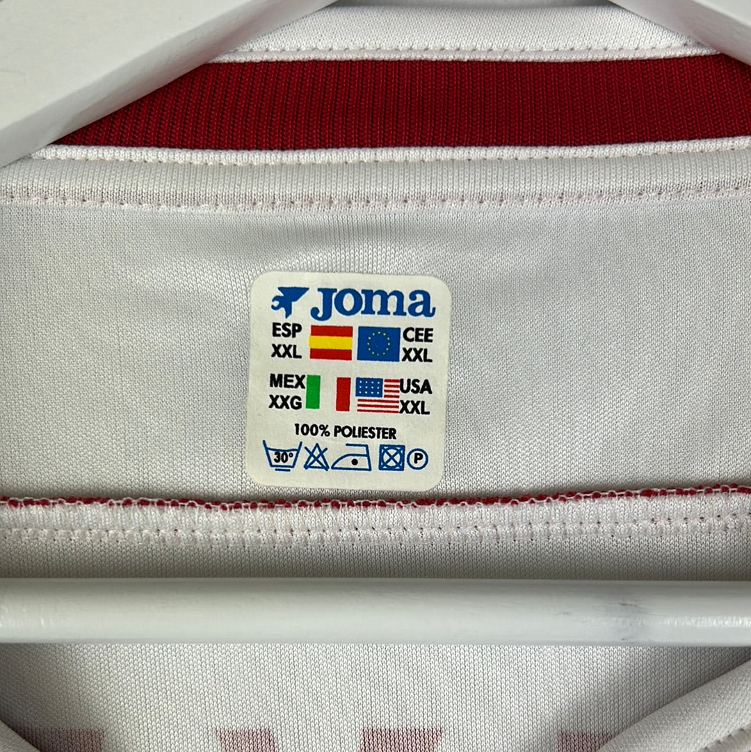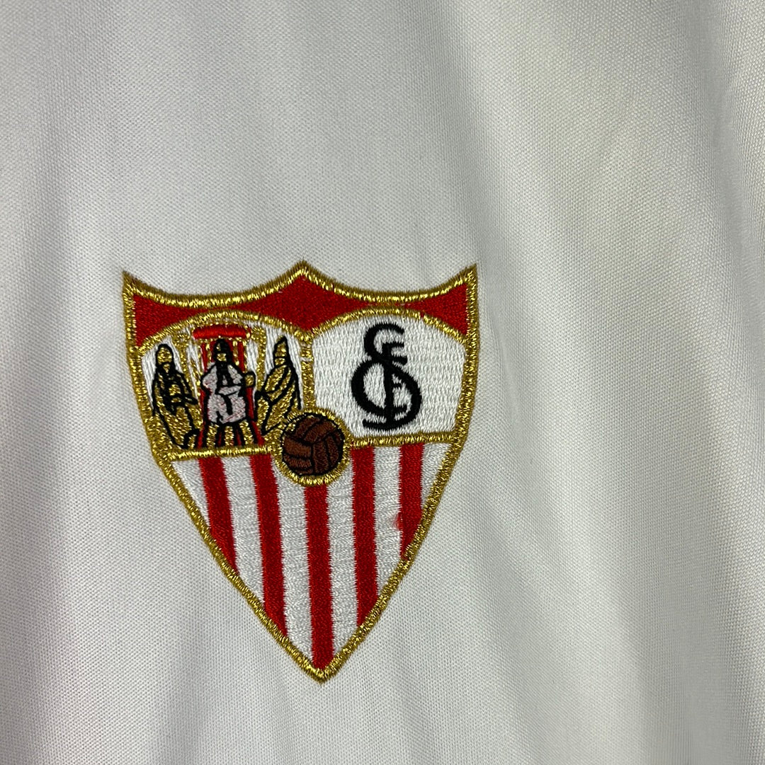 Player Issue Details: Original player issue shirt with the correct badges and patches for a player's shirt. The Sevilla badge and JOMA are both fully embroidered. The La Liga patch is heat transferred on the sleeve. It is a size XXL but is a slim fit and more like a standard large in modern shirts.