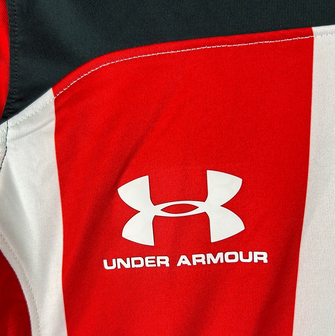 Player Issue Details: The shirt is an Under Armour player shirt with a heat-pressed Premier League badge on one sleeve. The player print is the correct size for a player shirt.