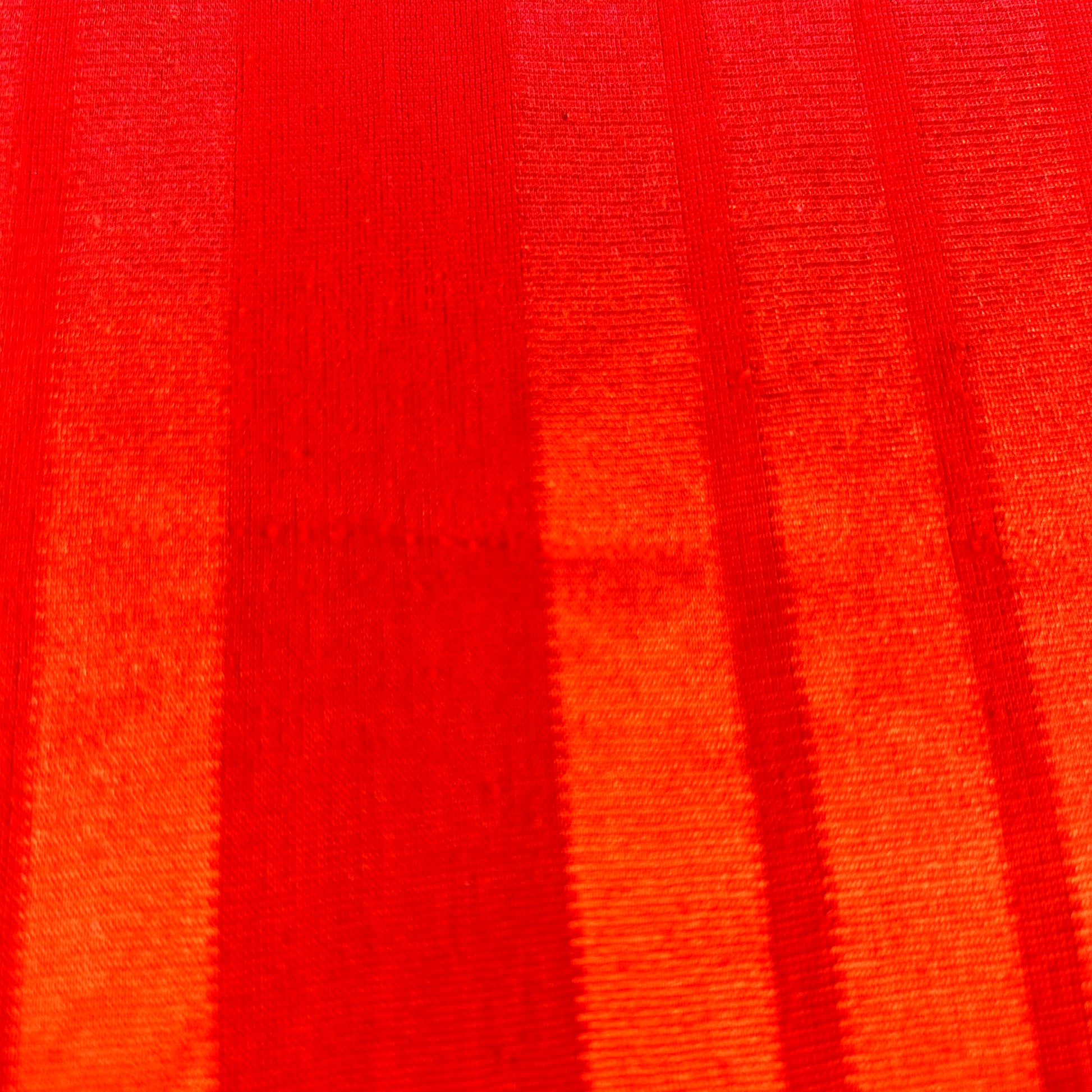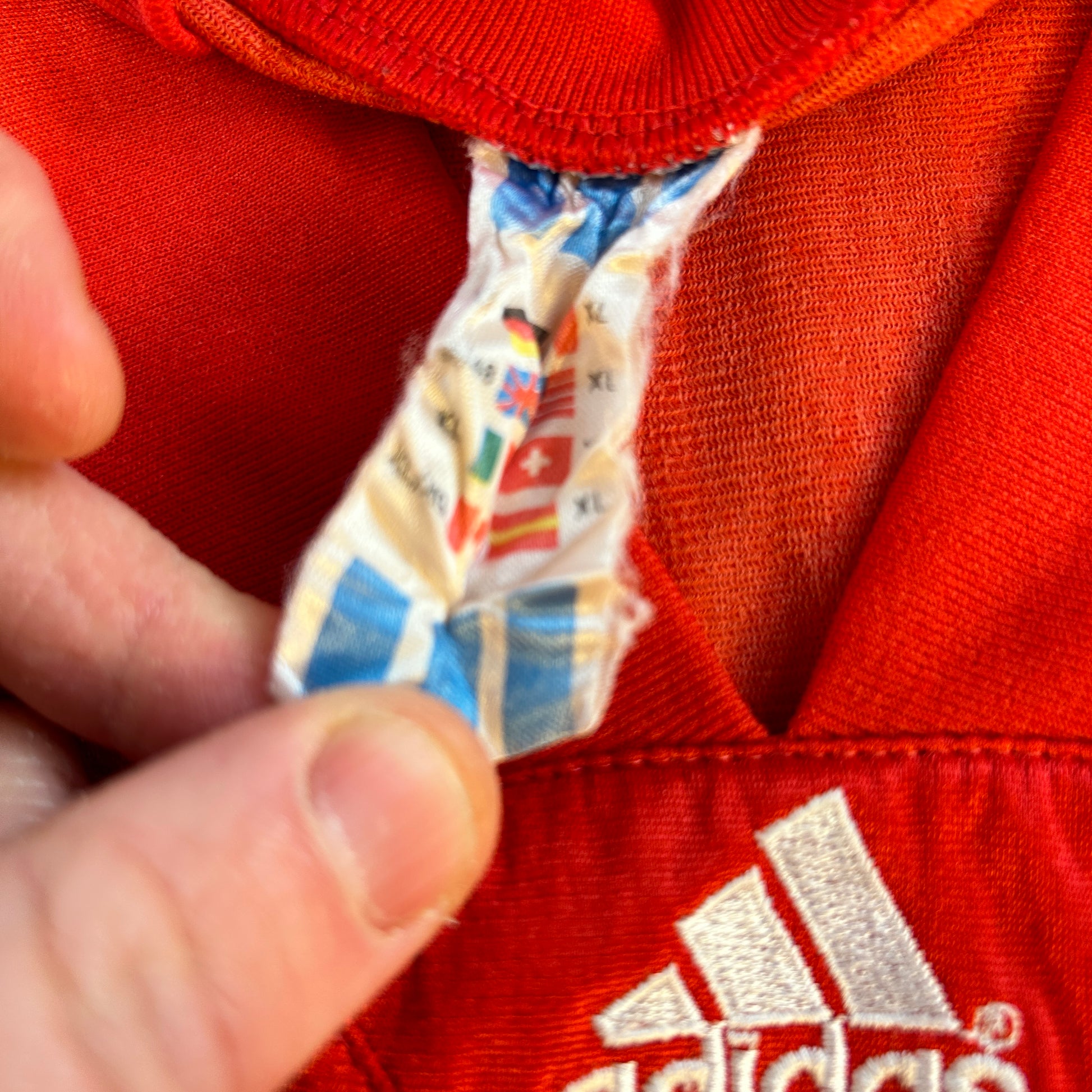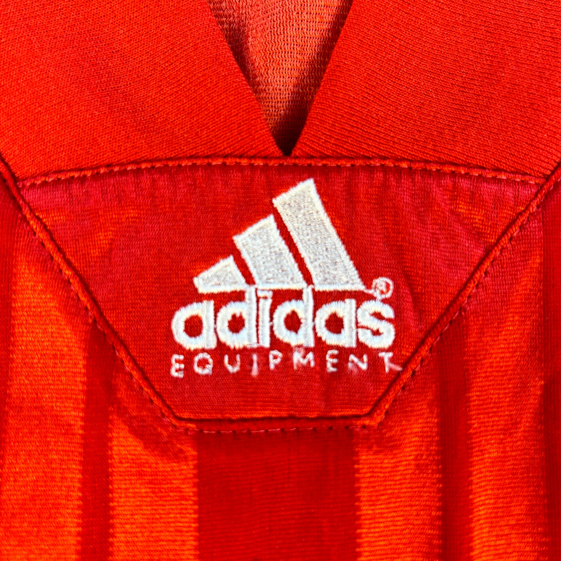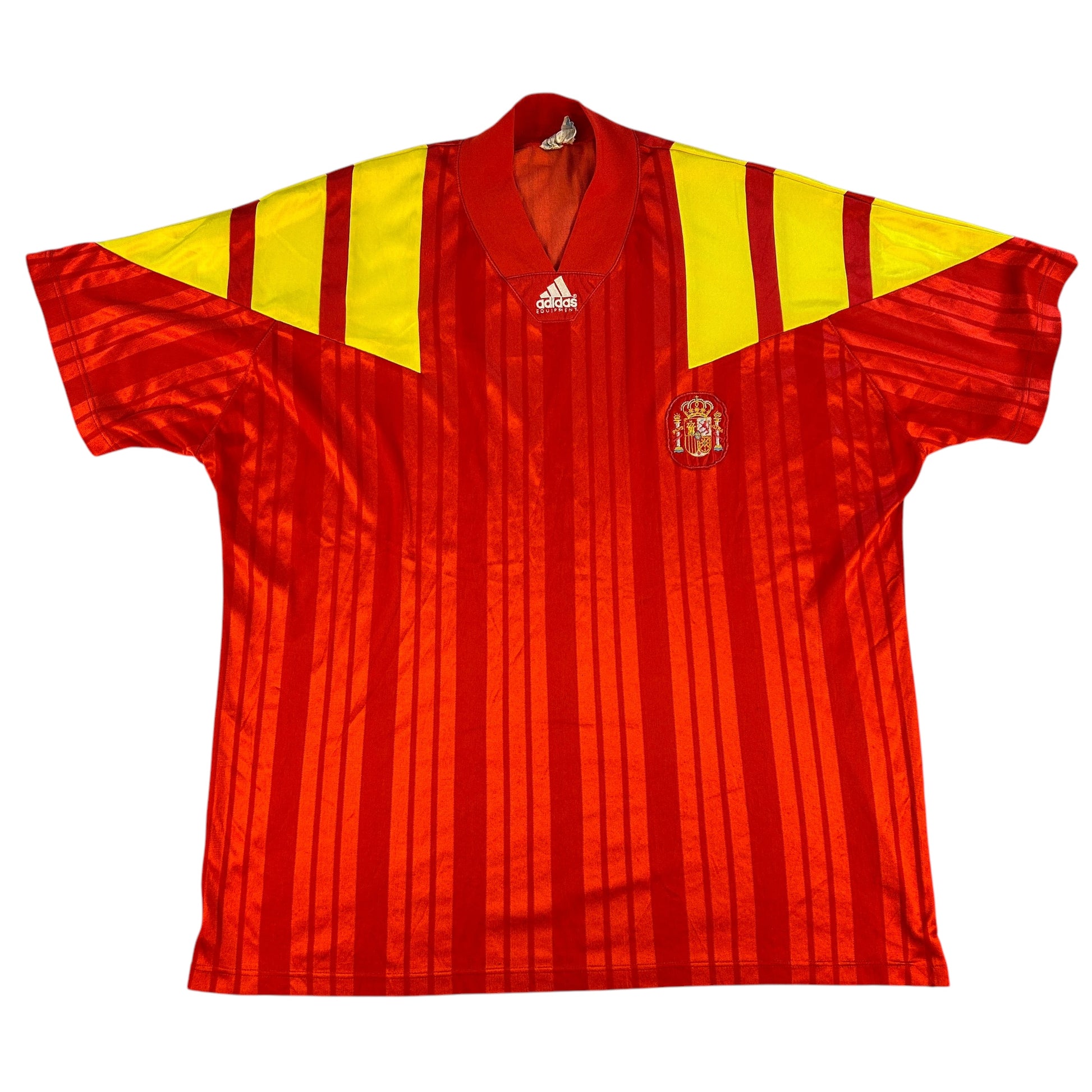 Shirt info: The home shirt for Spain for the 1994 World Cup. A classic design, red with a distinctive blue stripe and 3 yellow Adidas stripes over the shoulders. This was a common template for Adidas teams in 1994 and 1995. The shirt has the embroidered Adidas logo, which is correct for a player-issue shirt. There is no indication this shirt is match worn.