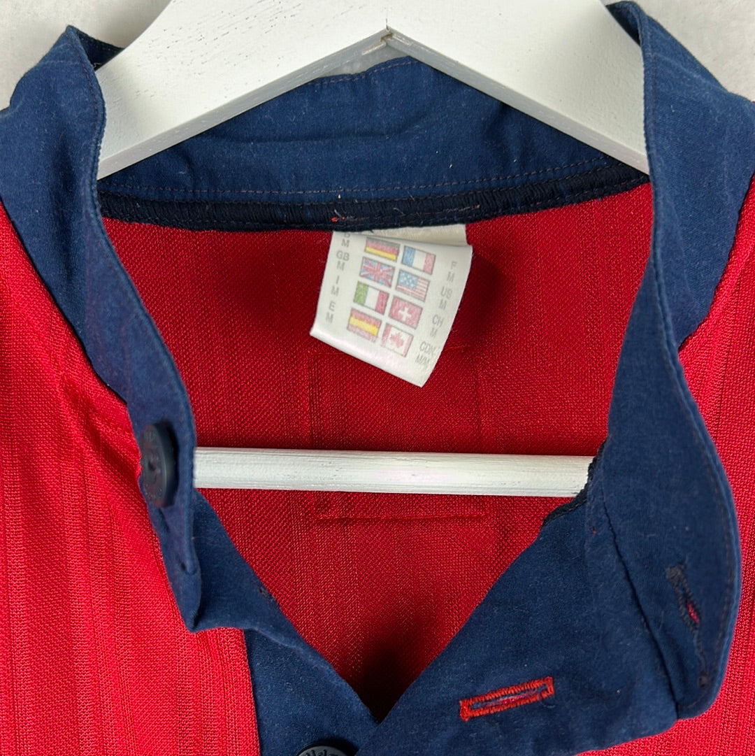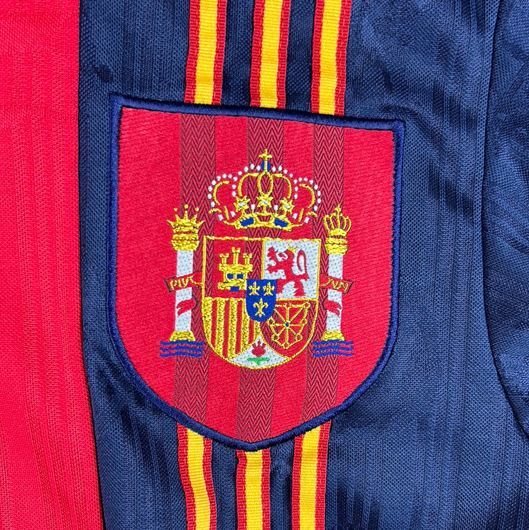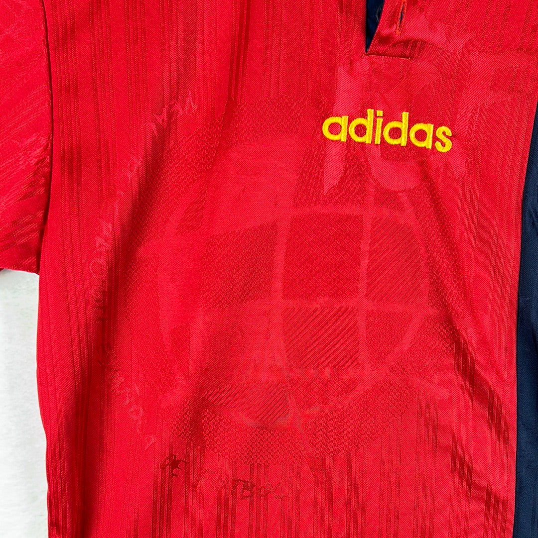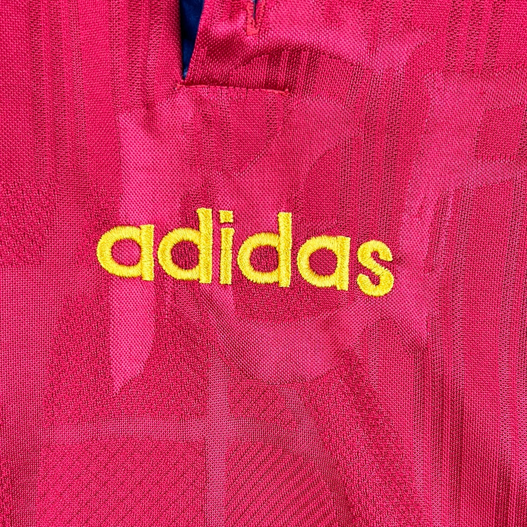 Shirt info: The home shirt for Spain for the 1996 Euros. A classic design, red with a distinctive blue stripe and 3 yellow Adidas stripes over.
