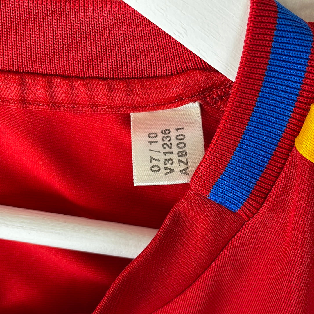 Shirt info: This was the home shirt for Spain in the 2009 season and the 2010 World Cup. It has the Iniesta name print which would have been very popular at the time. The shirt has yellow Adidas stripes on the shoulders and around the sleeves. The Adidas logo is embroidered in yellow and is centered on this shirt, common with this period of Adidas shirts.