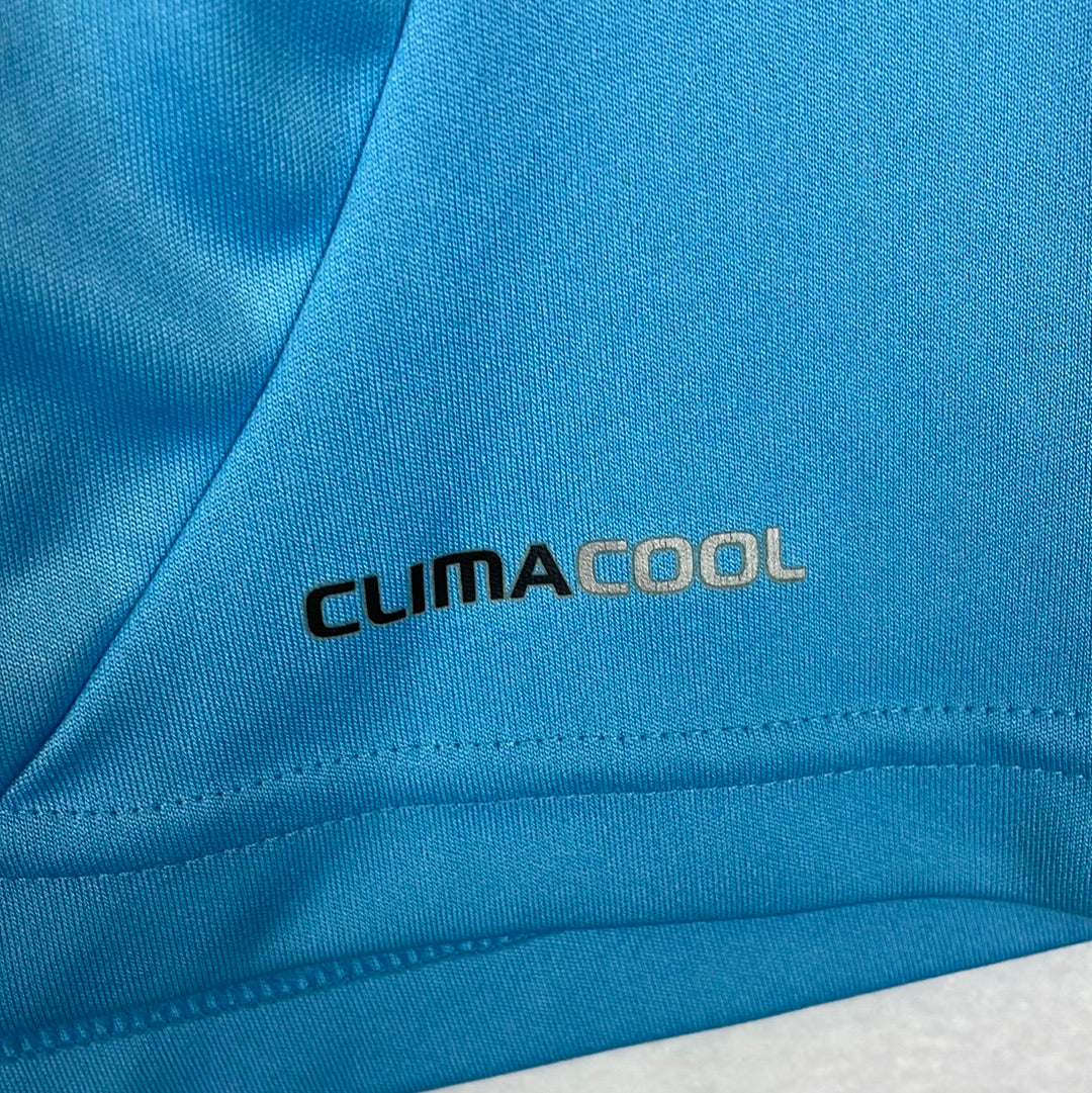 Shirt info: The away shirt for Spain in 2012 & 2013. This is a light blue shirt with a contrasting darker blue sash style design. The sash starts bolder in the top cloner and fades to the bottom corner.