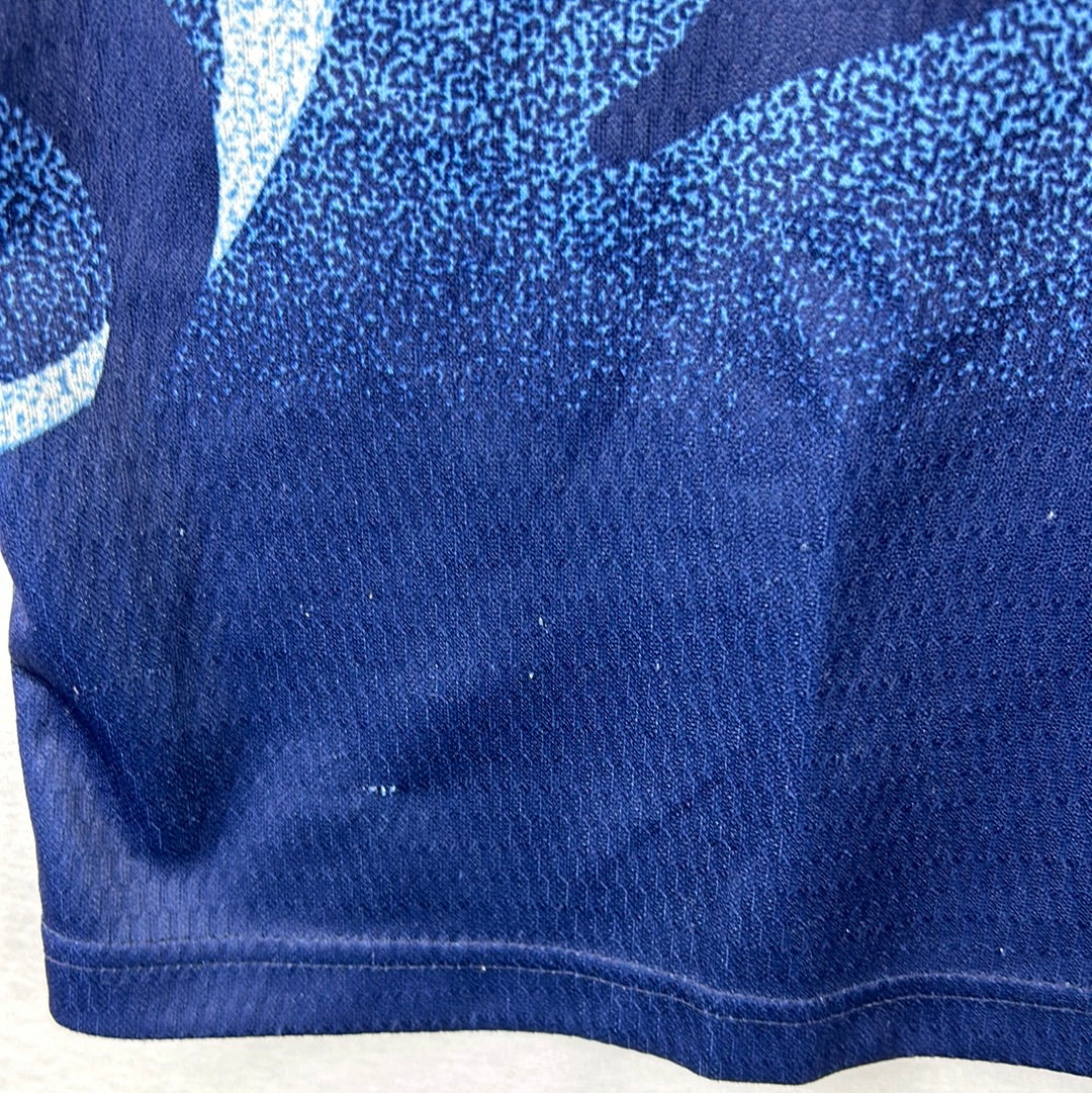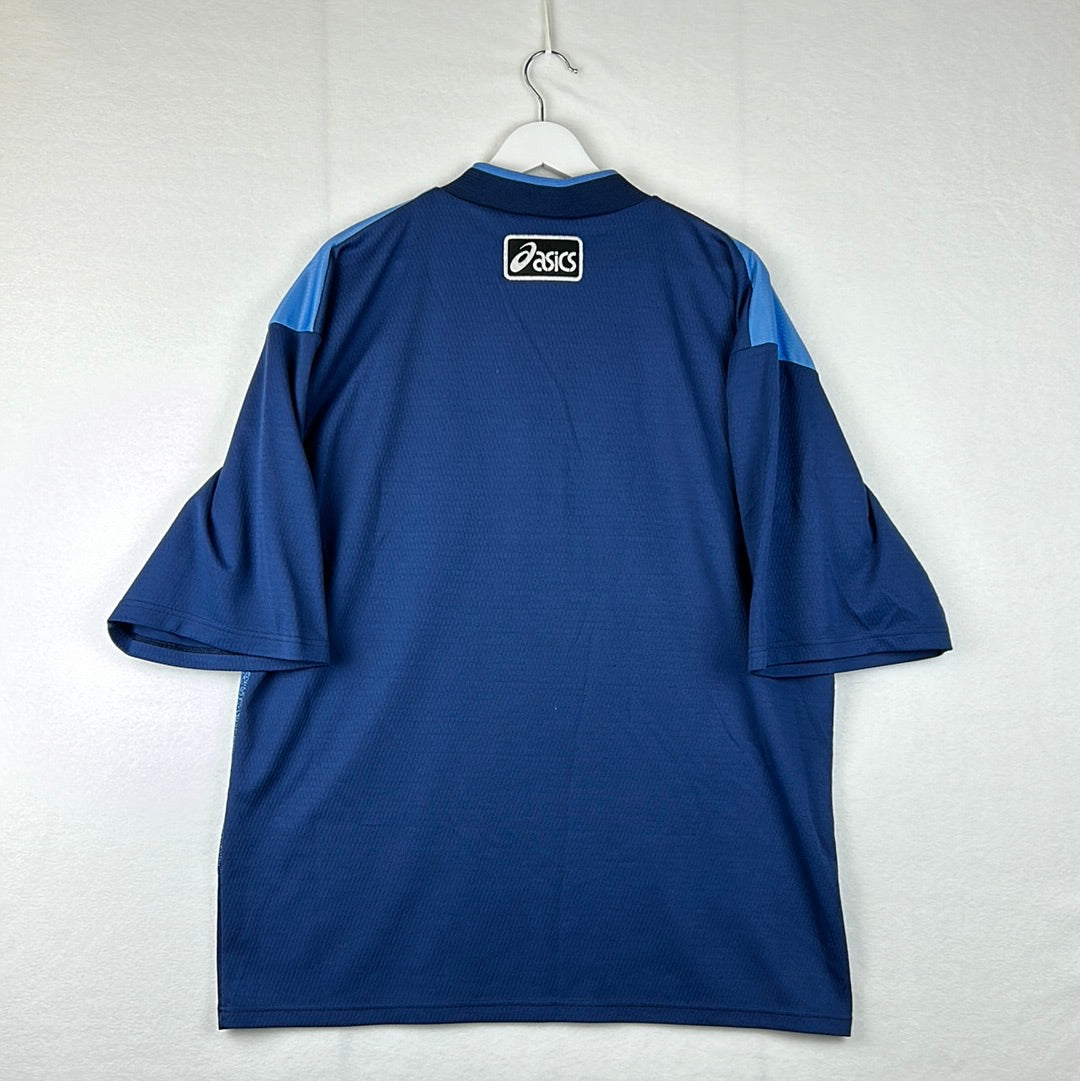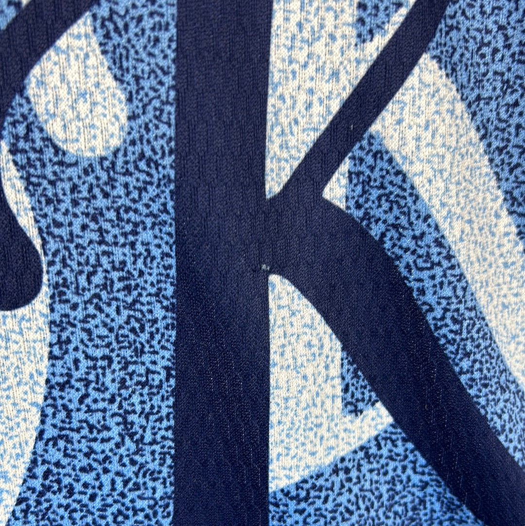 Shirt info: A bold away shirt for Stoke in the 1996/1997 season. Stoke did not have a sponsor this season so just had "STOKE" written across the front of the shirt. The Asics logo is a patch that is on the front and also the back of the neck. The shirt has a 3 button collar in a grandad style.