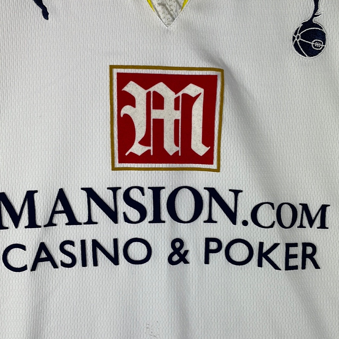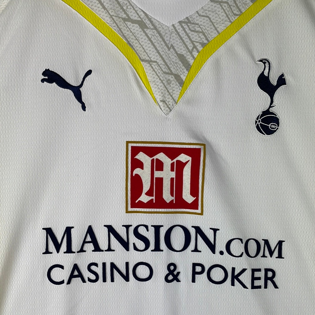 Shirt info: The white home shirt with yellow touches was the home short for Tottenham Hotspur in the 2009/2010 Premier League season. The Puma logo and Tottnehma badge are embroidered on the shirt. The Mansion Casino is a print in felt material.