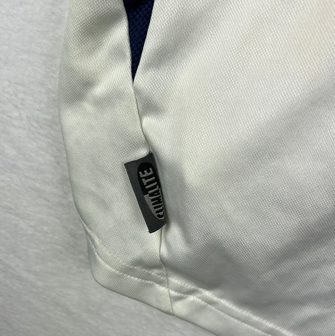 Shirt info: The home shirt for Spurs in the 2001/2002 season. This shirt is white with a dark blue v-neck collar and Adidas stripes.  It was used for 1 season before Spurs moved to Kappa.