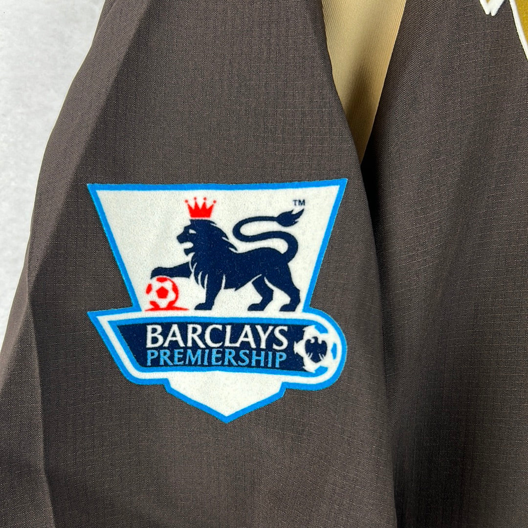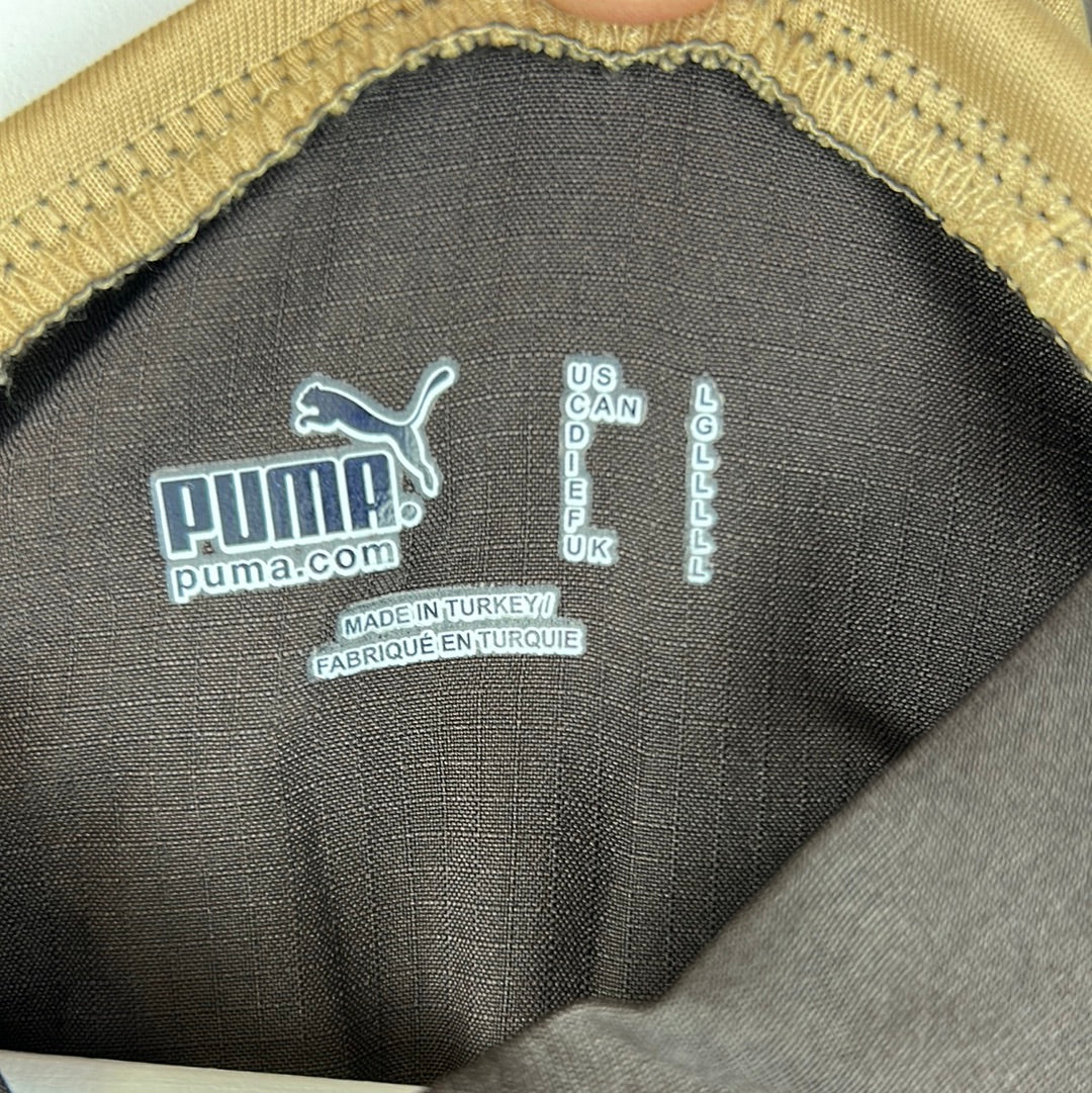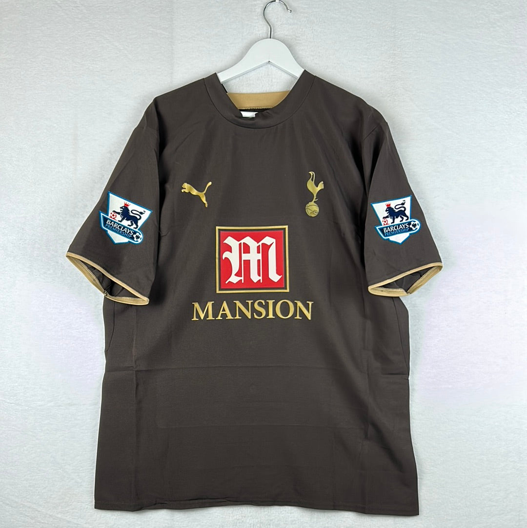 Player Issue Details: A rare brown Puma shirt with the logo and Tottenham badge printed. The Mansion logo is also a print and not a felt style. The print is the correct size for a player's shirt as is the Premier League patch on the sleeve.