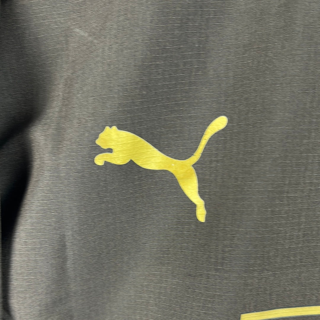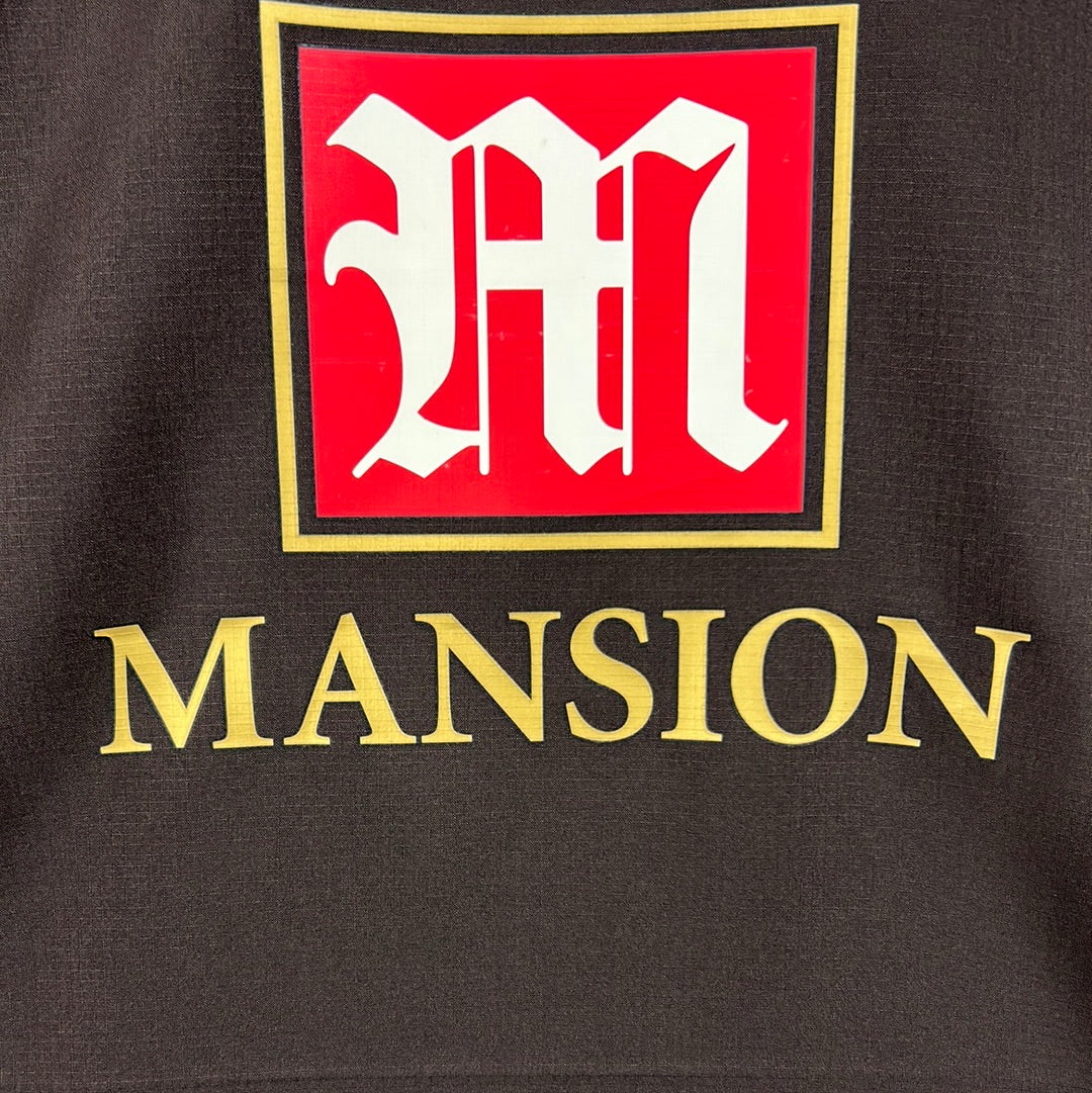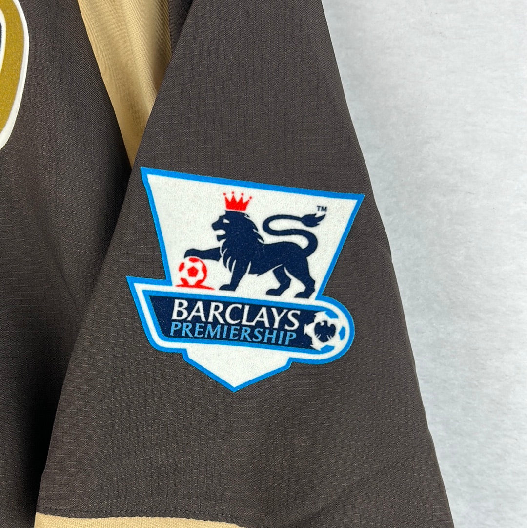 Player Issue Details: A rare brown Puma shirt with the logo and Tottenham badge printed. The Mansion logo is also a print and not a felt style. The print is the correct size for a player's shirt as is the Premier League patch on the sleeve.