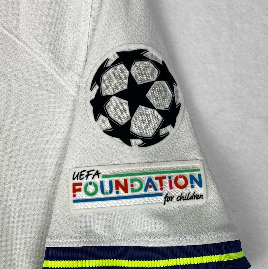 Shirt info: The home shirt for Spurs in the 2022/2023 season. The shirt has a fluorescent trim with "SPURS" on the back of the neck. The shirt has a SON 7 print on the back, and a Champions League patch and UEFA Foundation for children patch.