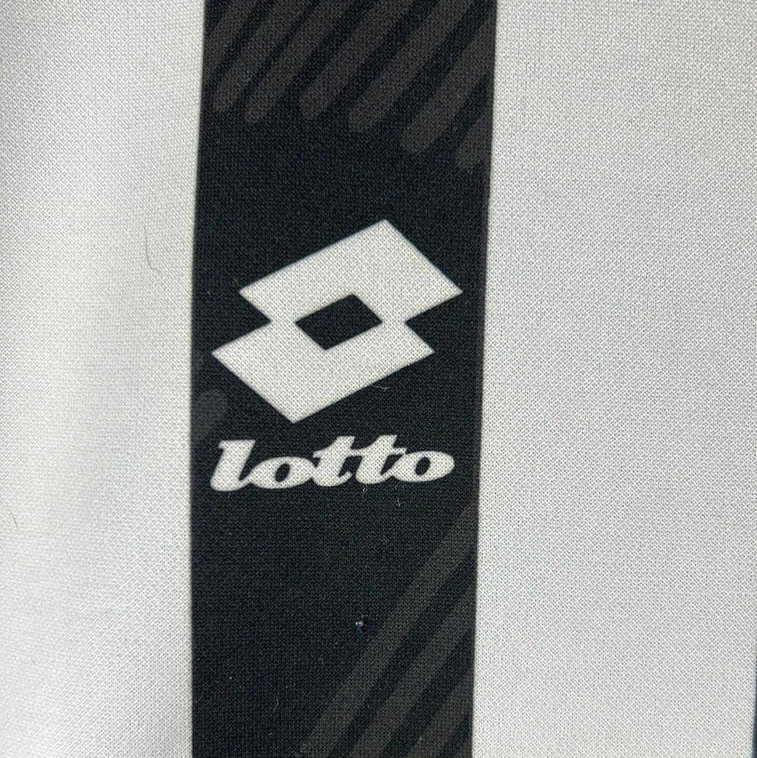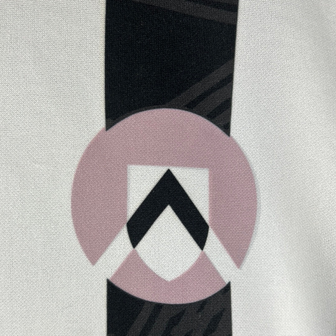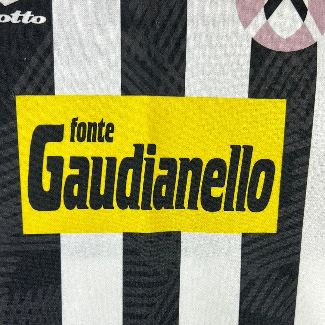 Shirt info: This is the home shirt as worn by Udinese in the Serie A from 1993-1993. The shirt has the black and white Udinese stripes with a sublimated yellow 'Fonte Gaudianello' sponsor, as well as the Udinese badge and the Lotto logo.