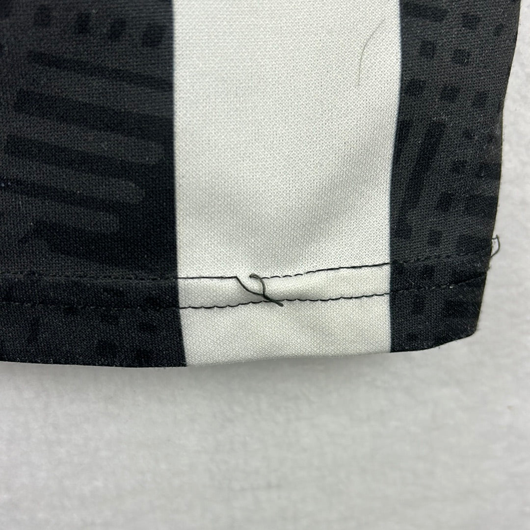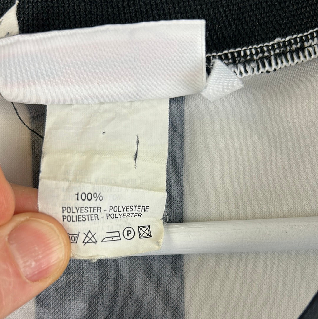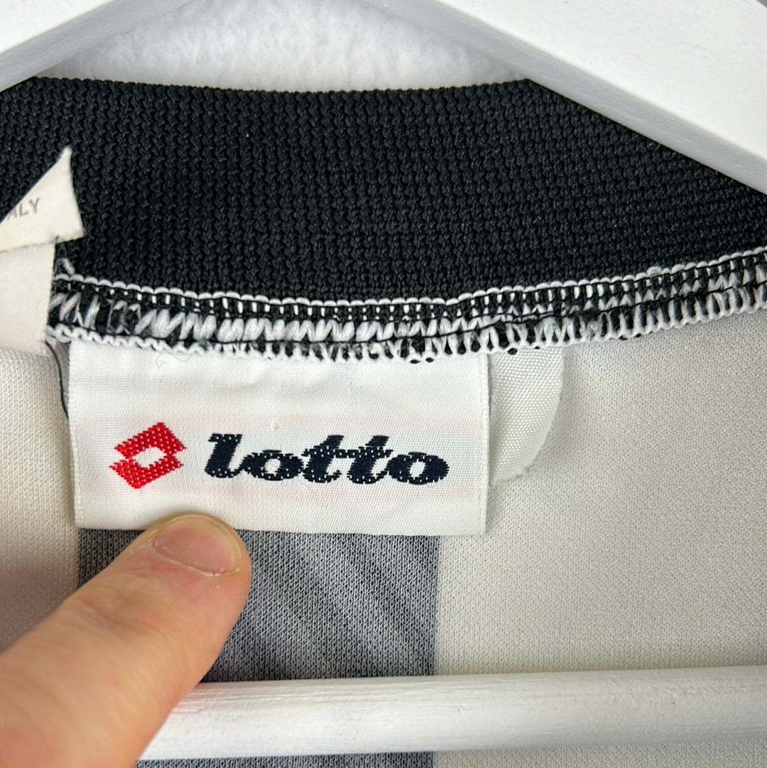 Shirt info: This is the home shirt as worn by Udinese in the Serie A from 1993-1993. The shirt has the black and white Udinese stripes with a sublimated yellow 'Fonte Gaudianello' sponsor, as well as the Udinese badge and the Lotto logo.